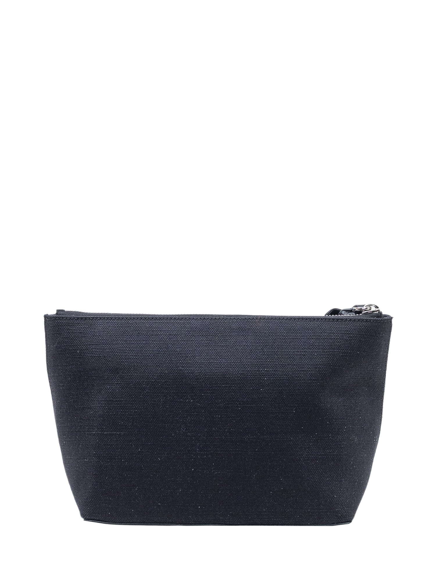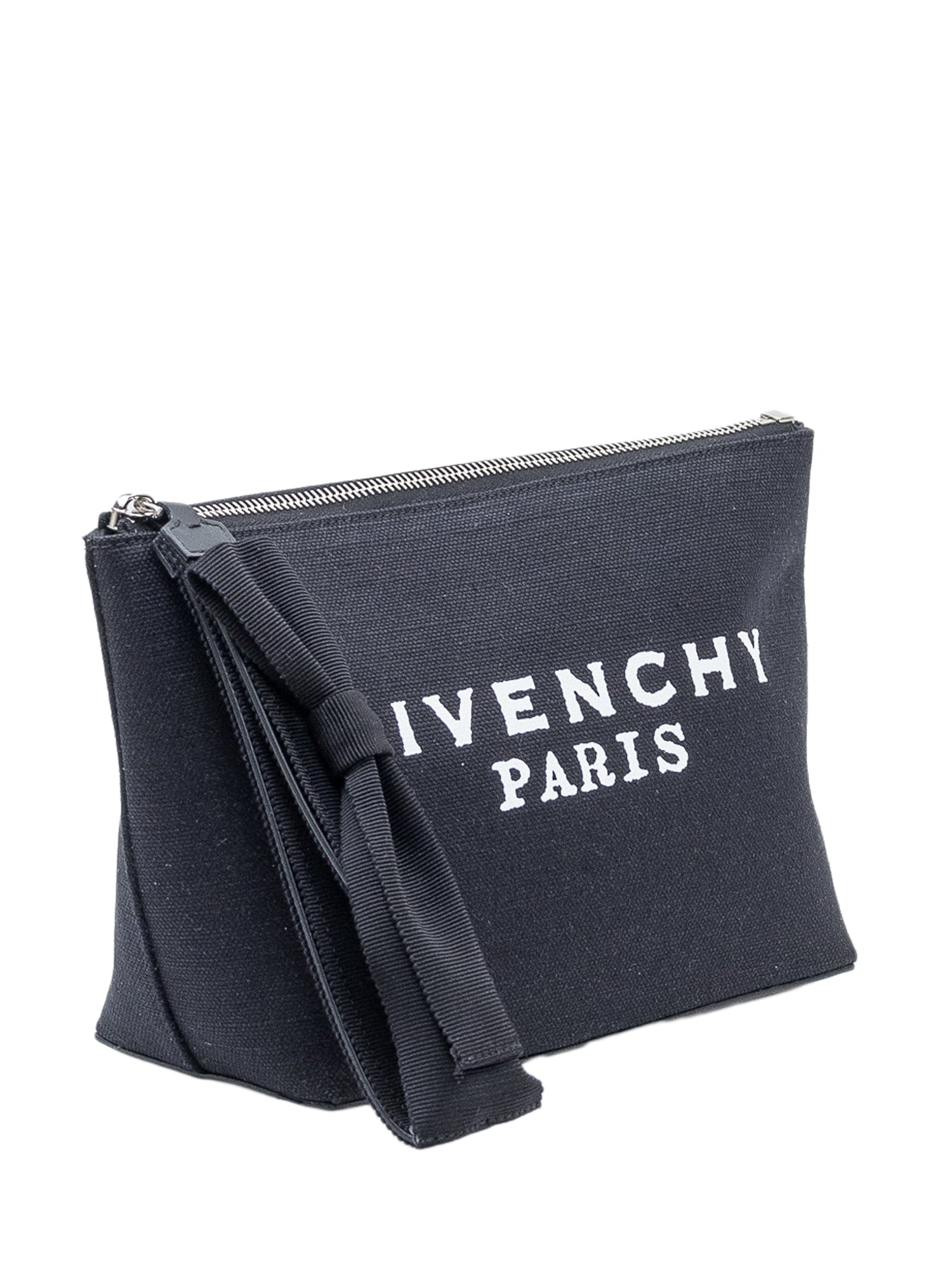 Pochette in tessuto con chiusura superiore a zip e fiocco applicato al cursore.