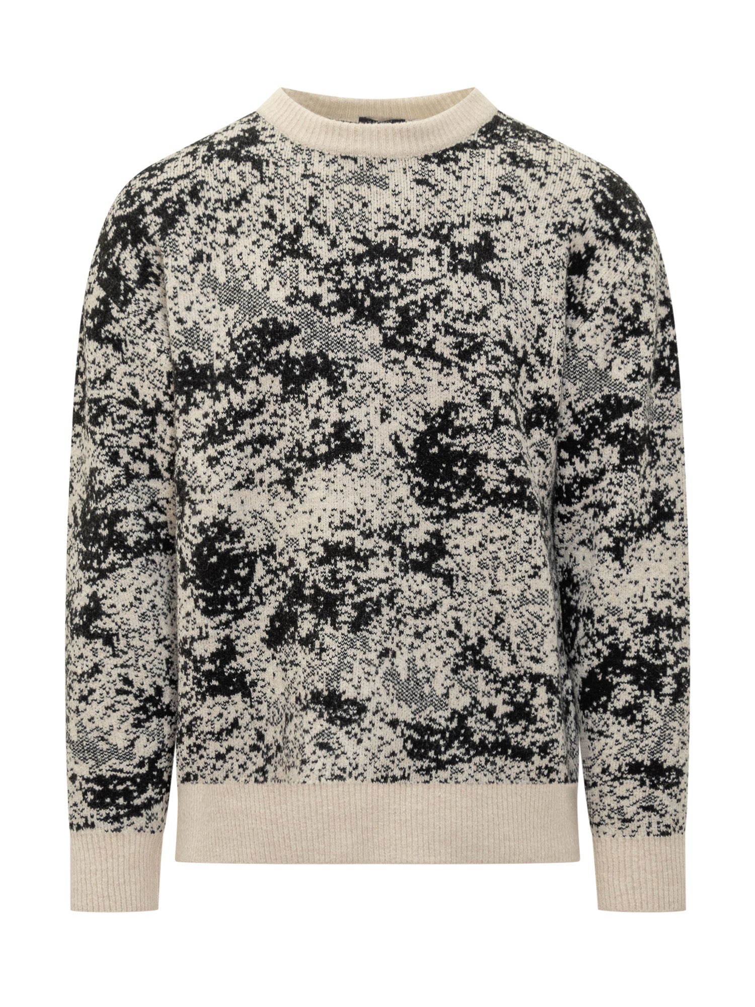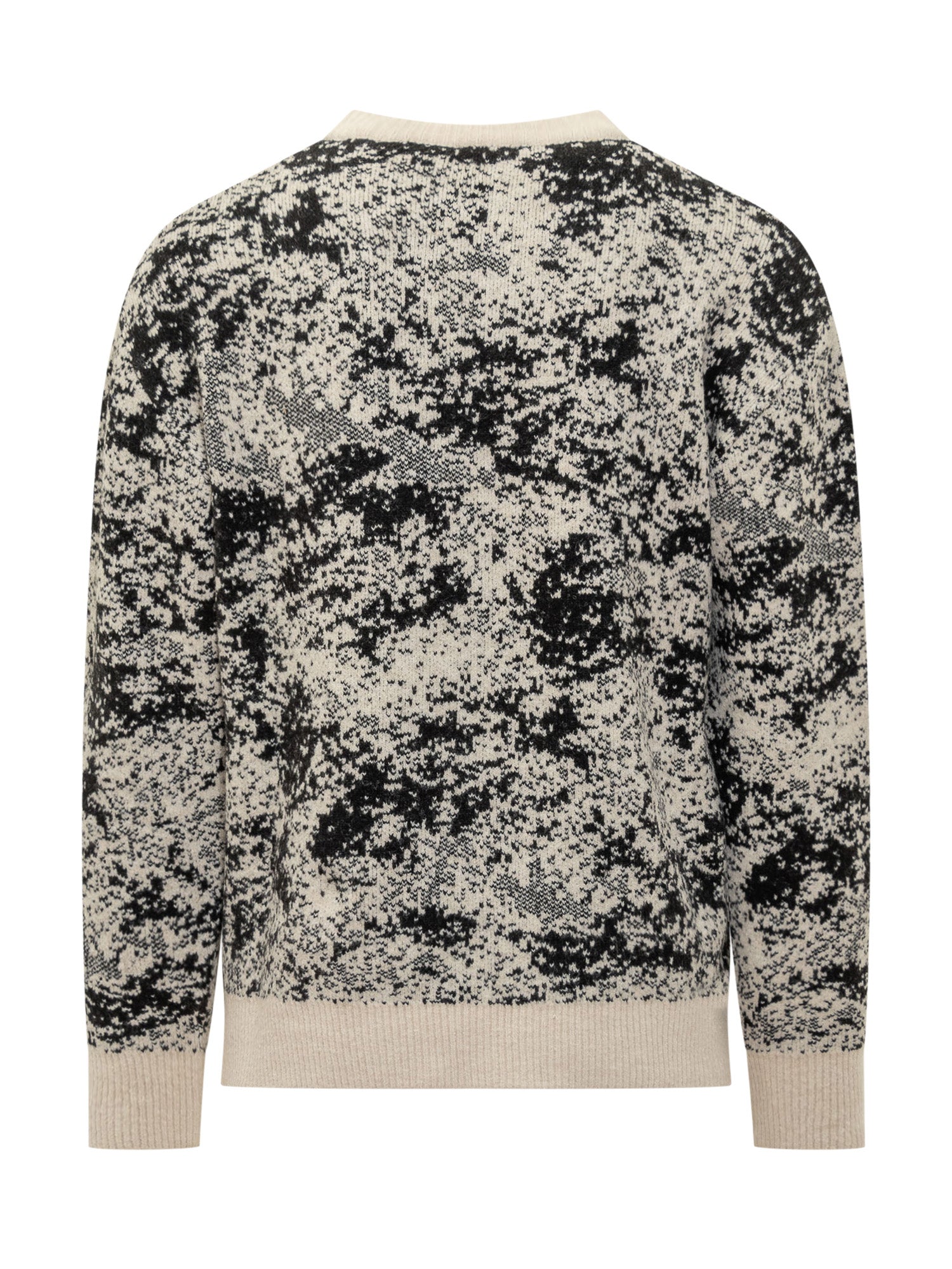 Maglione Hosio in lana con motivo astratto bianco e nero. Linea regolare e dettagli a coste su collo, polsini e fondo.