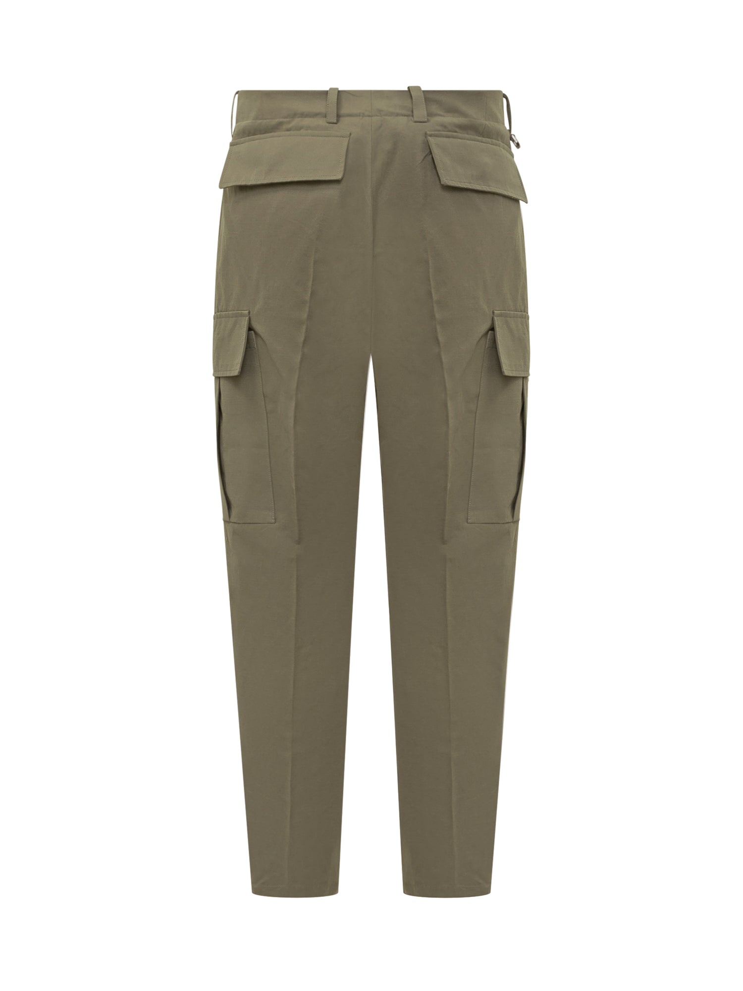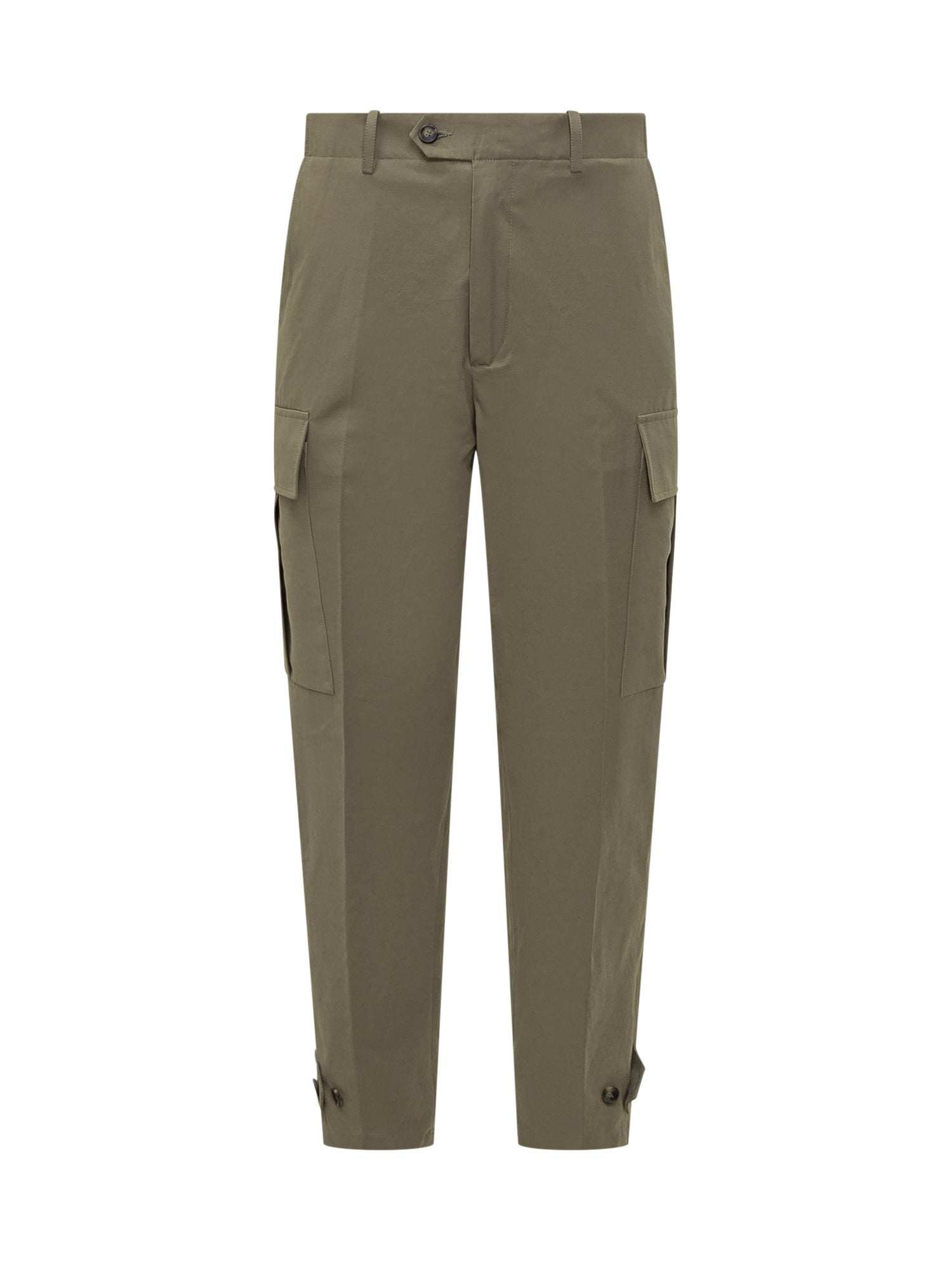 Pantaloni cargo Hosio in tessuto tecnico verde con tasche laterali, chiusura a bottone e dettagli con alamari alle caviglie.