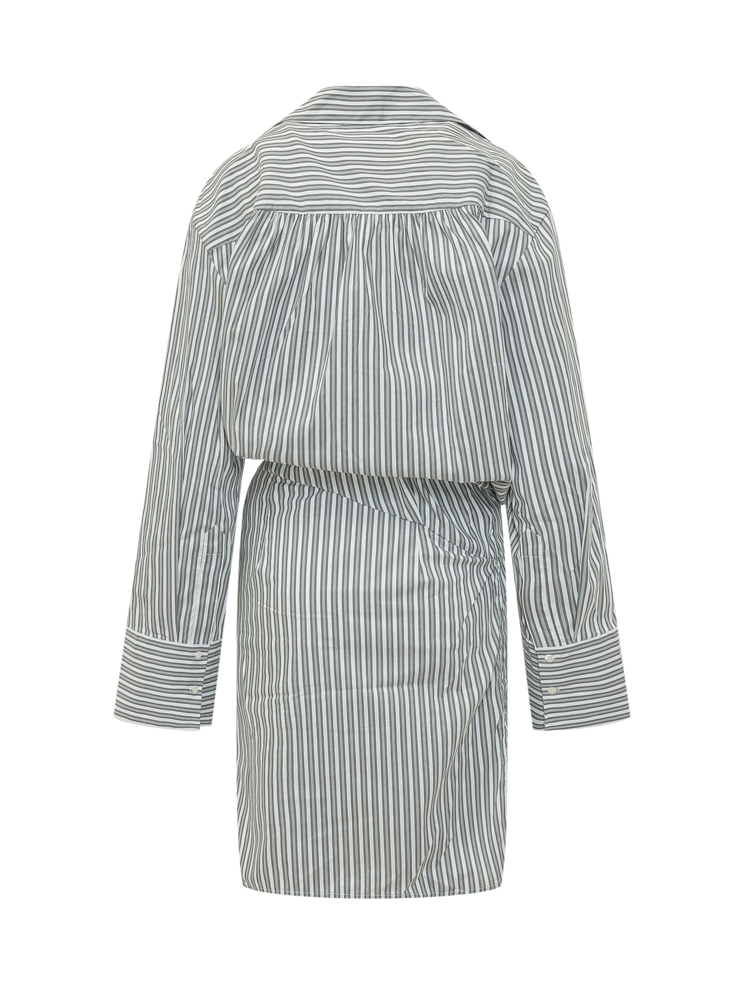 Abito corto in popeline a righe con silhouette avvolgente e scollo incrociato. Colletto classico, taschino sul petto e polsini definiti.
