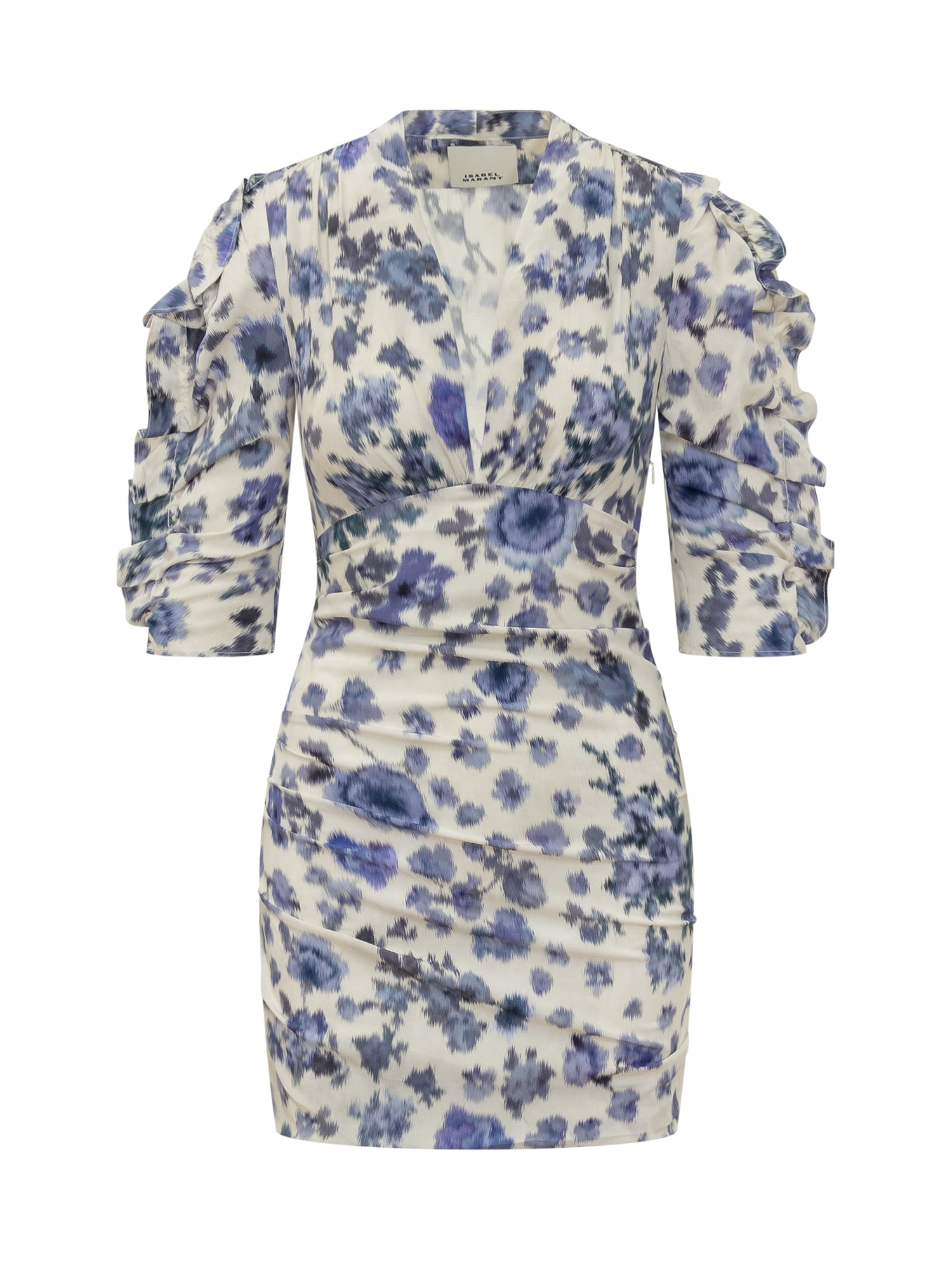 Abito Doris Gb corto con stampa sfumata, scollo profondo e maniche arricciate. La silhouette drappeggiata esalta le forme e dona un look elegante e moderno.