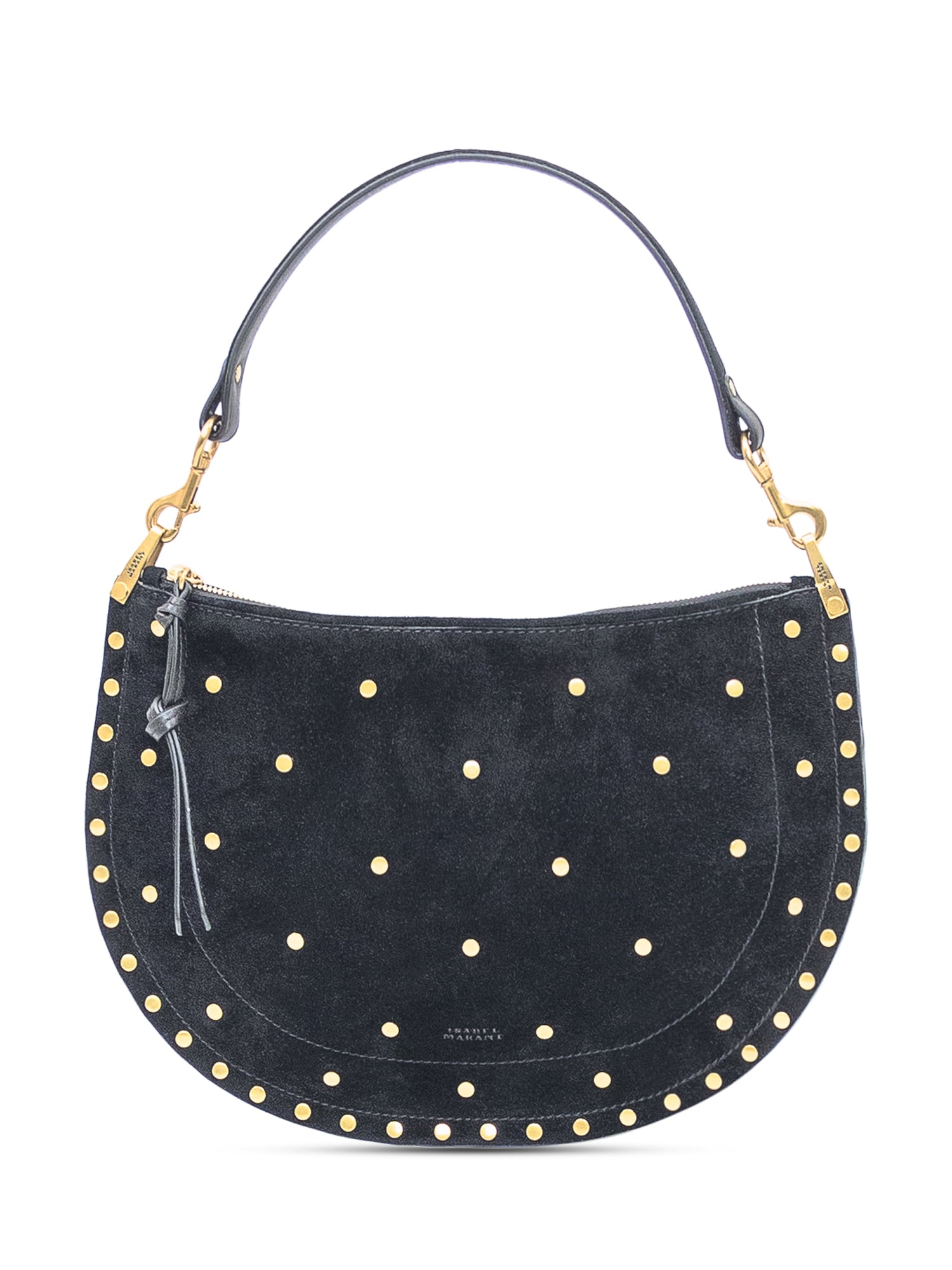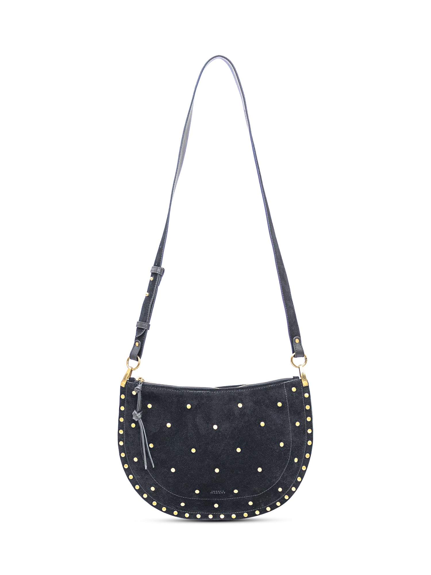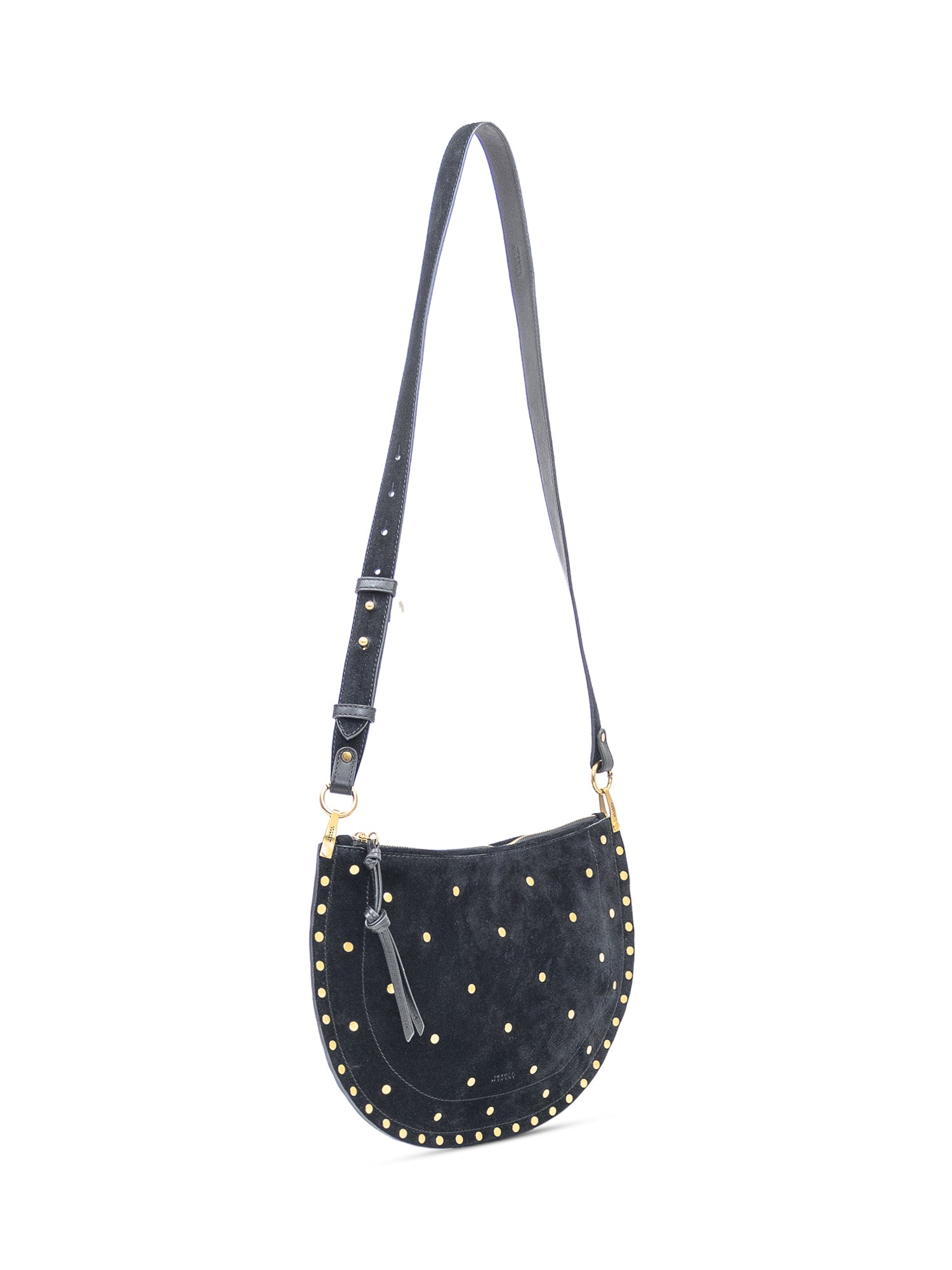 Borsa in pelle scamosciata con forma a mezzaluna, dettagli borchiati e tracolla regolabile. Zip superiore, profilo morbido e stile iconico Isabel Marant.