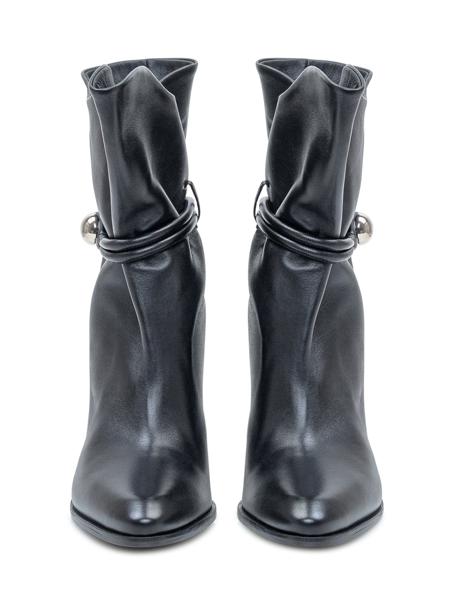 Stivaletti Isabel Marant Lolya-GD in pelle nera con tacco a spillo e cinturino con dettaglio sfera metallica. Design elegante e contemporaneo.