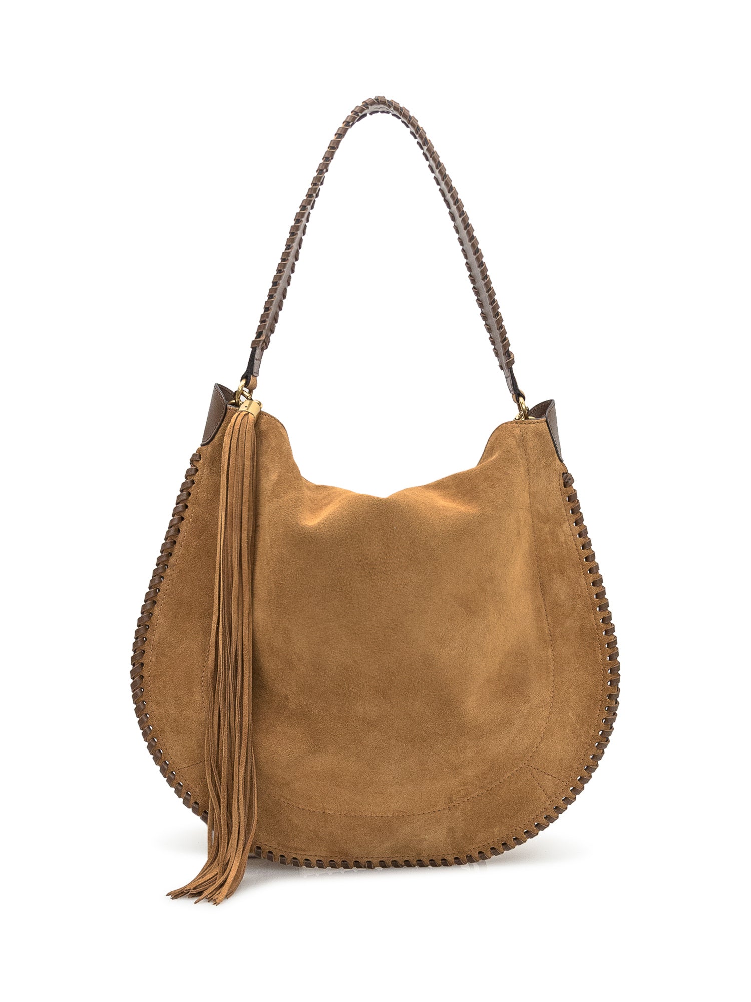 Borsa a spalla in suede con cuciture intrecciate e maxi frangia laterale.Dimensioni: 43x40x10