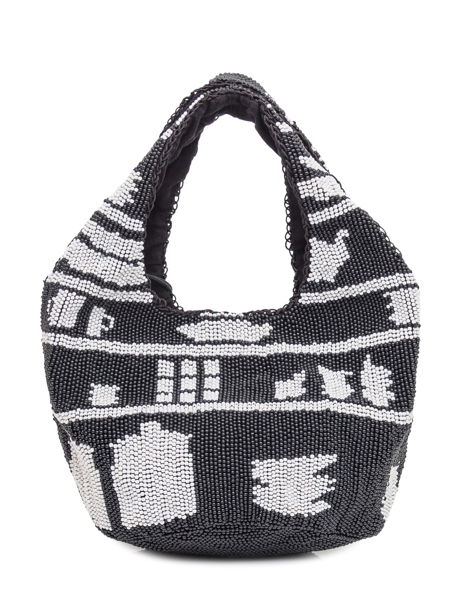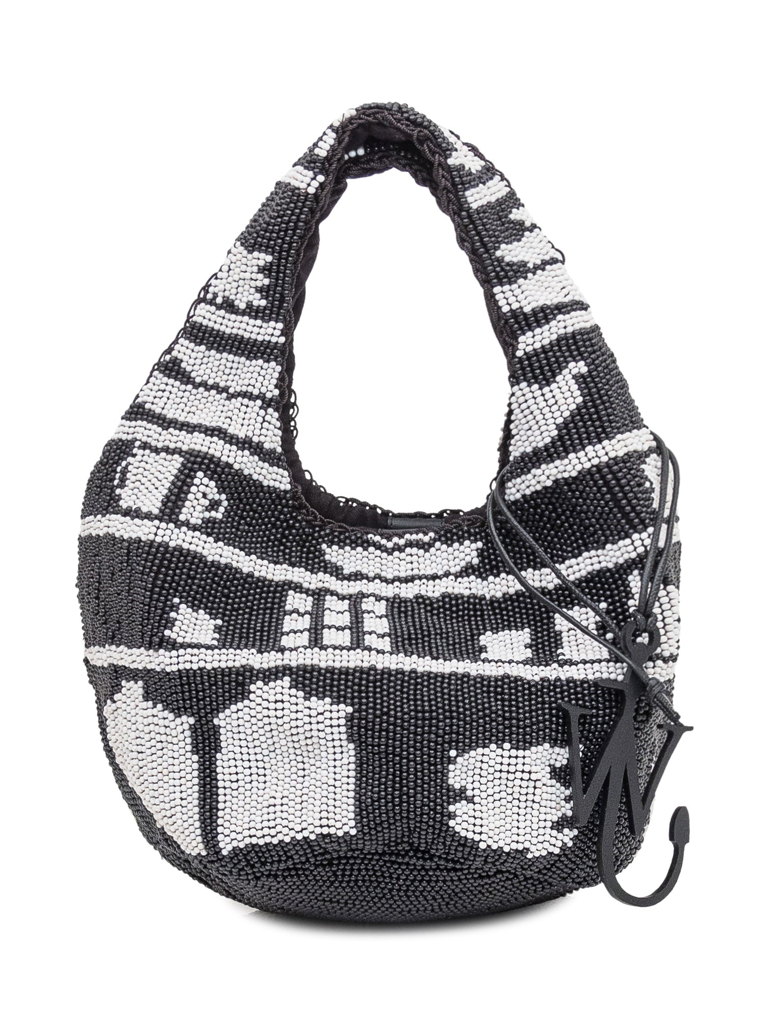 Borsa tote JW Anderson decorata con perline nere e bianche a motivo grafico. Logo àncora in metallo, manico corto e silhouette morbida.
