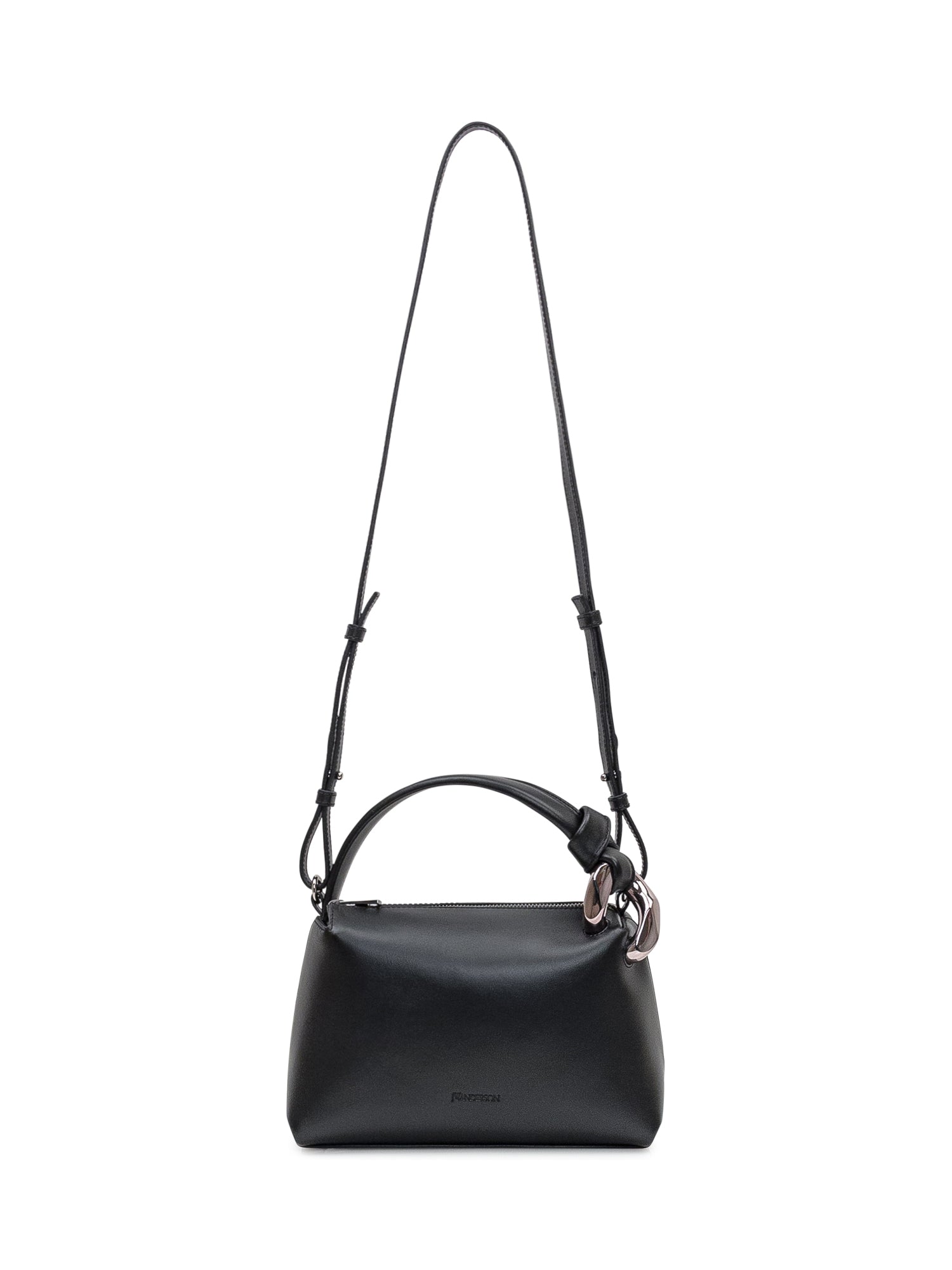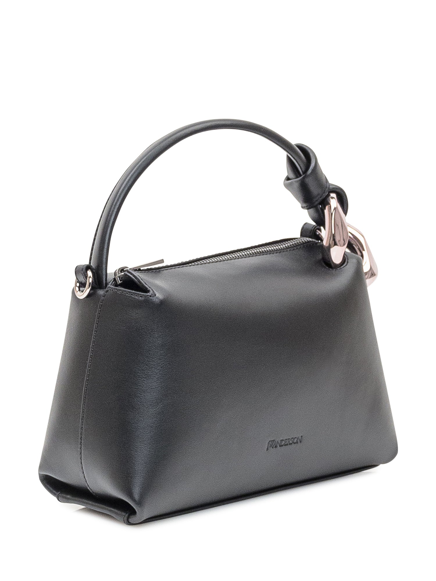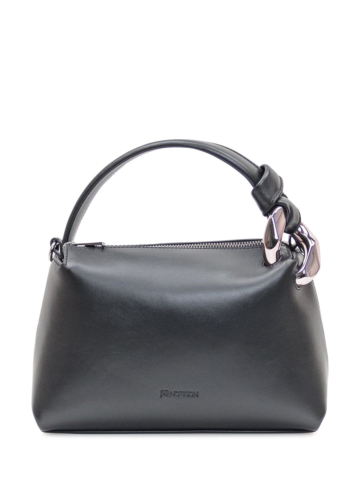 Borsa a mano in pelle con silhouette compatta e dettaglio metallico scultoreo. Interno funzionale con chiusura zip.