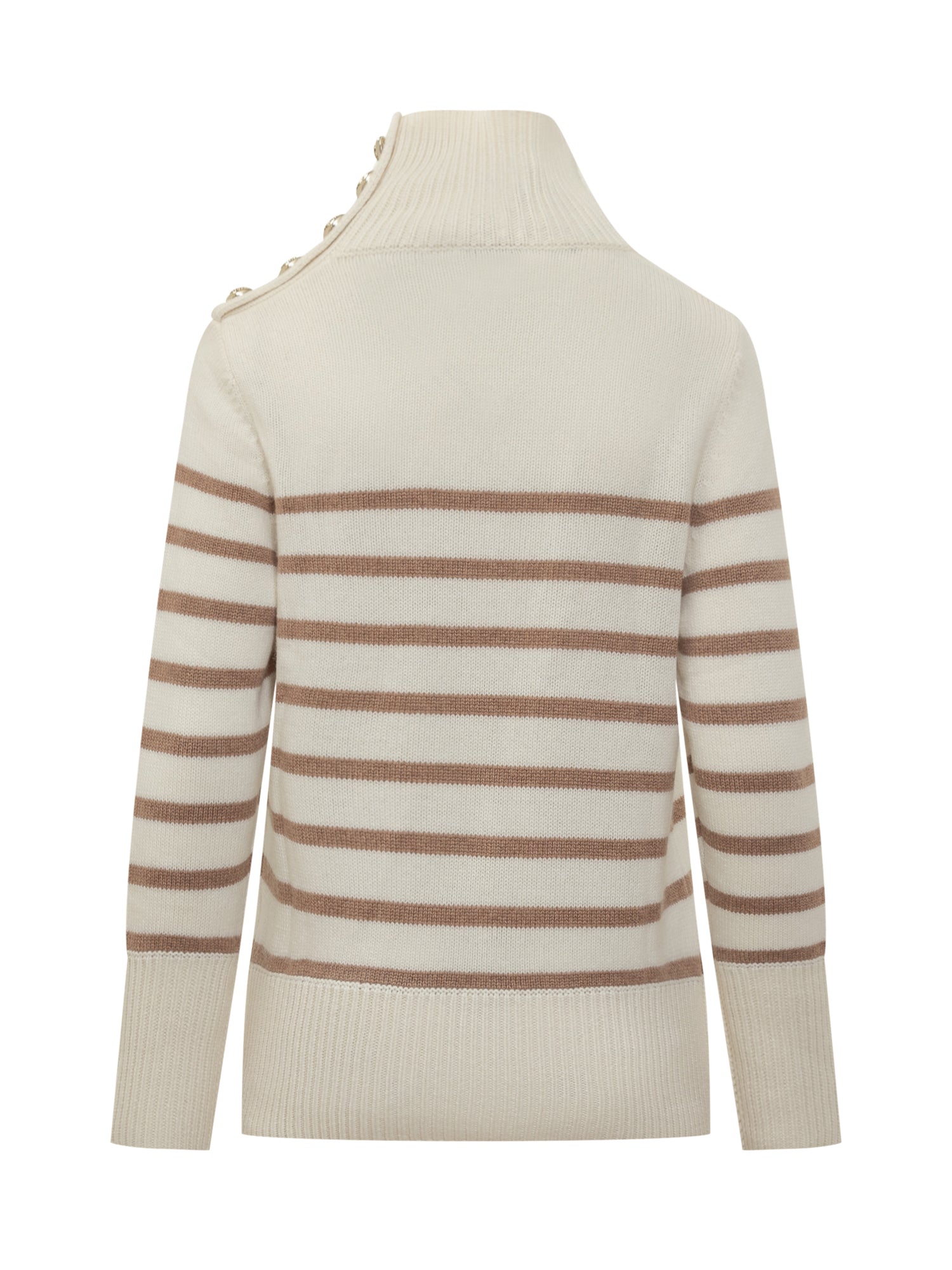 Maglione Kujten in morbido cashmere color panna con righe beige e bottoni dorati sulla spalla.