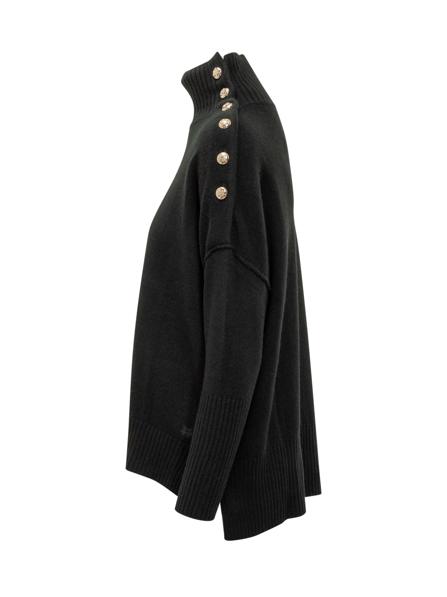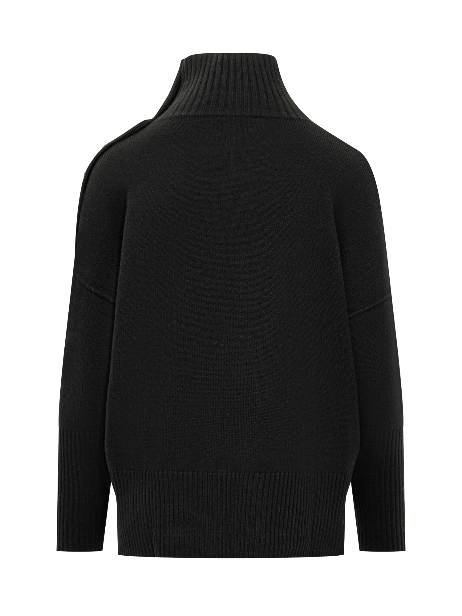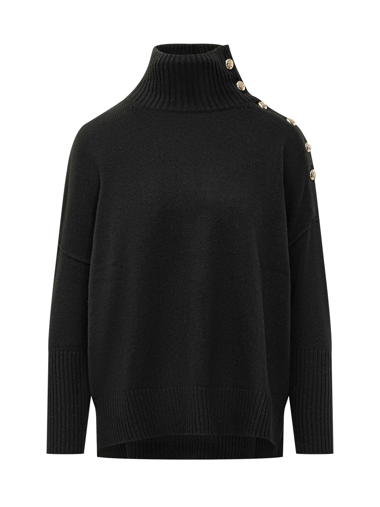 Maglione Kujten in puro cashmere nero con collo alto e dettaglio di bottoni dorati sulla spalla.