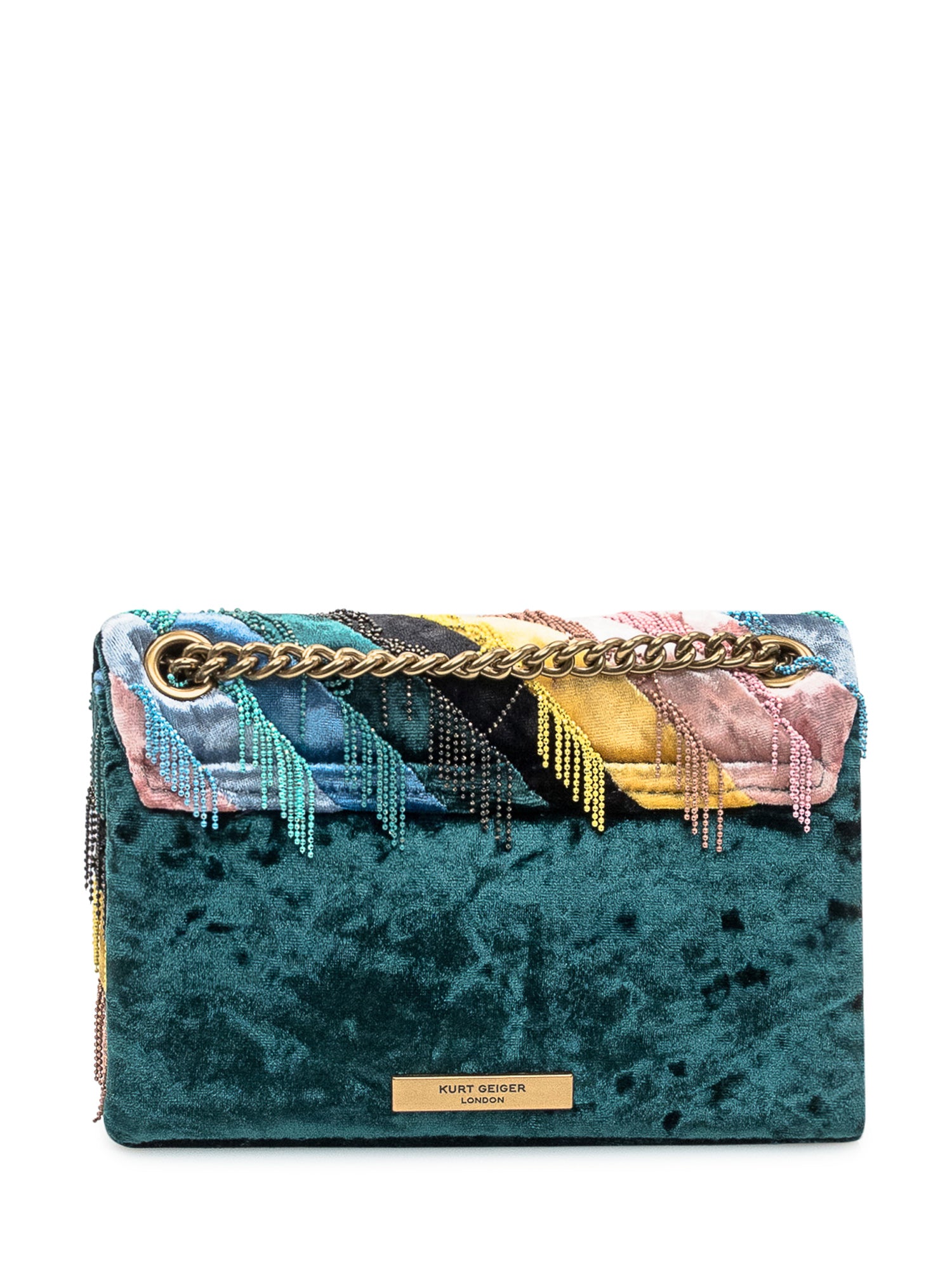 Borsa Mini Kensington Kurt Geiger con frange e perline multicolor, chiusura con iconico logo aquila e tracolla a catena.