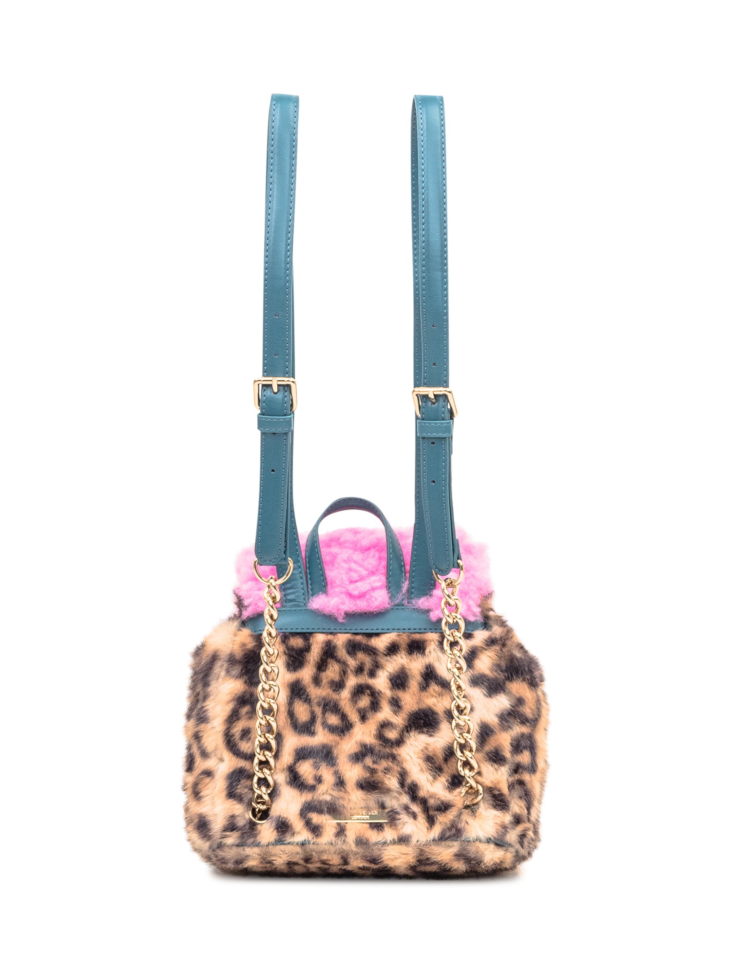 Zaino Kurt Geiger in pelliccia ecologica con patchwork multicolor rosa, arancio e azzurro. Dettagli animalier, chiusura con fibbia e iconico logo con testa d aquila.