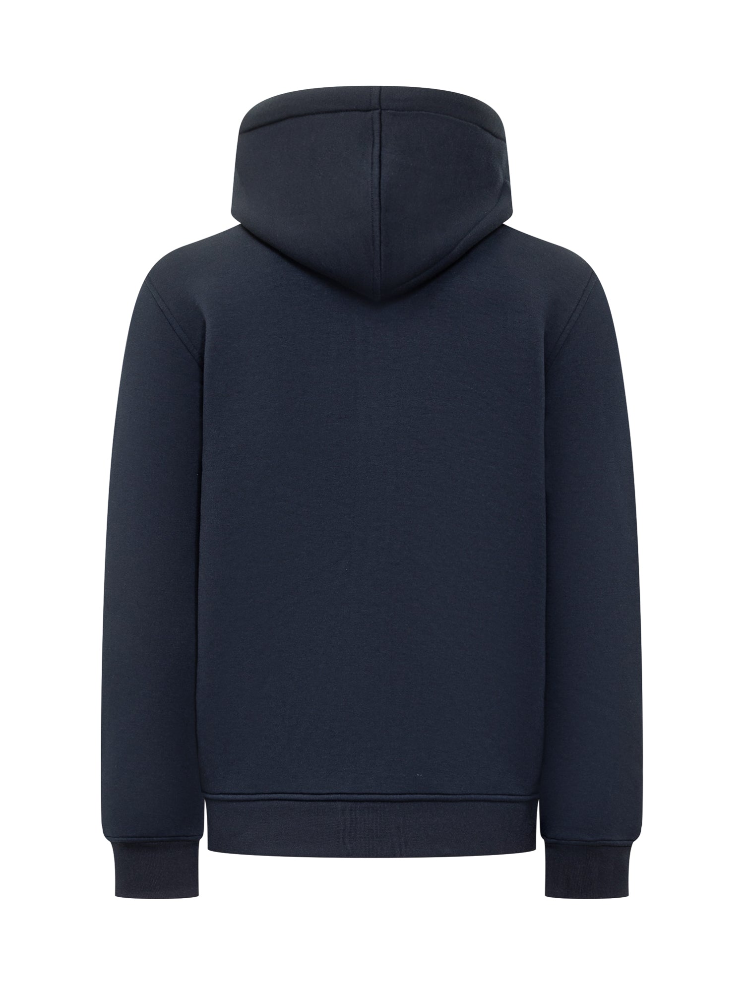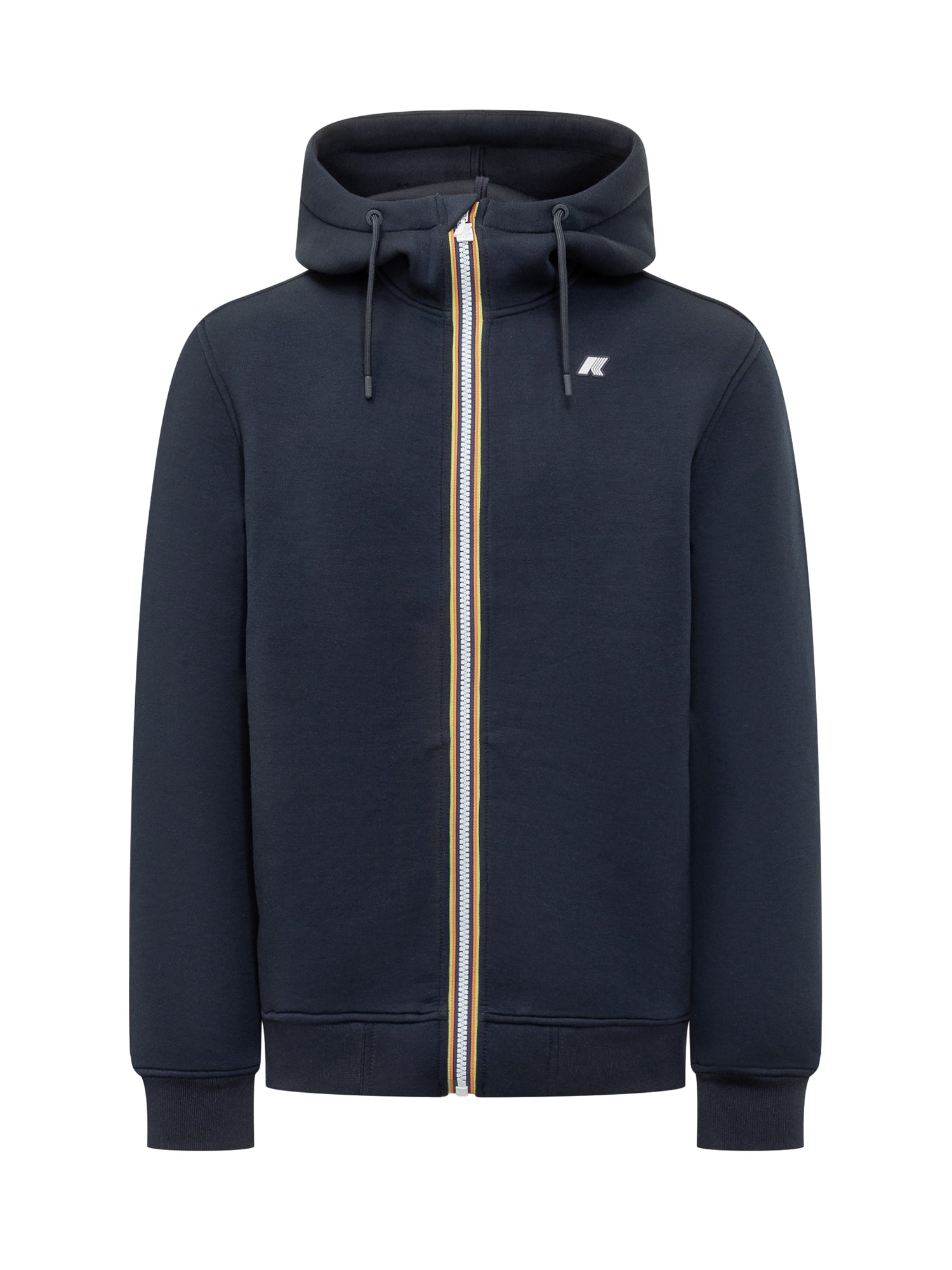 Felpa K-Way in cotone blu con cappuccio regolabile e zip multicolor iconica. Rifinita con logo sul petto e dettagli elasticizzati.