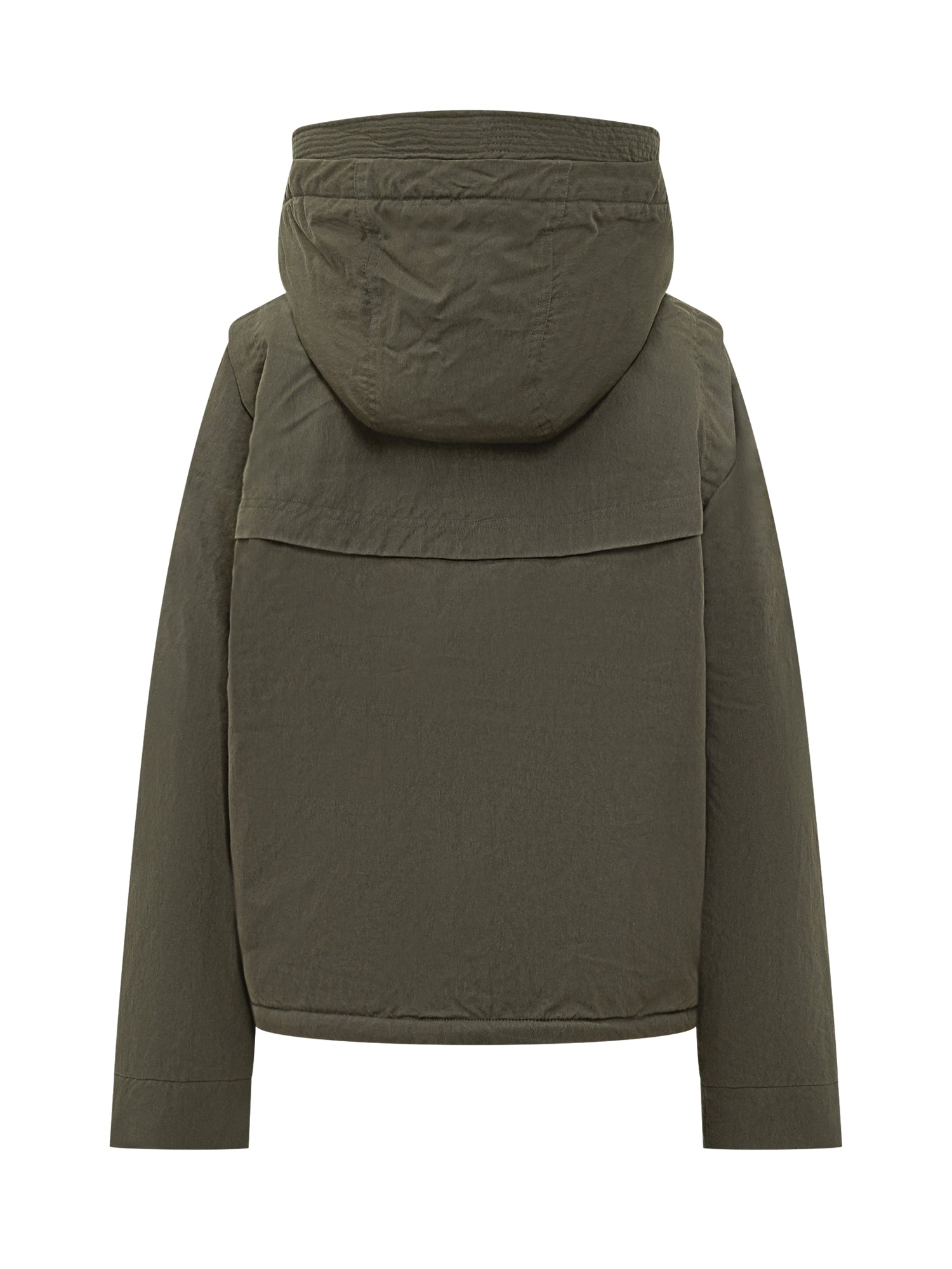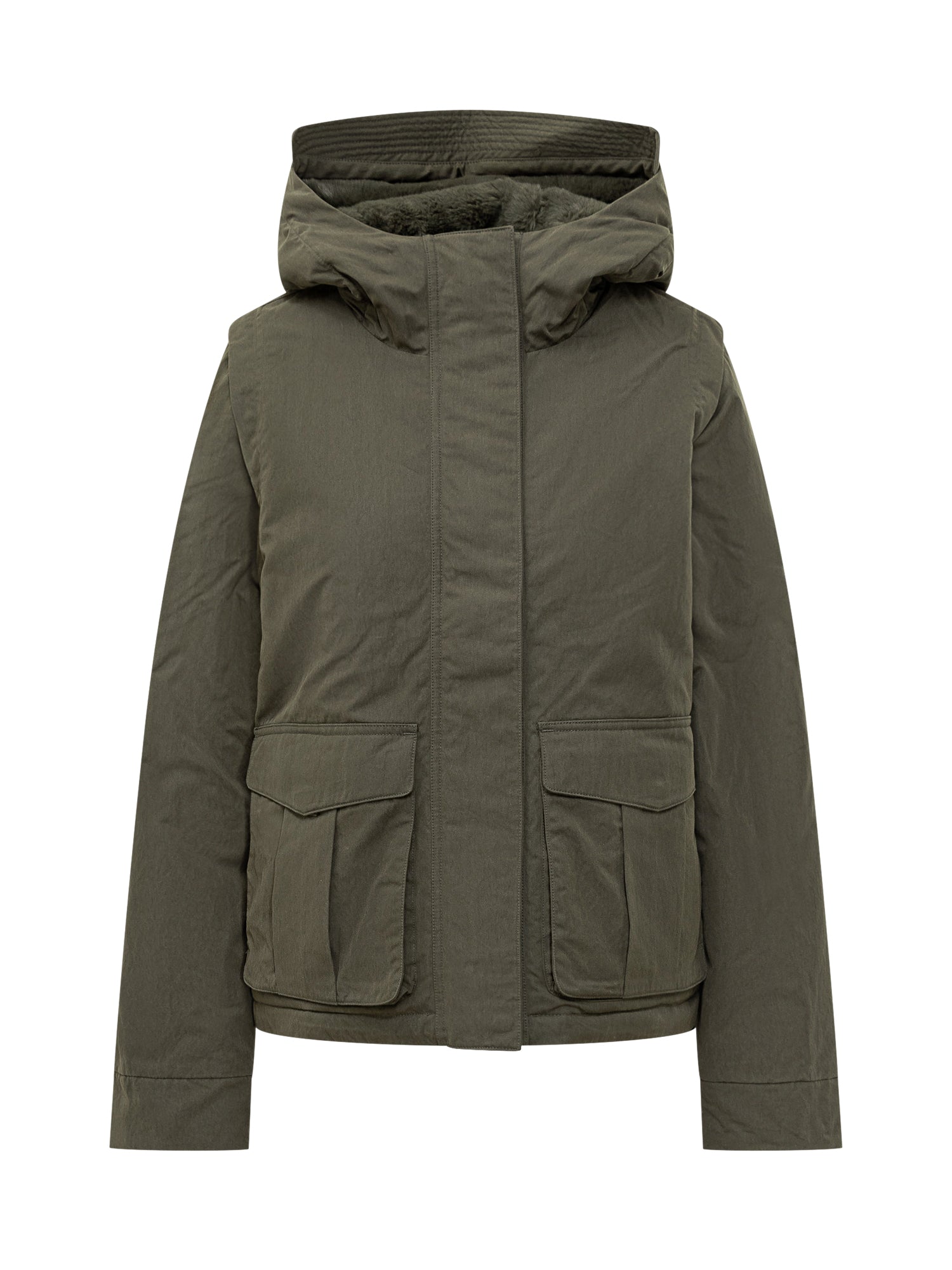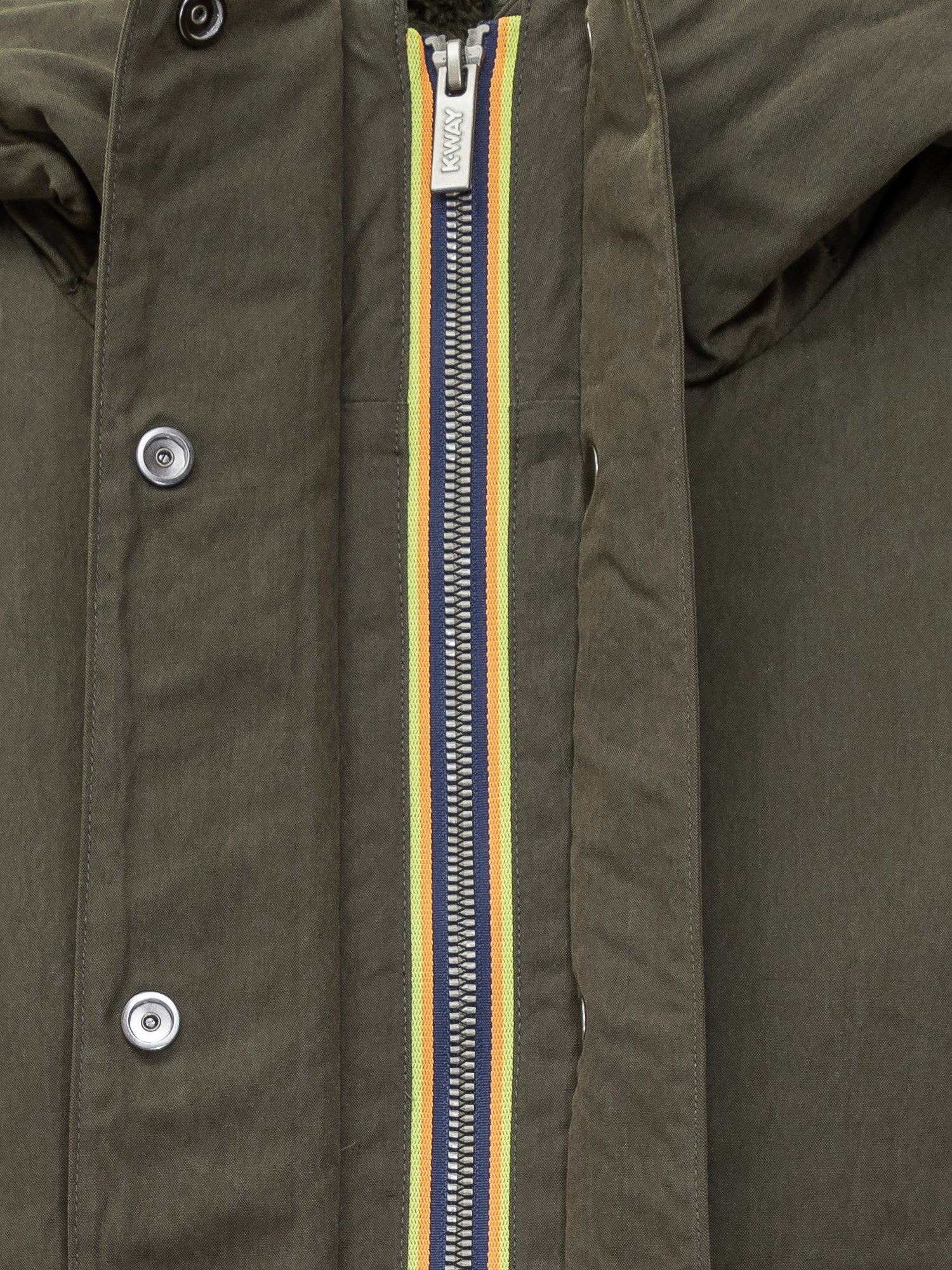 Giacca K-Way verde militare con cappuccio e calda fodera in pelliccia sintetica. Dotata di chiusura con zip e patta, tasche applicate.