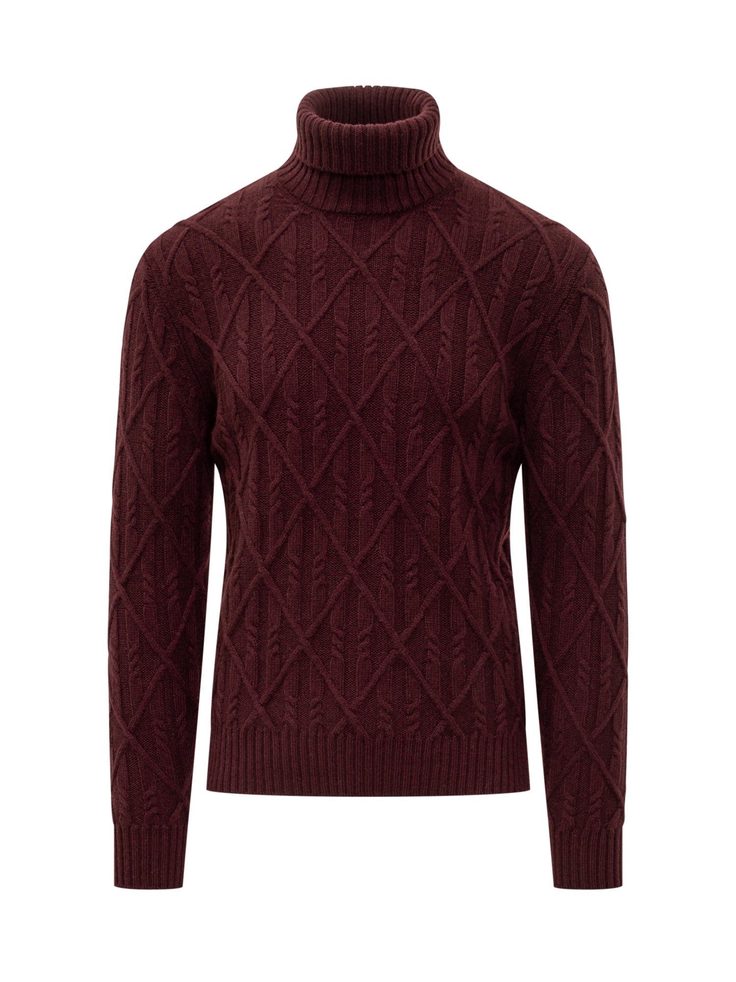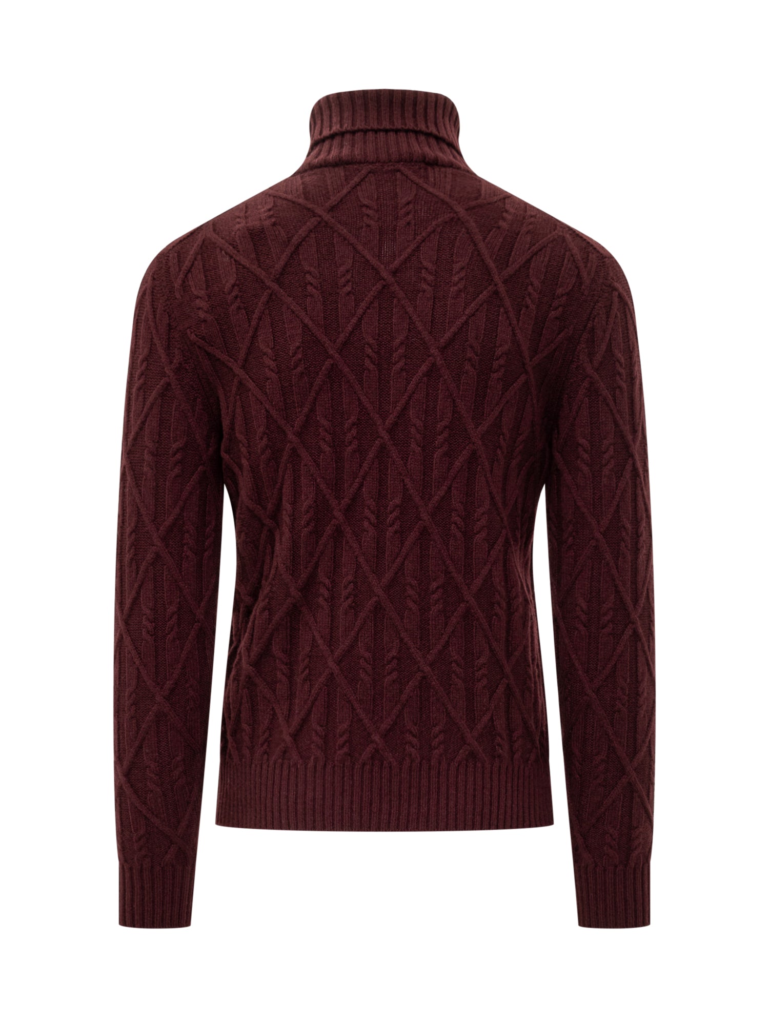 Dolcevita Lorenzoni in lana bordeaux con lavorazione a treccia e motivo geometrico.