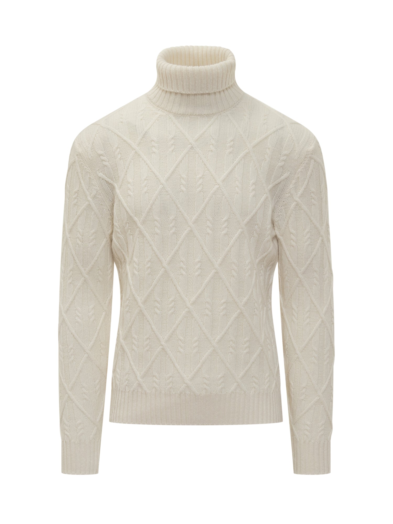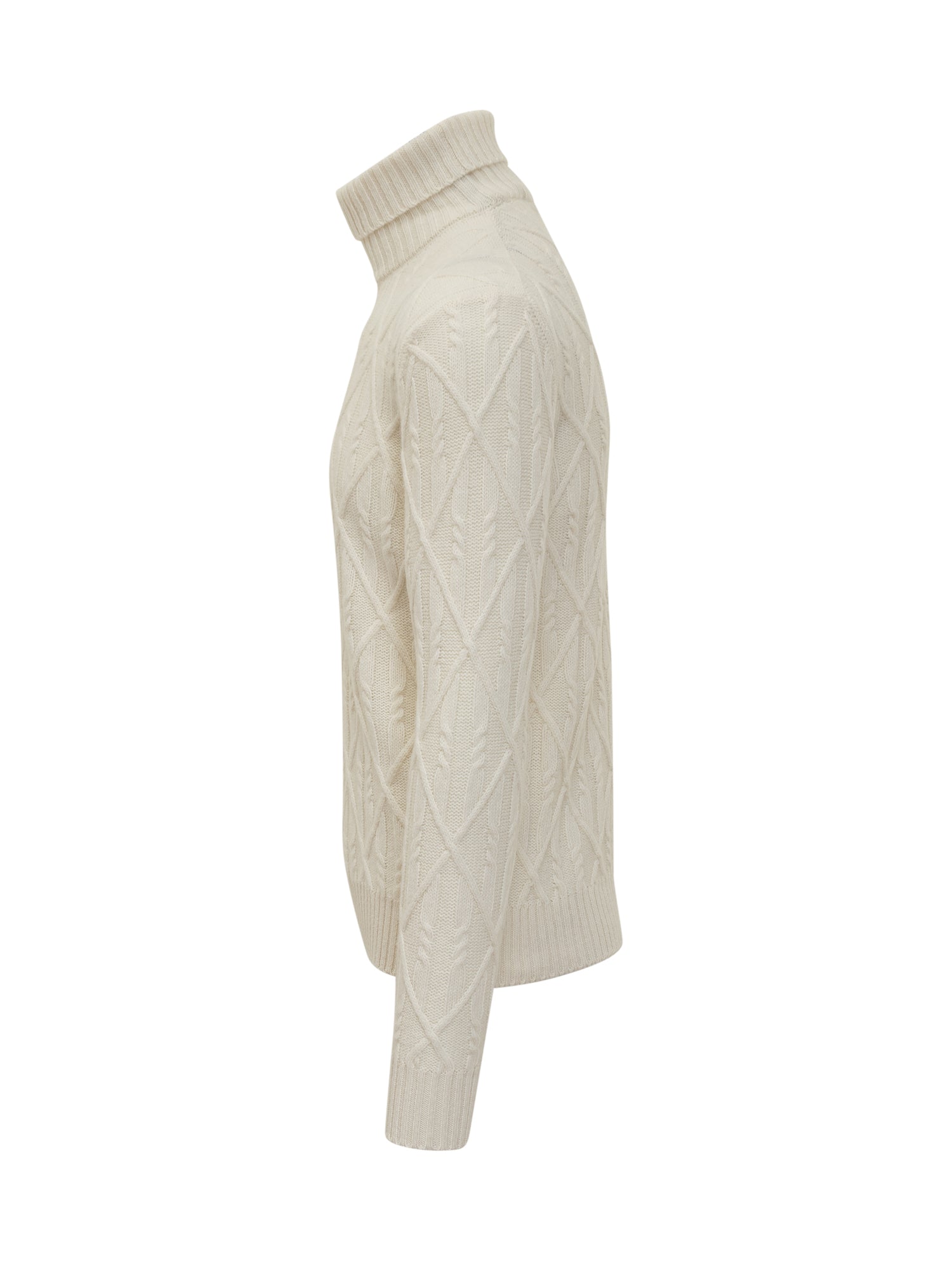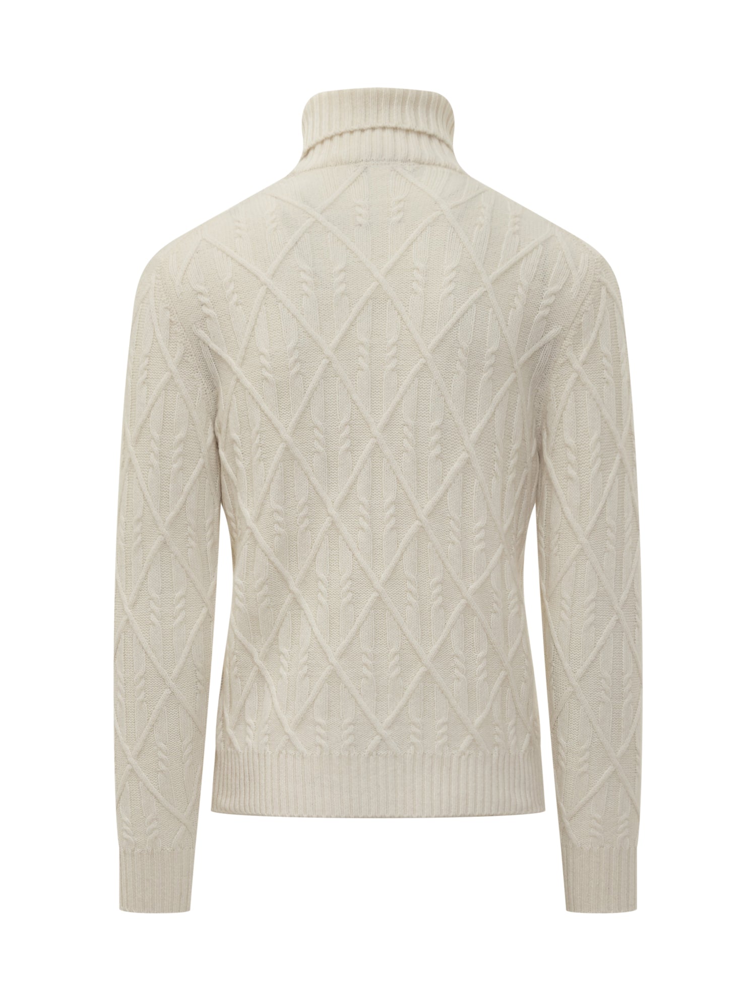 Dolcevita Lorenzoni in lana con lavorazione a treccia e motivo a rombi.