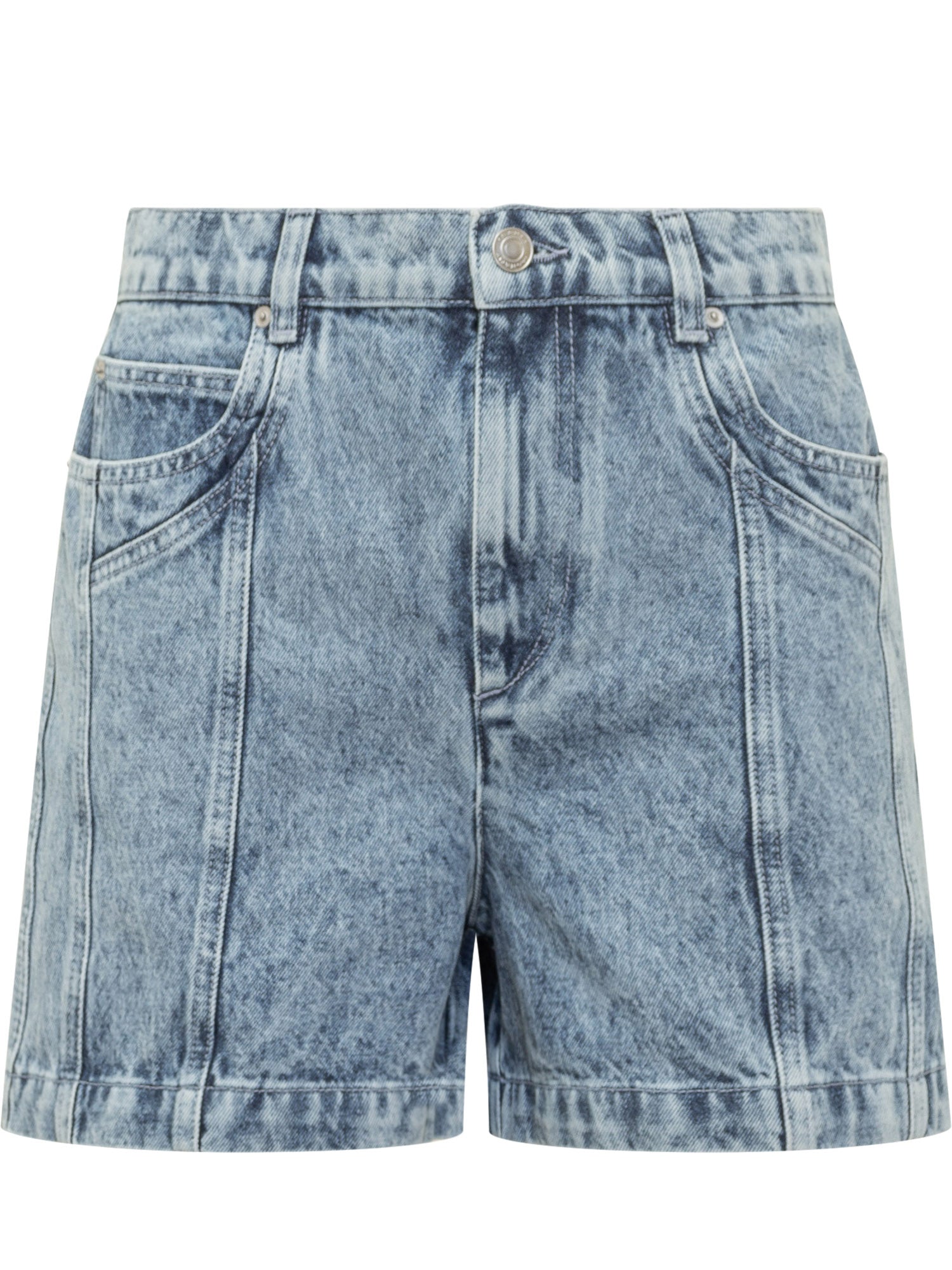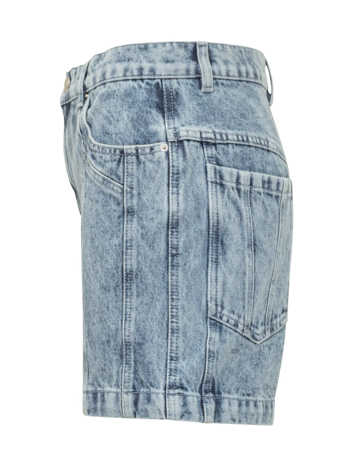 Shorts in denim con lavaggio vissuto e cuciture strutturate che definiscono la silhouette.