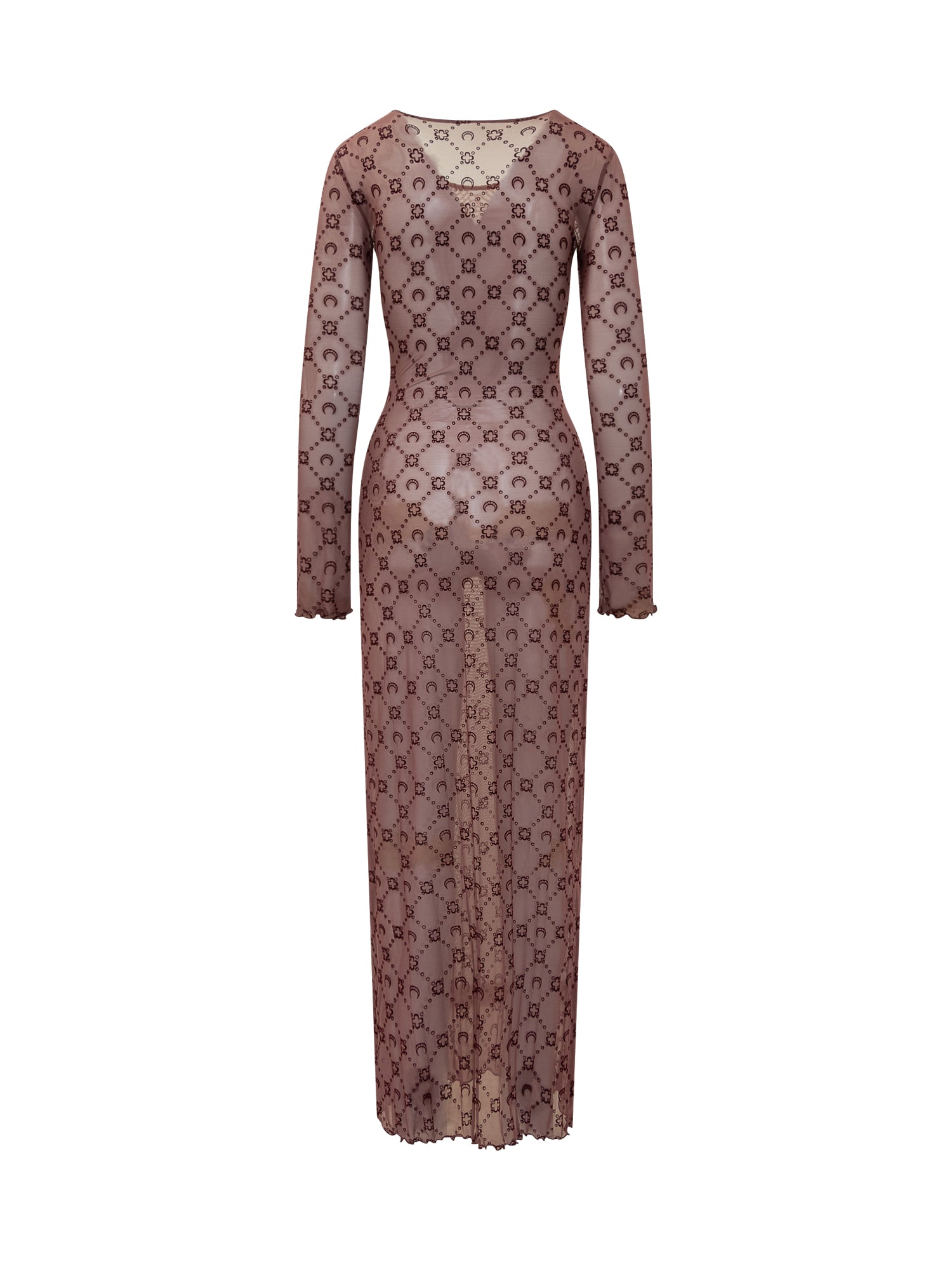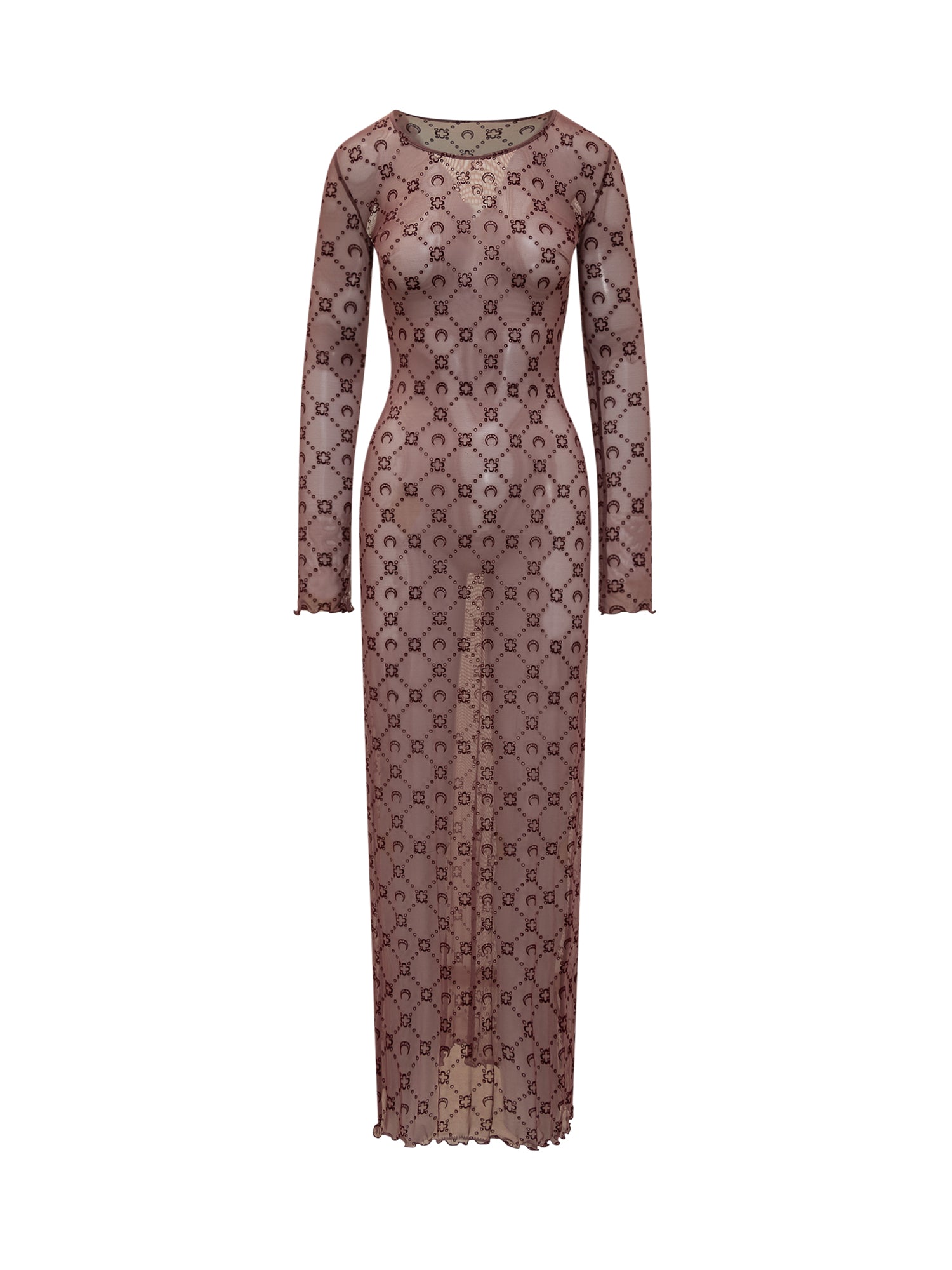 Abito lungo Marine Serre in tulle color malva con iconico motivo monogram a mezzalune e fiori. Vestibilità aderente, maniche lunghe e bordo ondulato.
