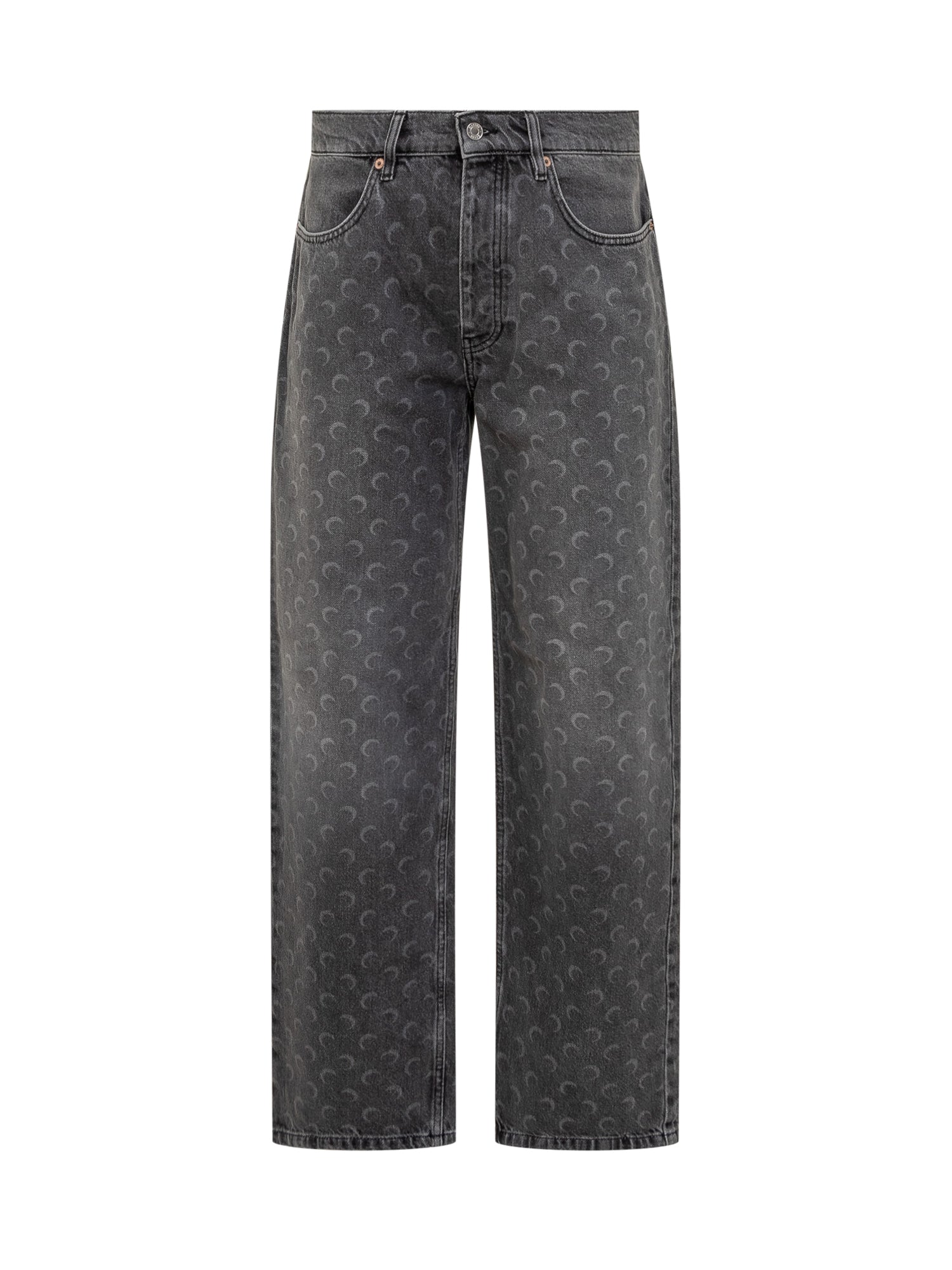Jeans Marine Serre in denim grigio con iconico motivo a mezzaluna all-over. Taglio dritto, vita media e chiusura con bottone e zip.
