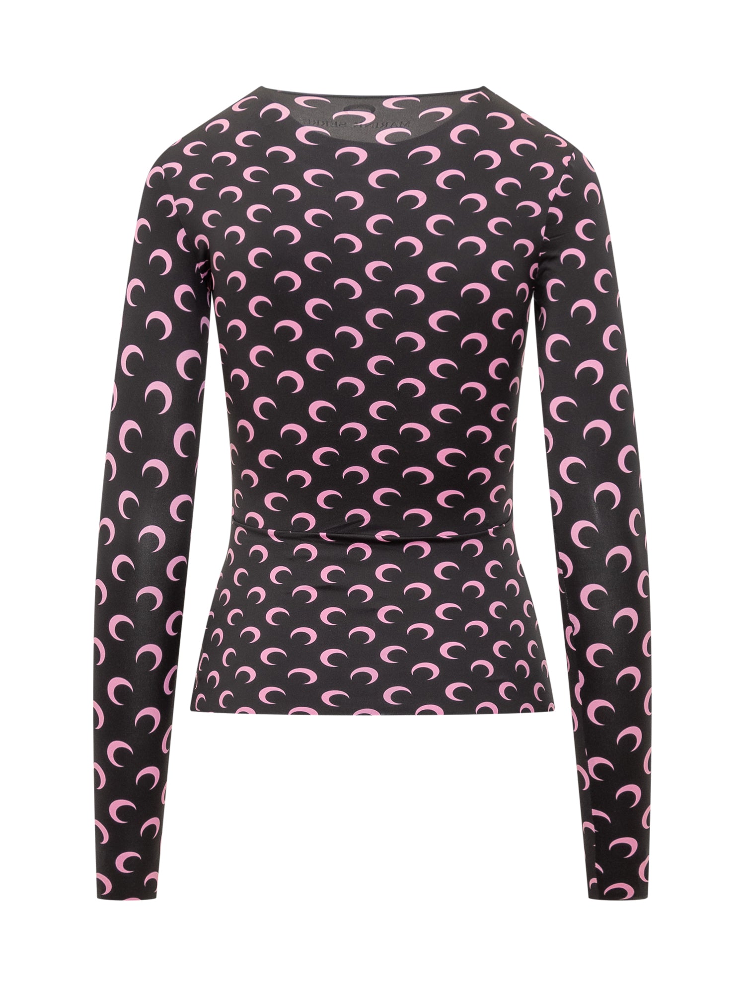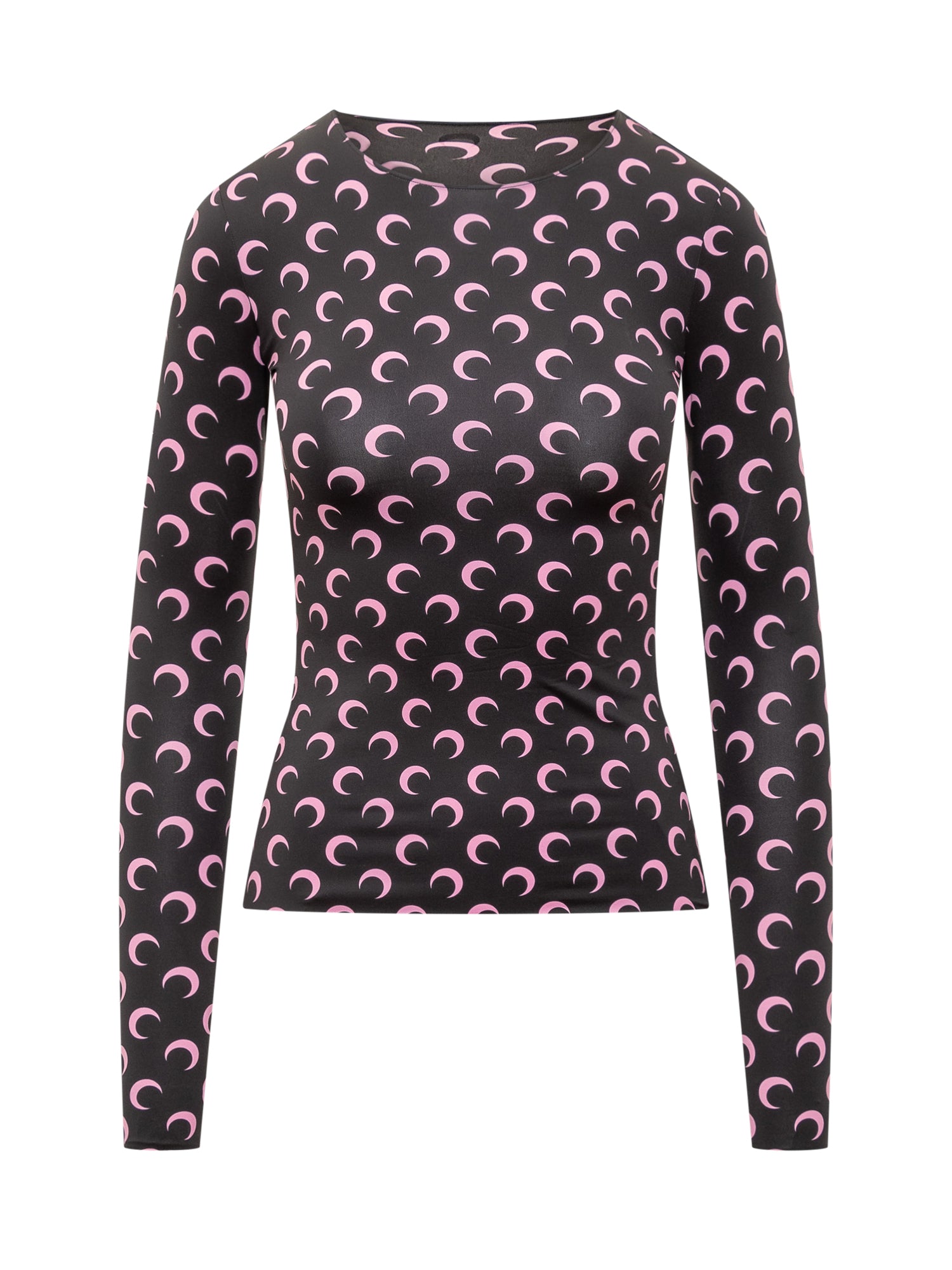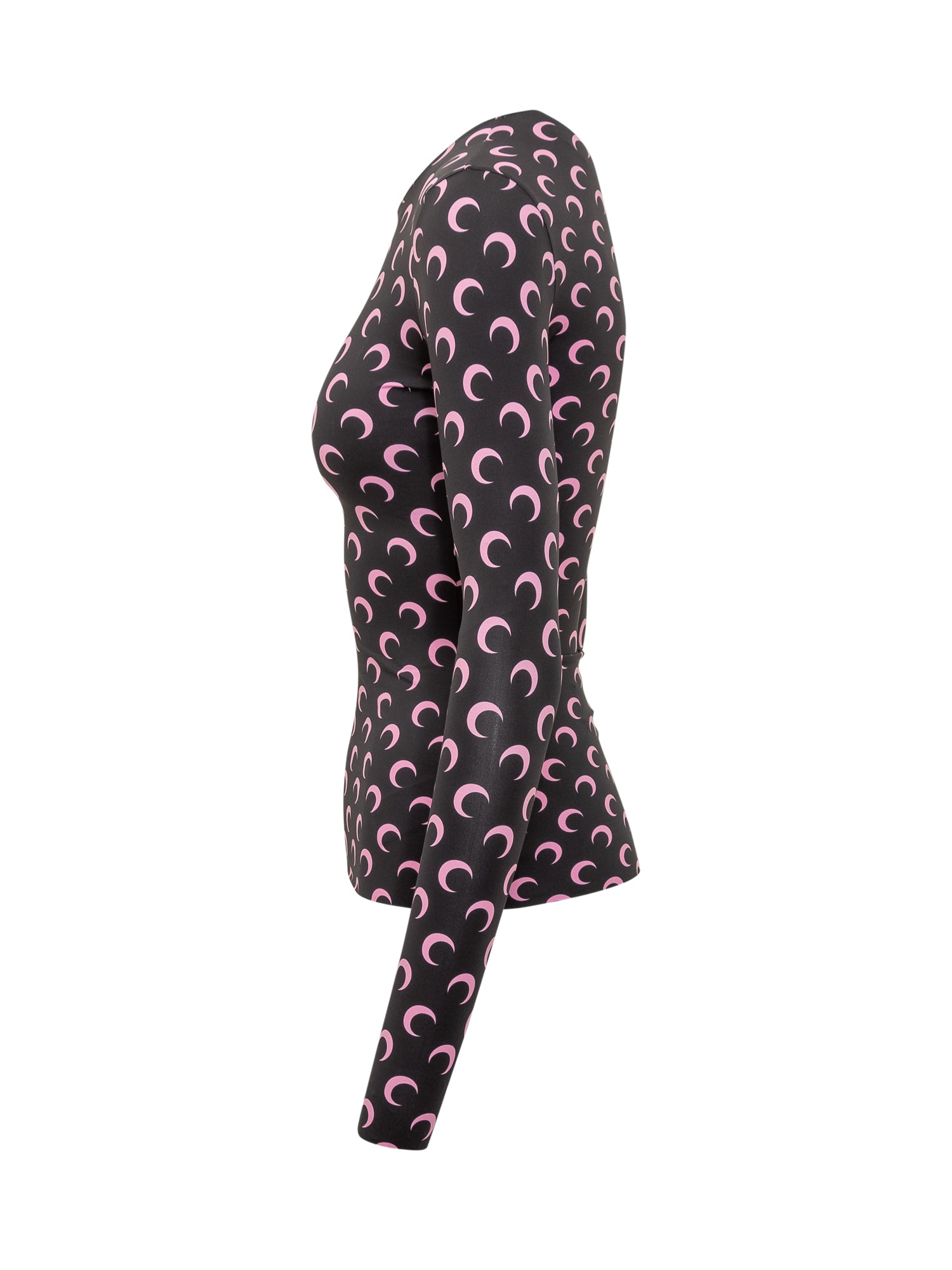 Top Marine Serre a maniche lunghe con iconica stampa a mezzaluna rosa su base nera. Realizzato in tessuto elasticizzato.