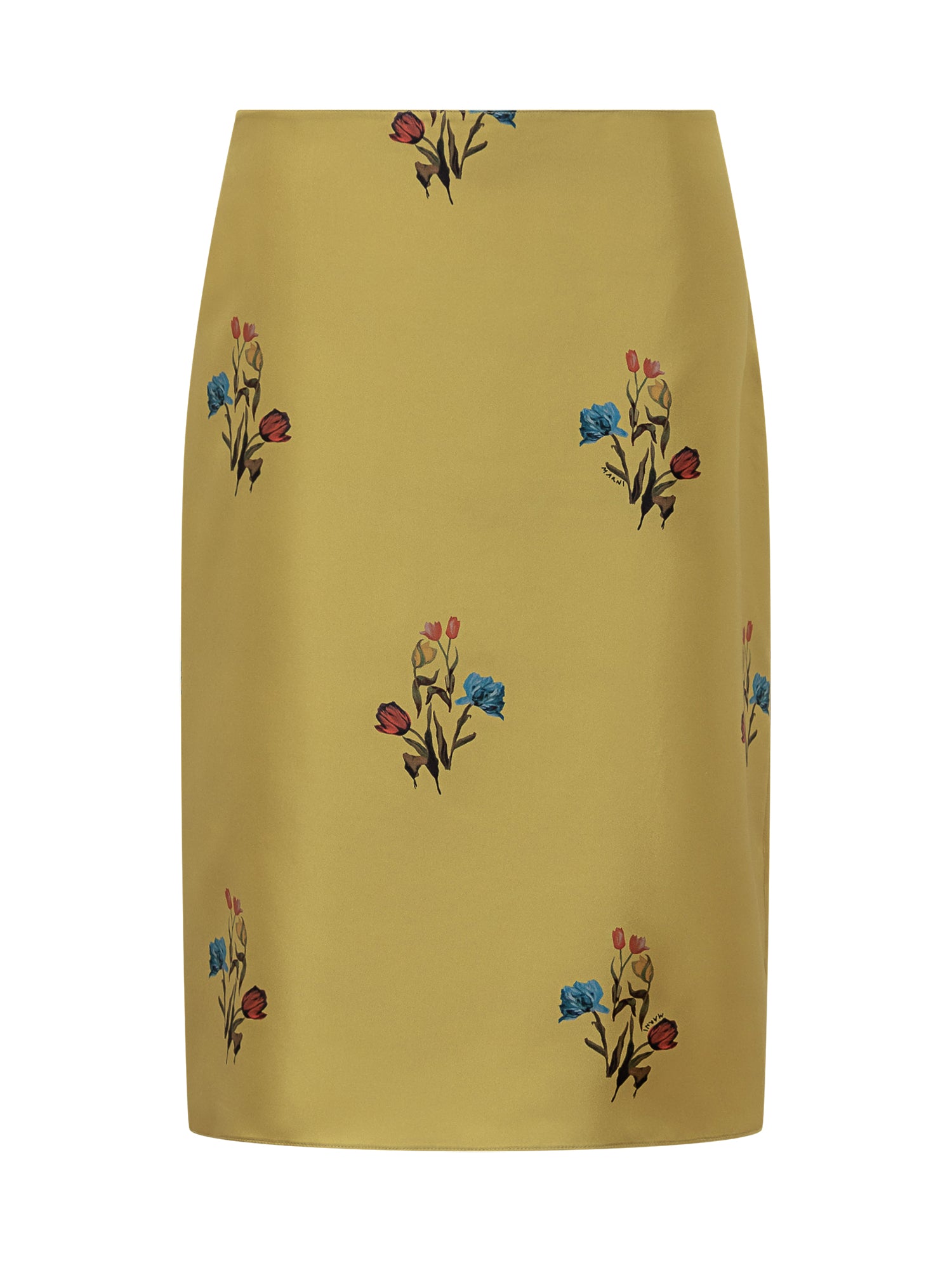 Gonna Marni in tessuto satinato giallo con delicata stampa floreale multicolore. Linea dritta e taglio corto.