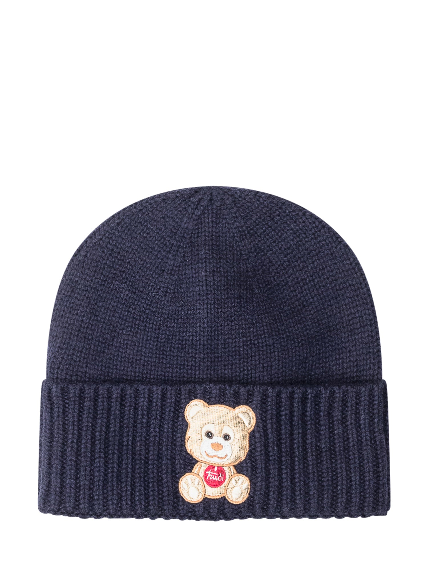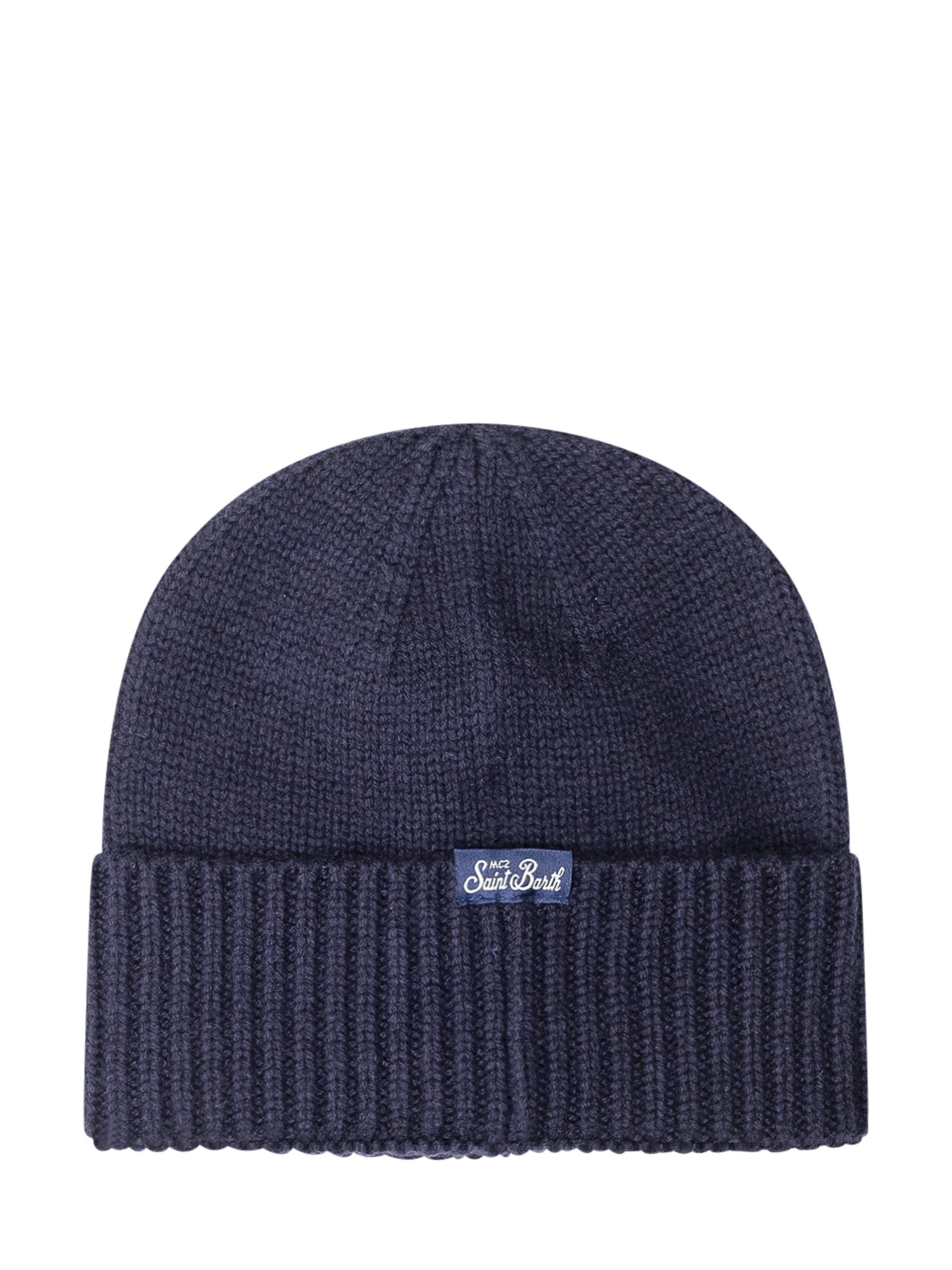 Cappello Saint Barth in lana blu con risvolto e patch frontale a forma di orsetto.