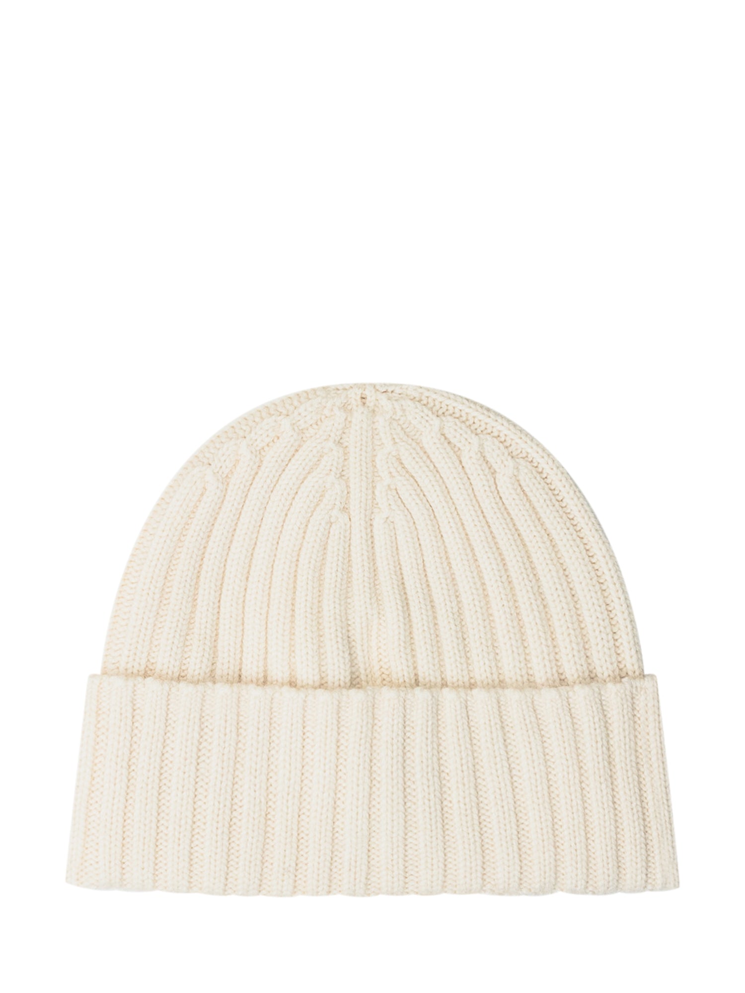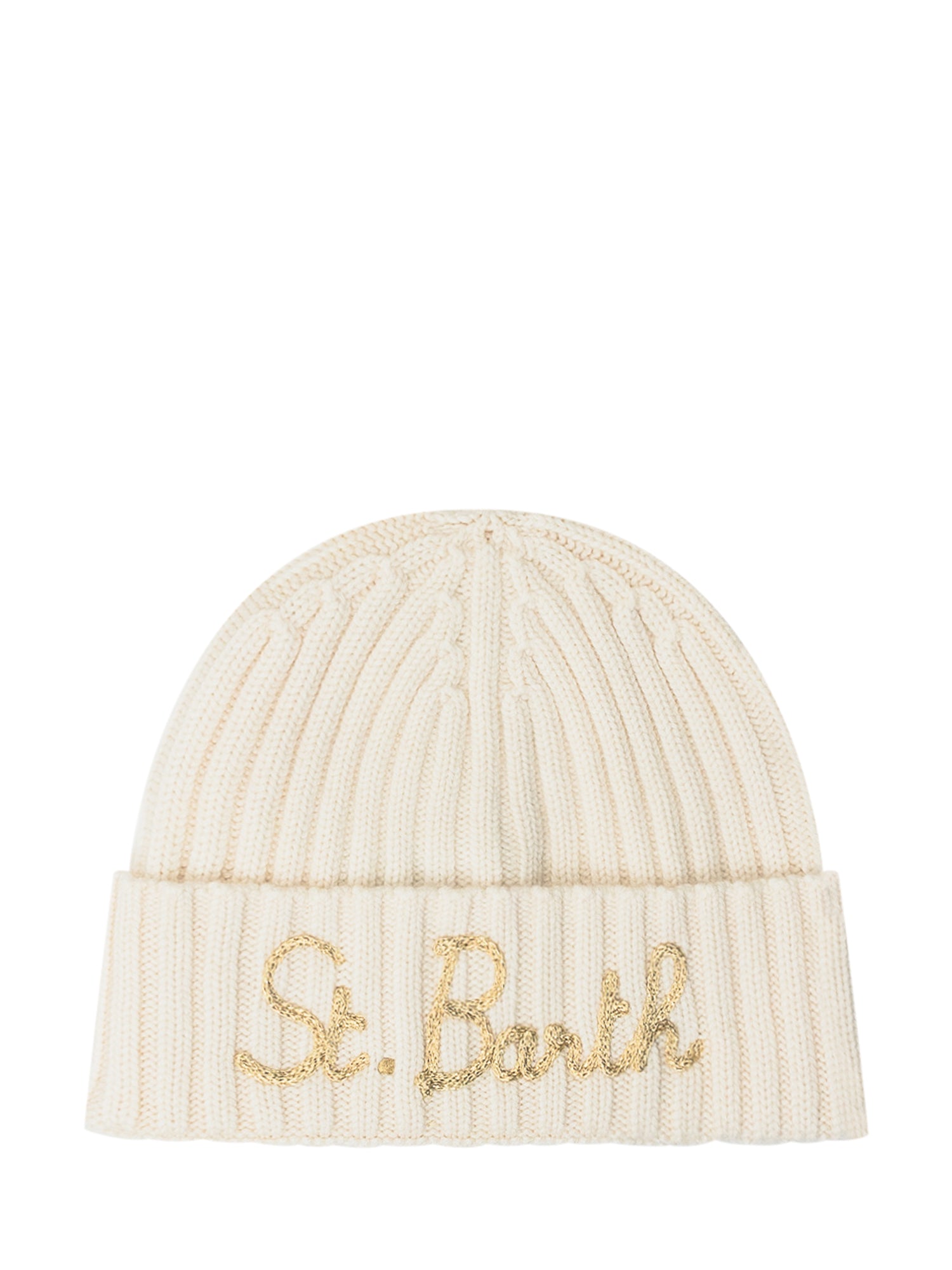 Cappello MC2 Saint Barth in maglia bianca a coste con risvolto e ricamo dorato St. Barth sul davanti.