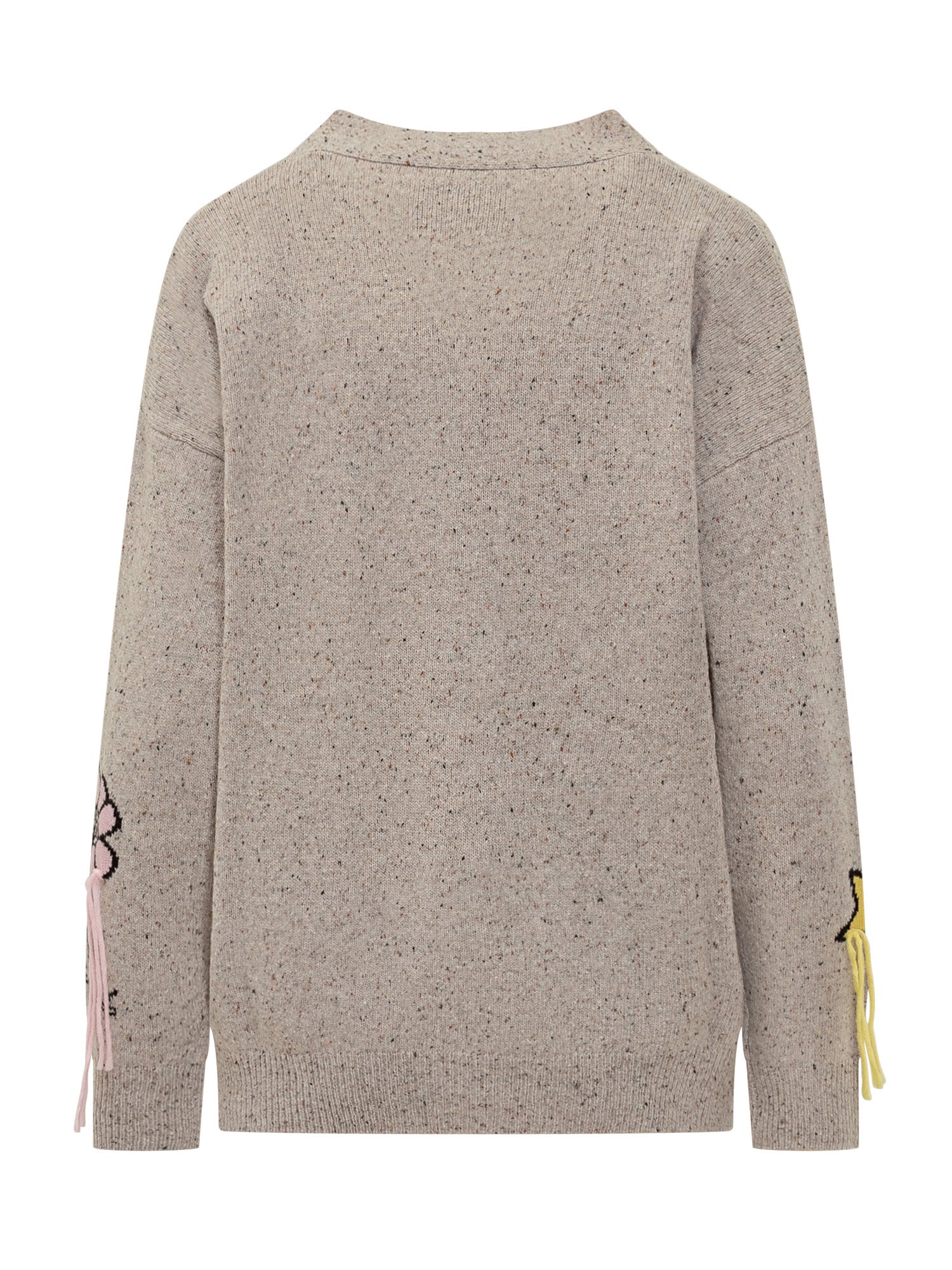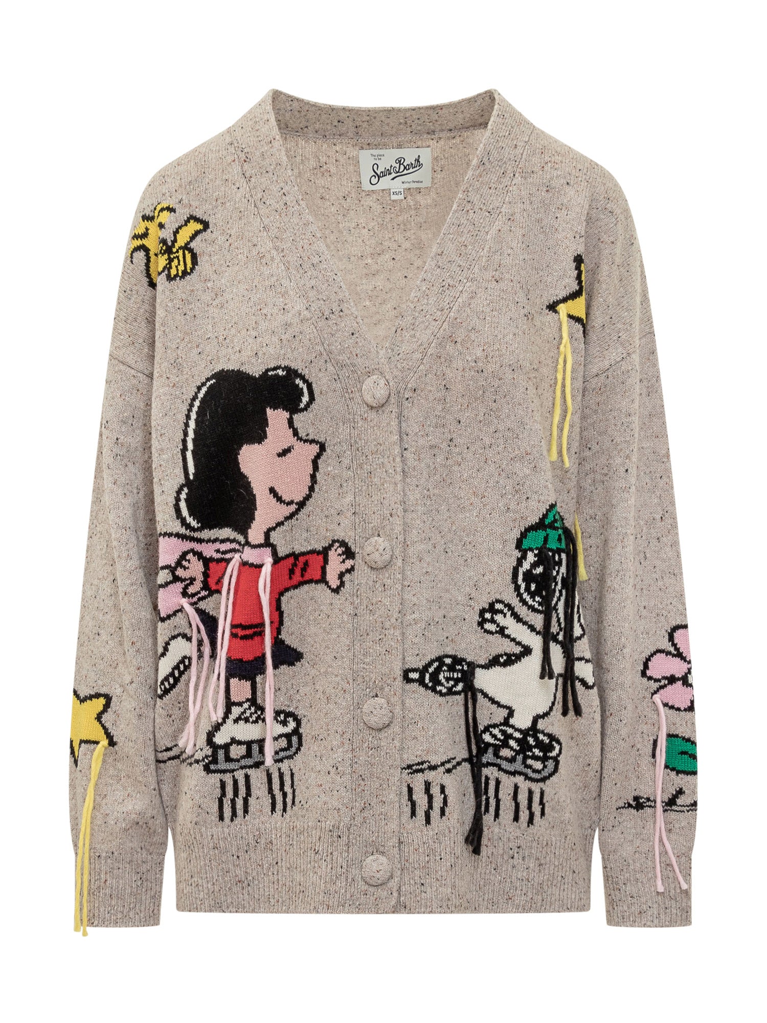 Cardigan St. Barth in lana melange con vivace motivo Peanuts e frange decorative. Modello con scollo a V, chiusura con bottoni e vestibilità morbida.