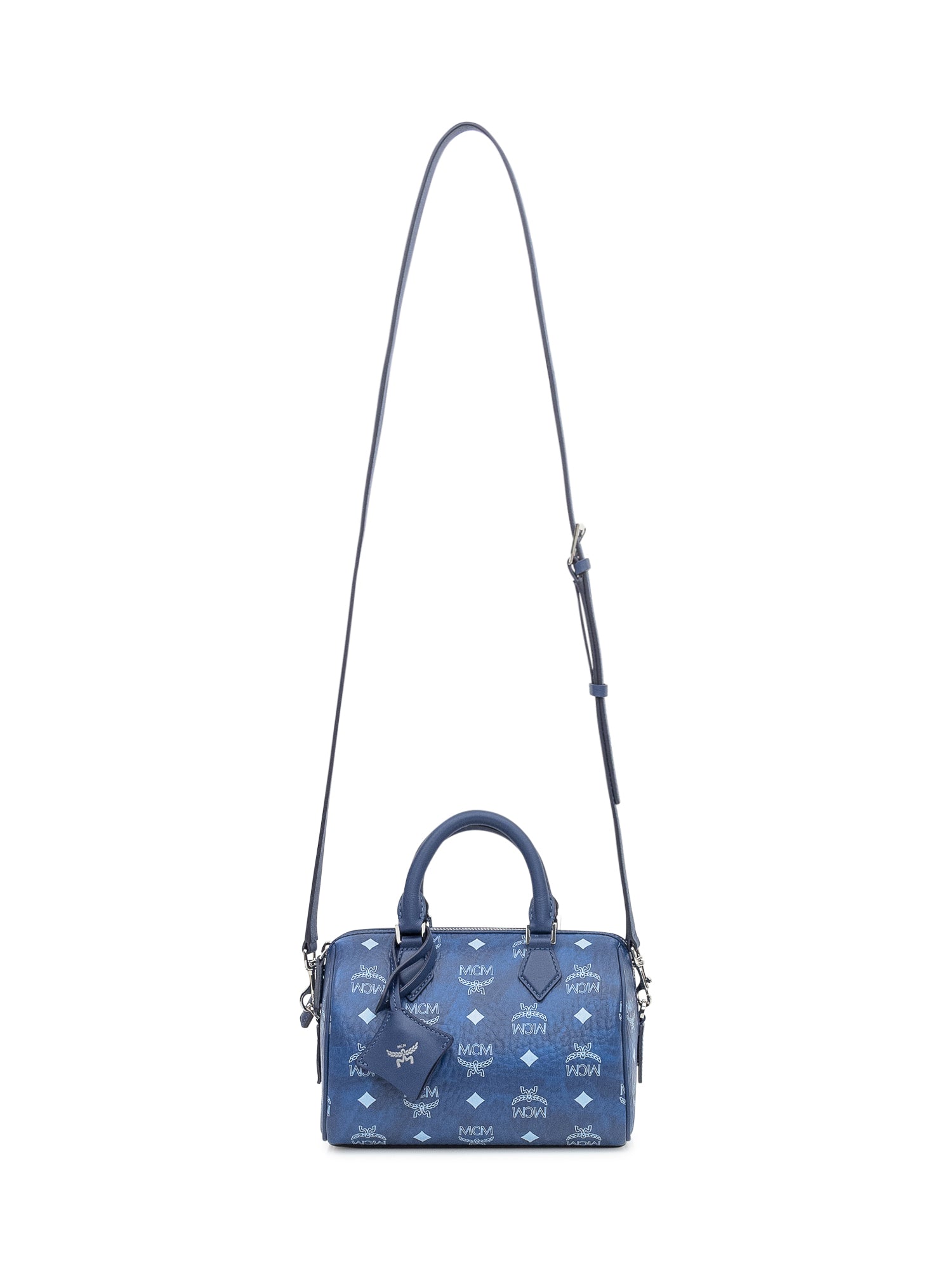 Borsa MCM Ella VI Boston in tela Visetos blu con manici superiori, chiusura a zip e charm logo.