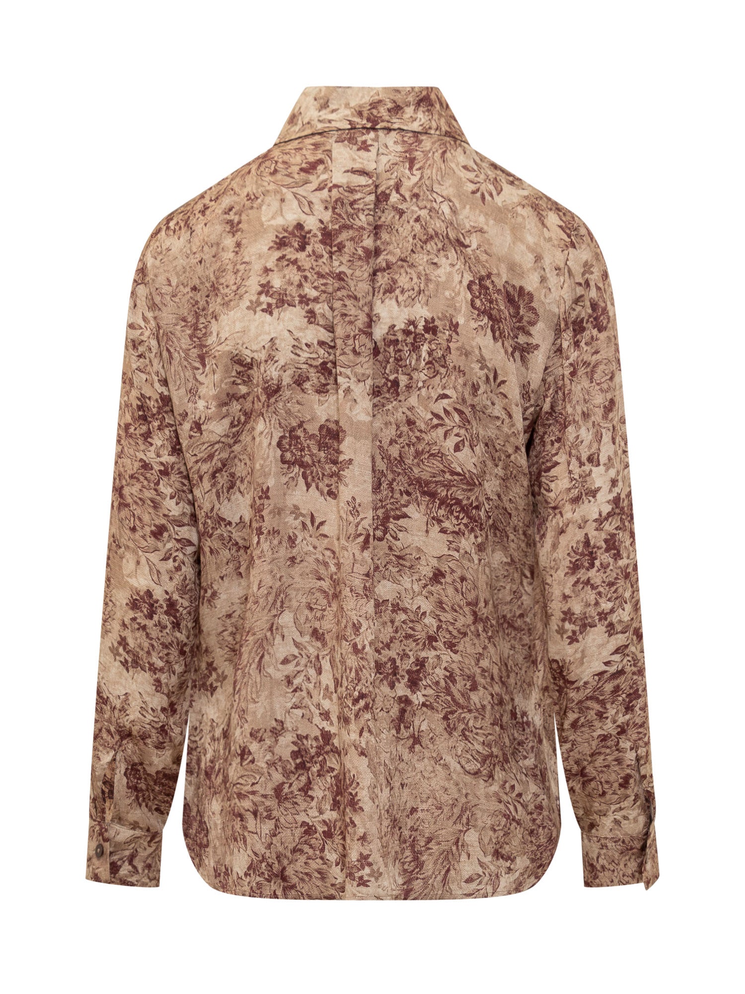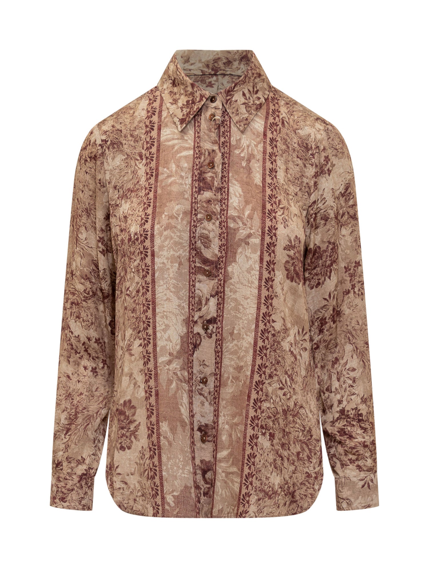 Camicia Momonì in lino con stampa floreale nei toni naturali e dettagli bordeaux.