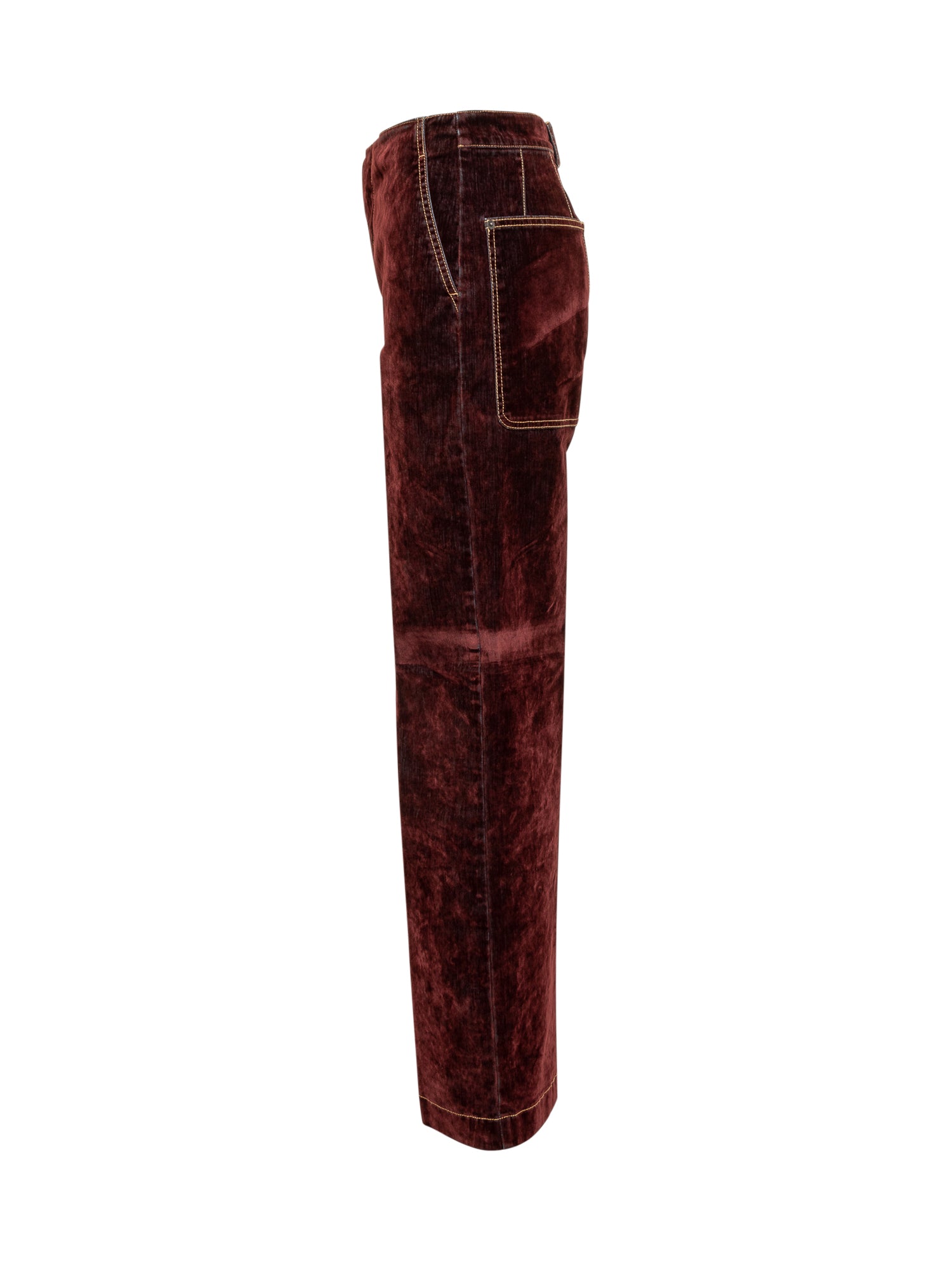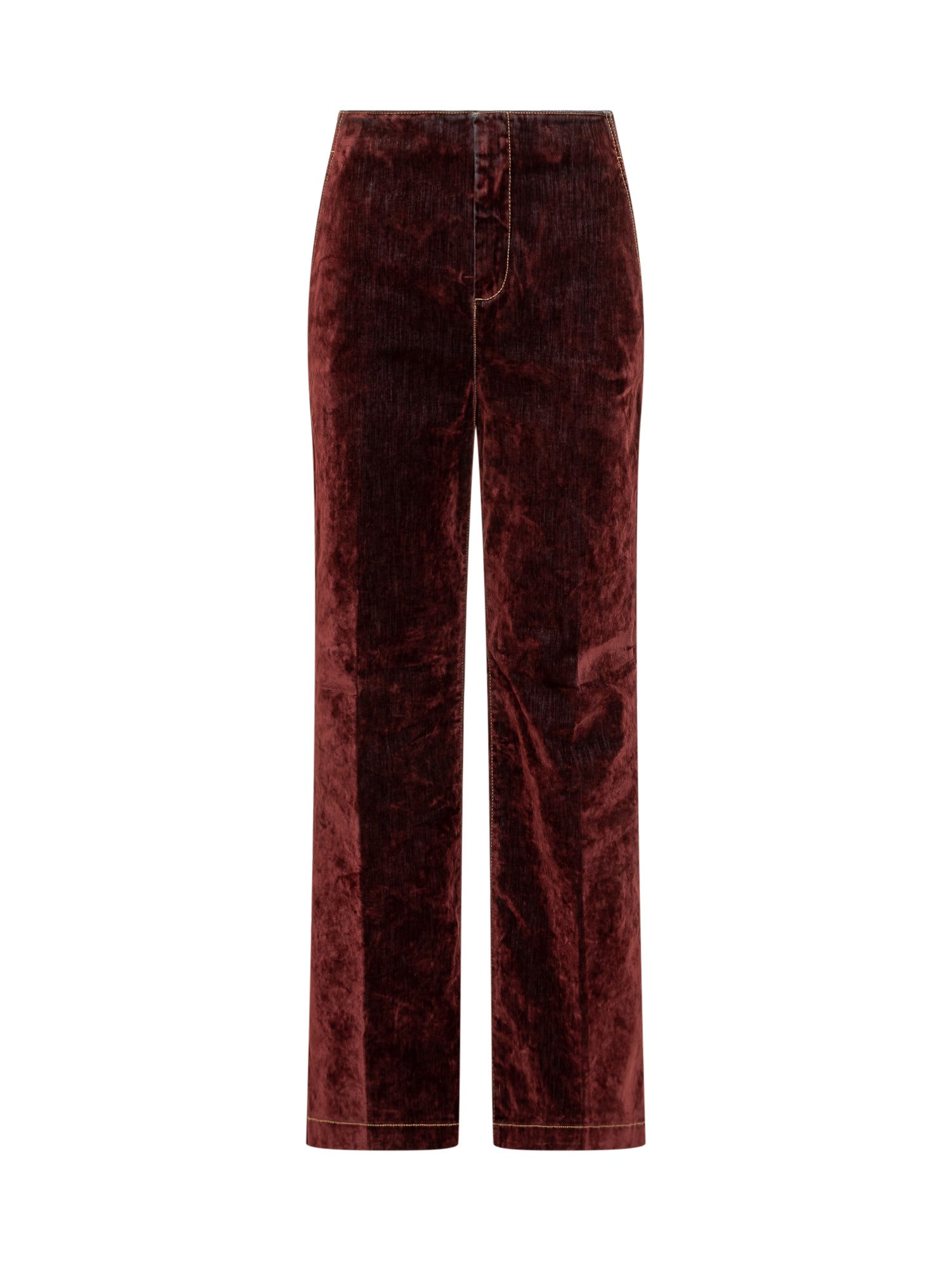 Chiusura con bottone e zip. Pantaloni Momonì in velluto liscio color bordeaux, dalla linea dritta e raffinata.