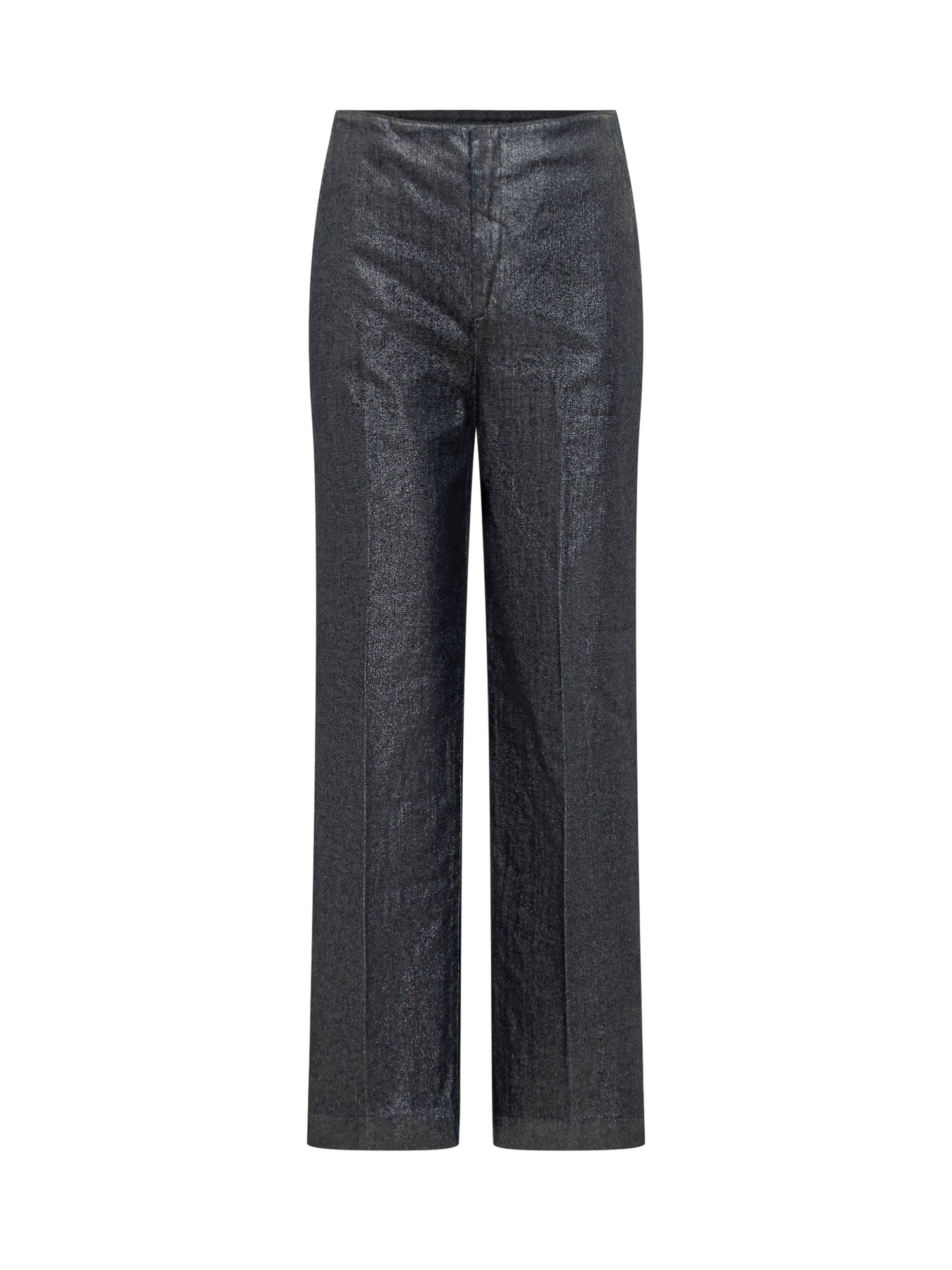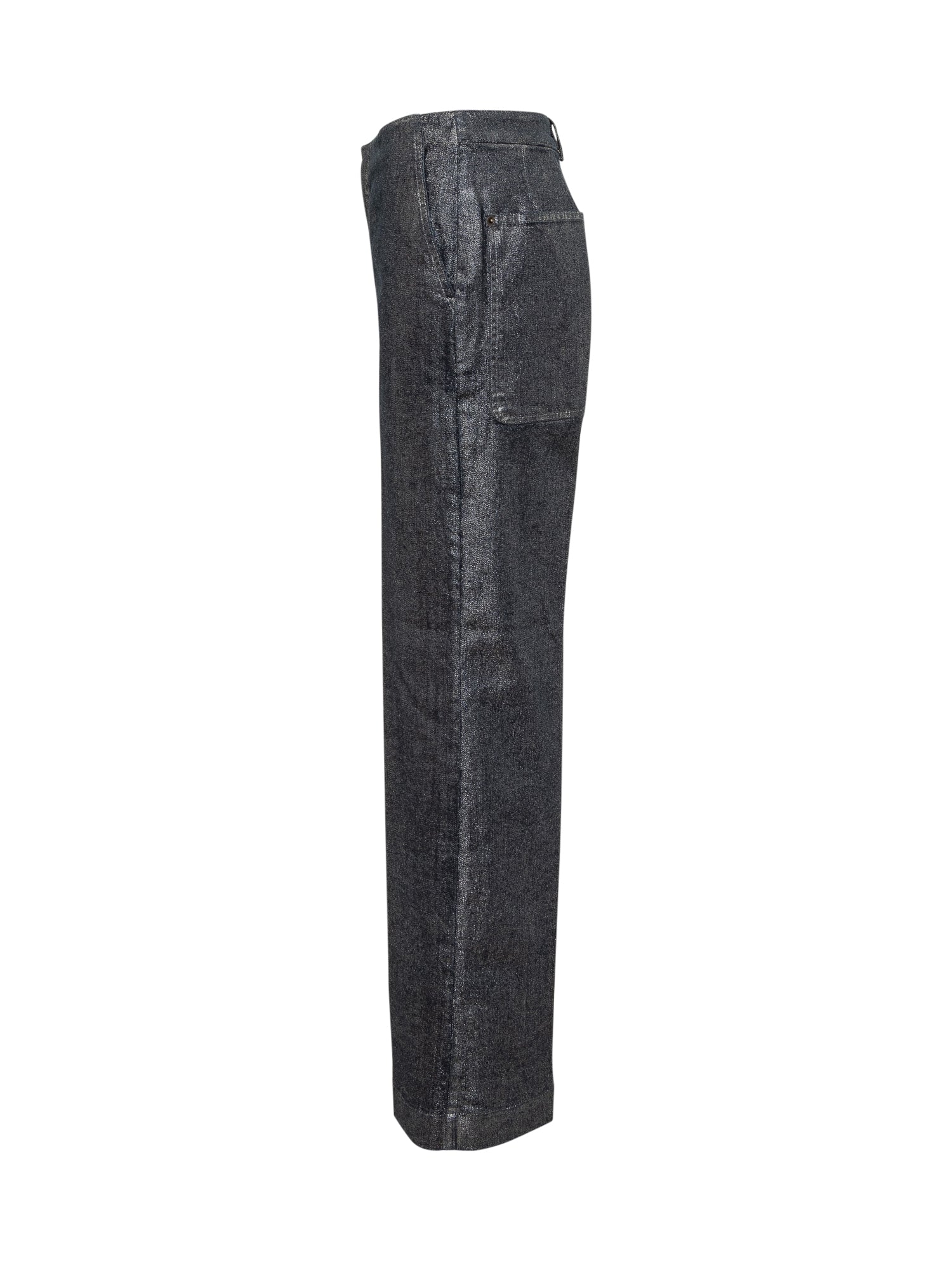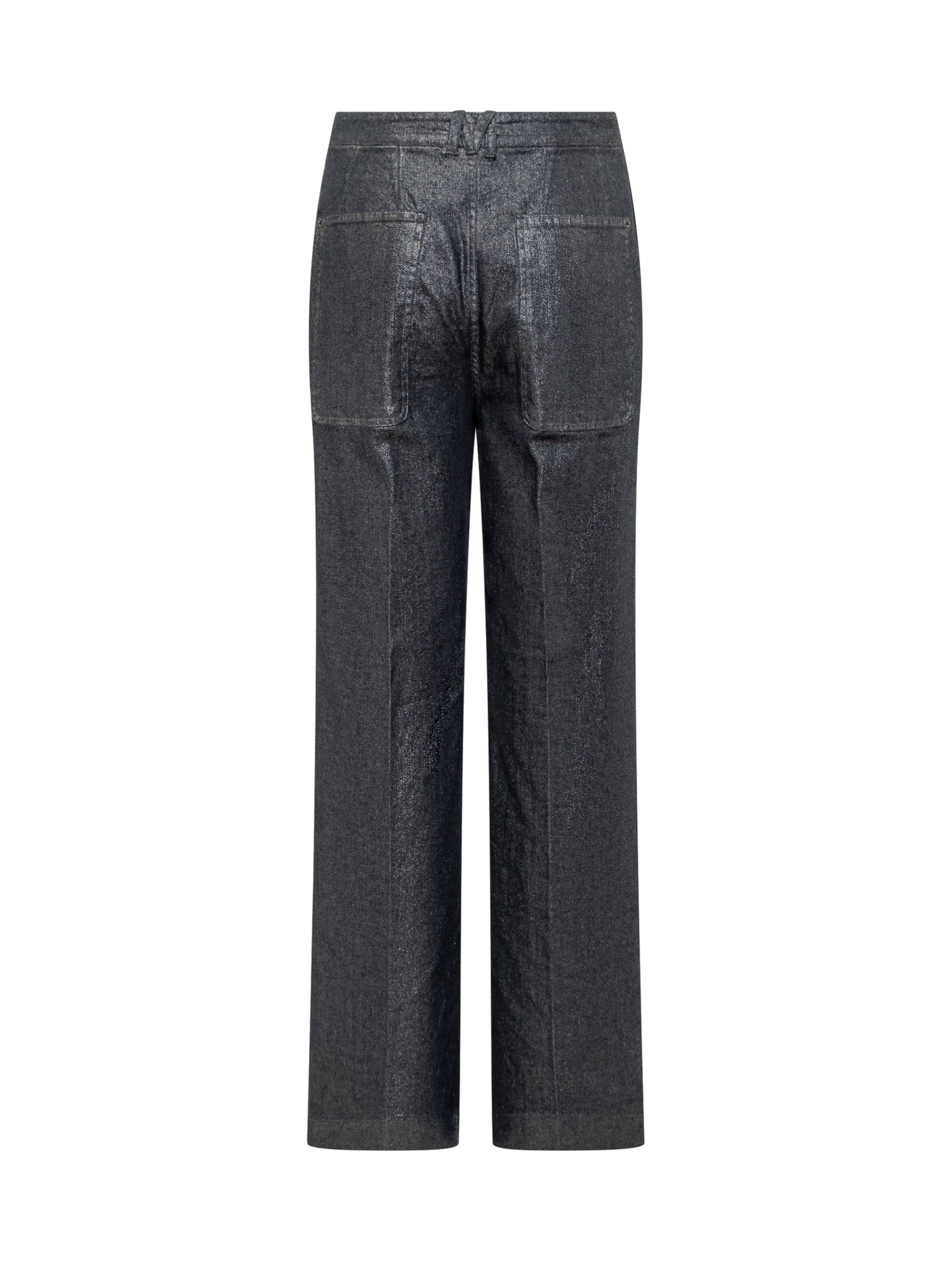 Chiusura con bottone e zip. Pantaloni Momonì in tessuto lamé grigio con linea dritta e vita media.
