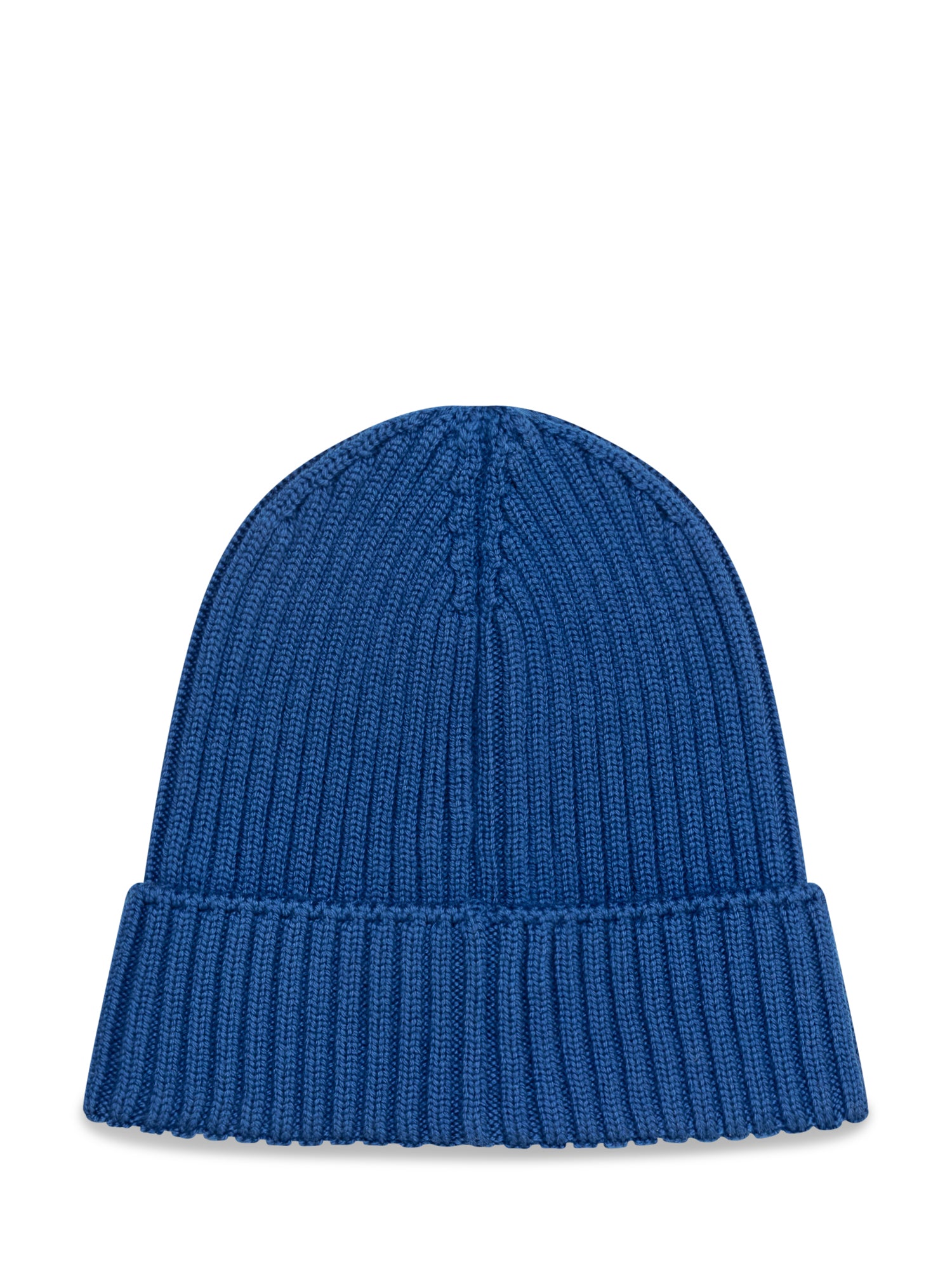 Cappello Moncler da bambino in maglia a costine blu, con risvolto e iconico logo ricamato sul davanti.