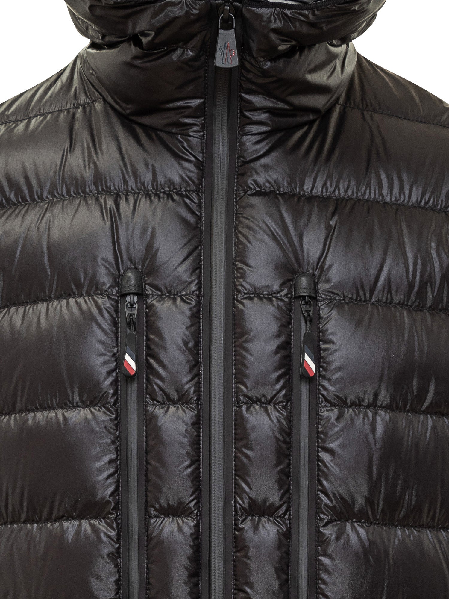 Giacca Moncler Grenoble in tessuto tecnico e nylon lucido nero con imbottitura in piuma e cappuccio. Dotata di zip frontale e tasche verticali.
