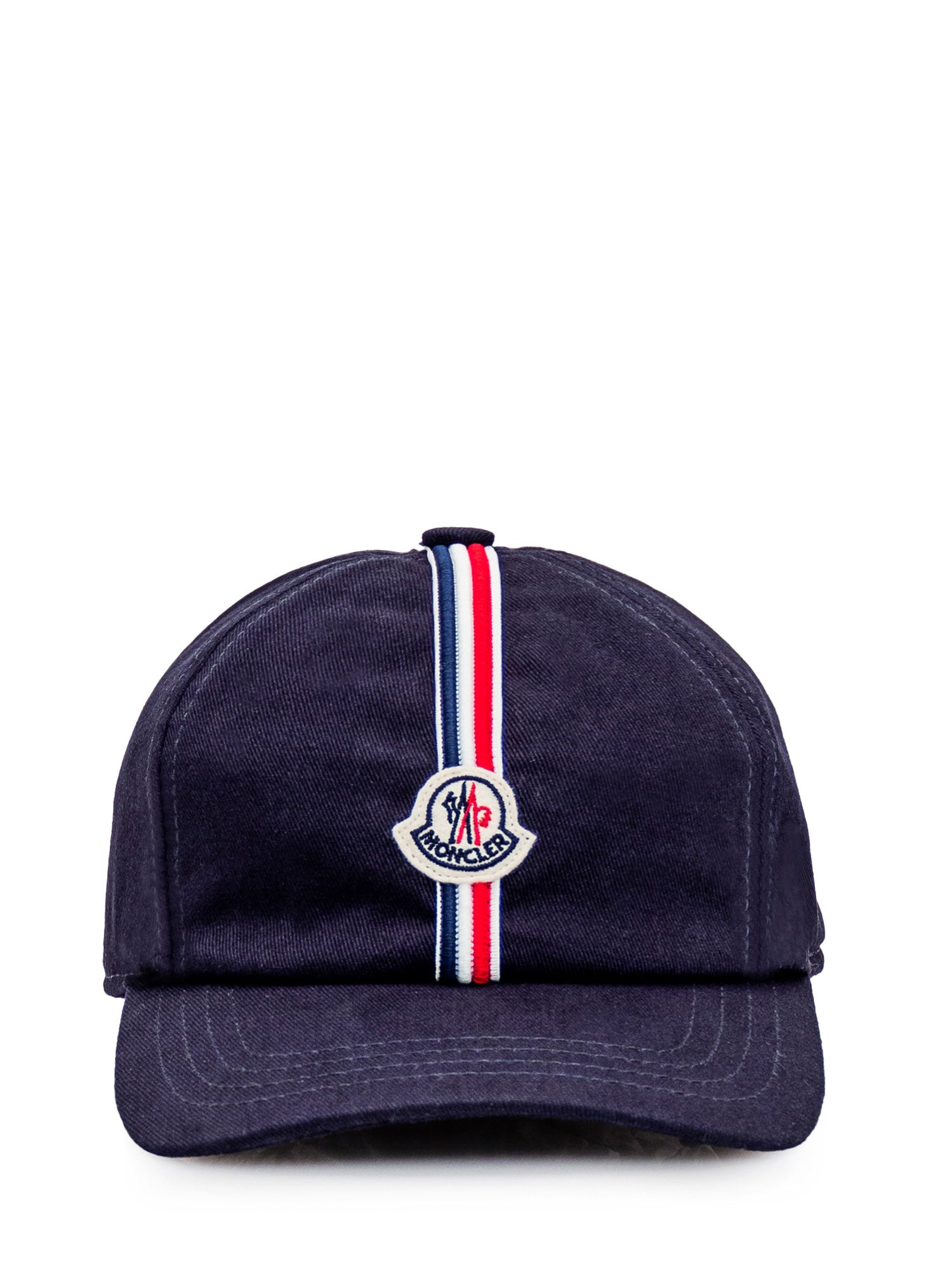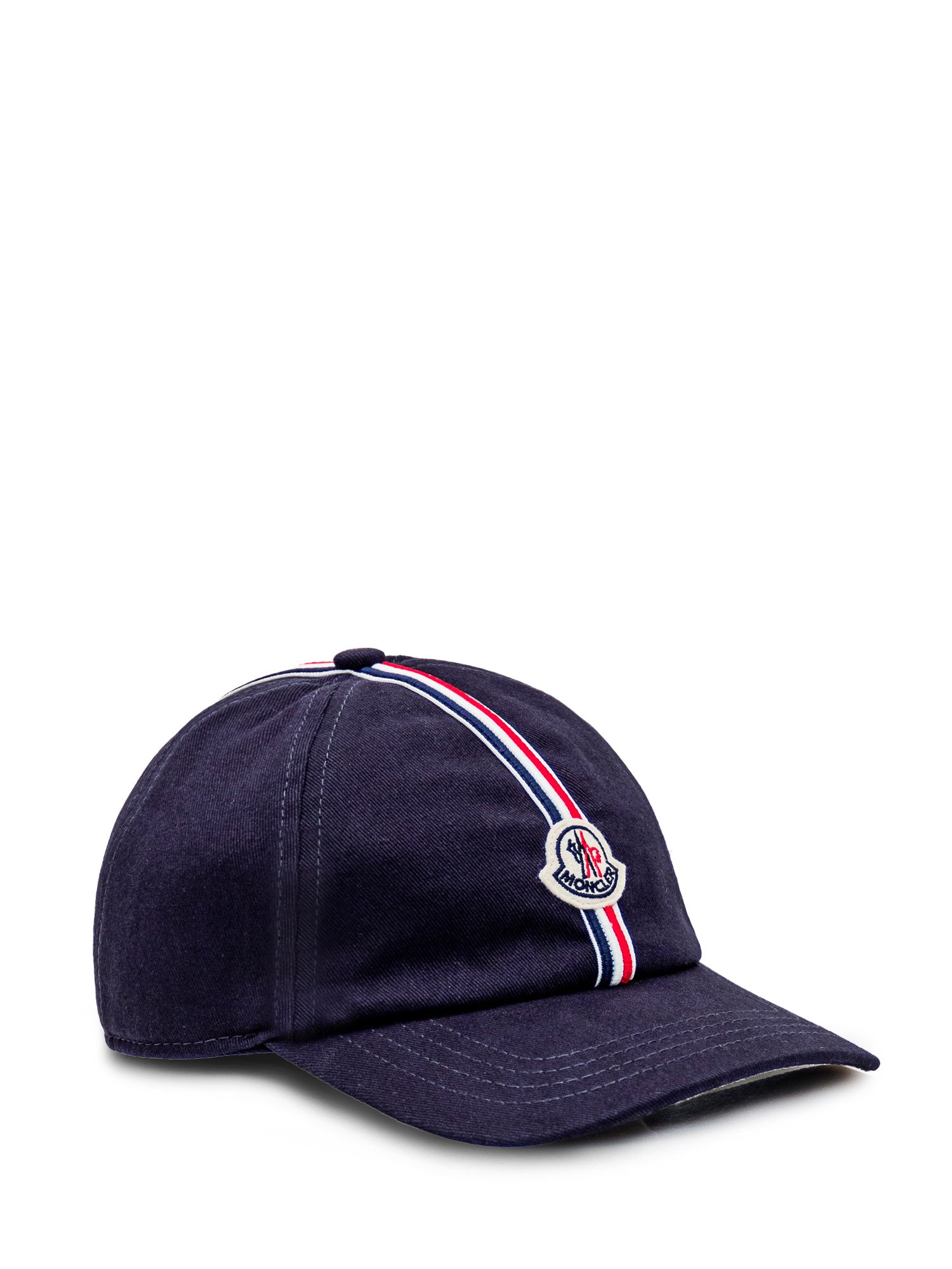 Cappello blu in cotone con visiera. Cinturino regolabile a strappo sul retro. Finiture tricolore. Patch logo sul davanti.