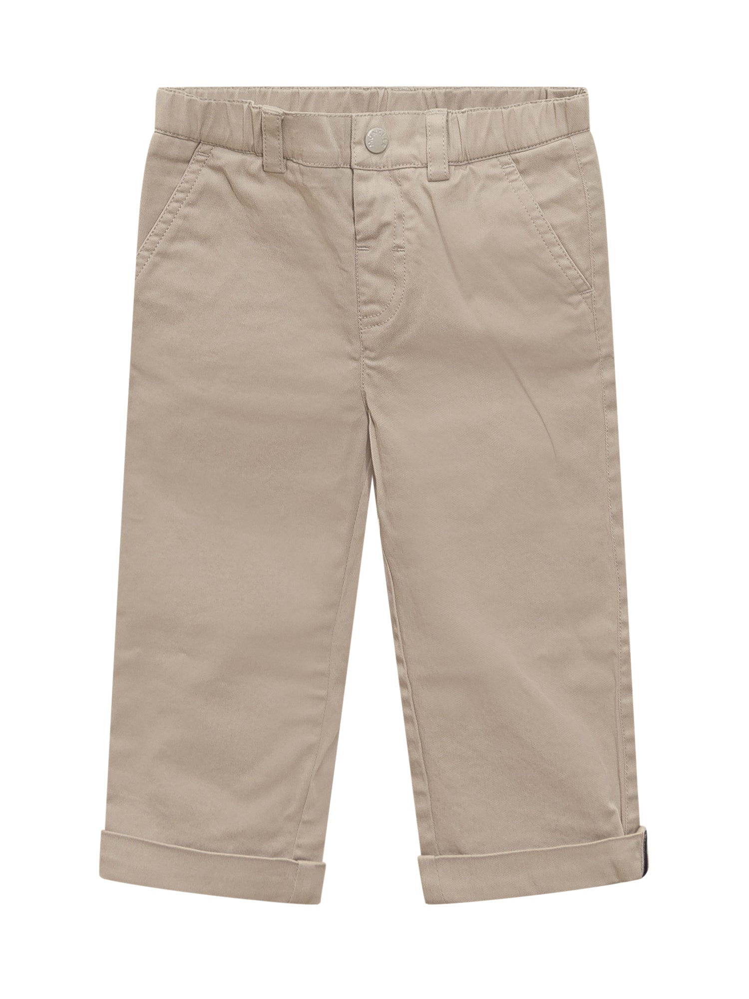Pantaloni chino beige da bambino in cotone stretch. Presentano tasche laterali, vita con passanti ed elastico, risvolti sul fondo.