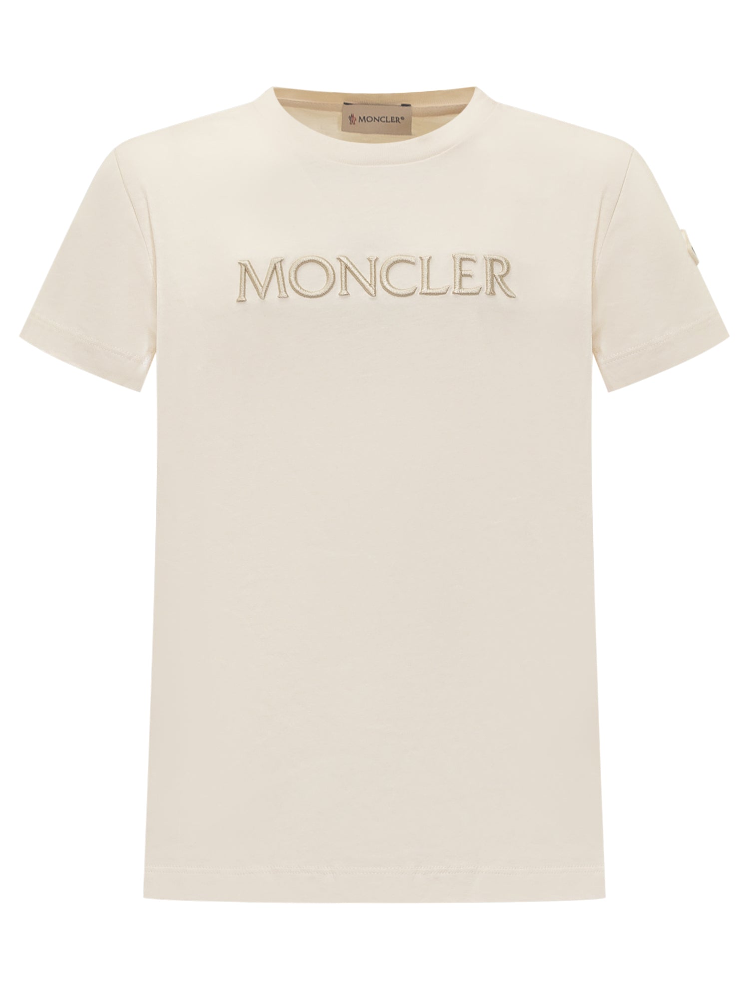 T-shirt Moncler da bambina in jersey di cotone bianco. Logo Moncler ricamato sul petto e patch applicata sulla manica.