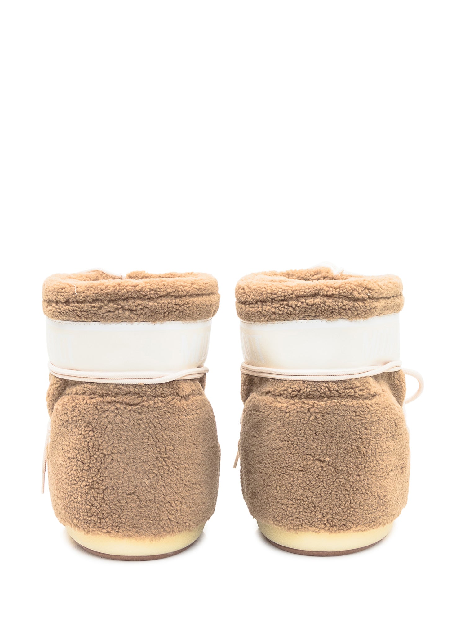 Stivali Moon Boot Icon Low in shearling beige con suola antiscivolo e lacci incrociati.