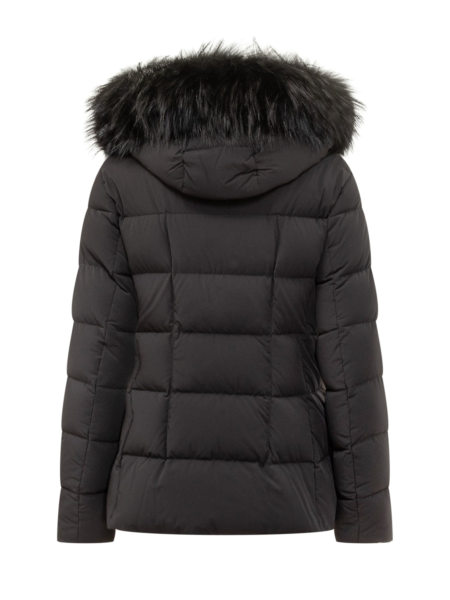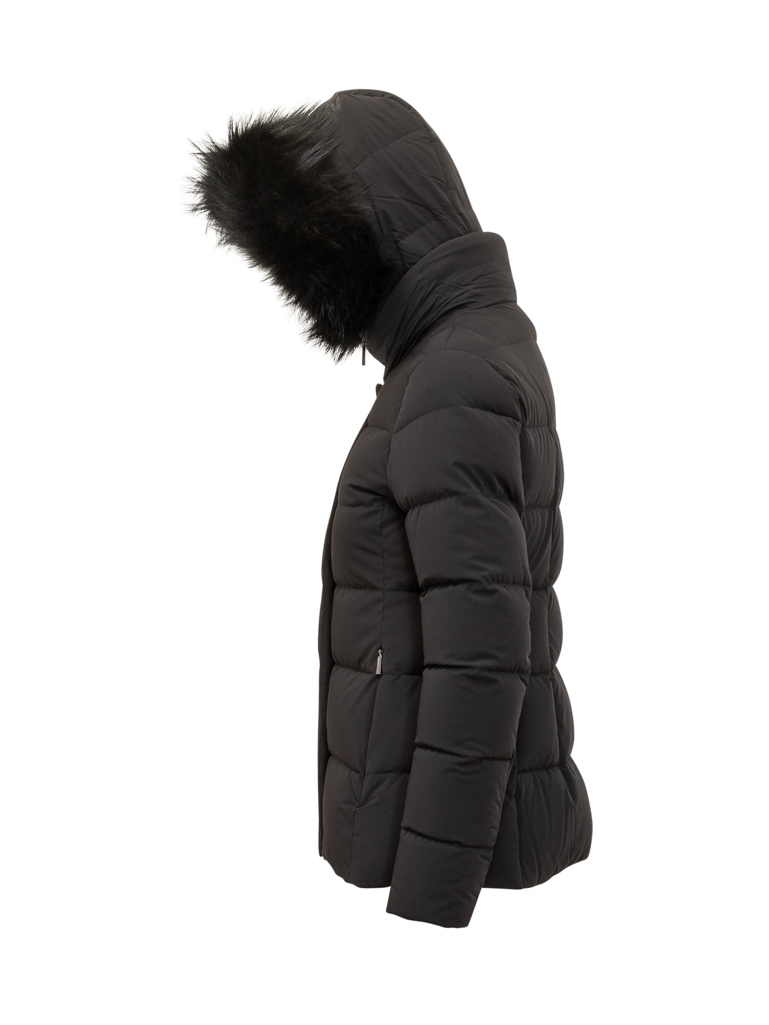 Piumino MooRER in tessuto tecnico nero con cappuccio bordato in pelliccia, chiusura a zip e bottoni.