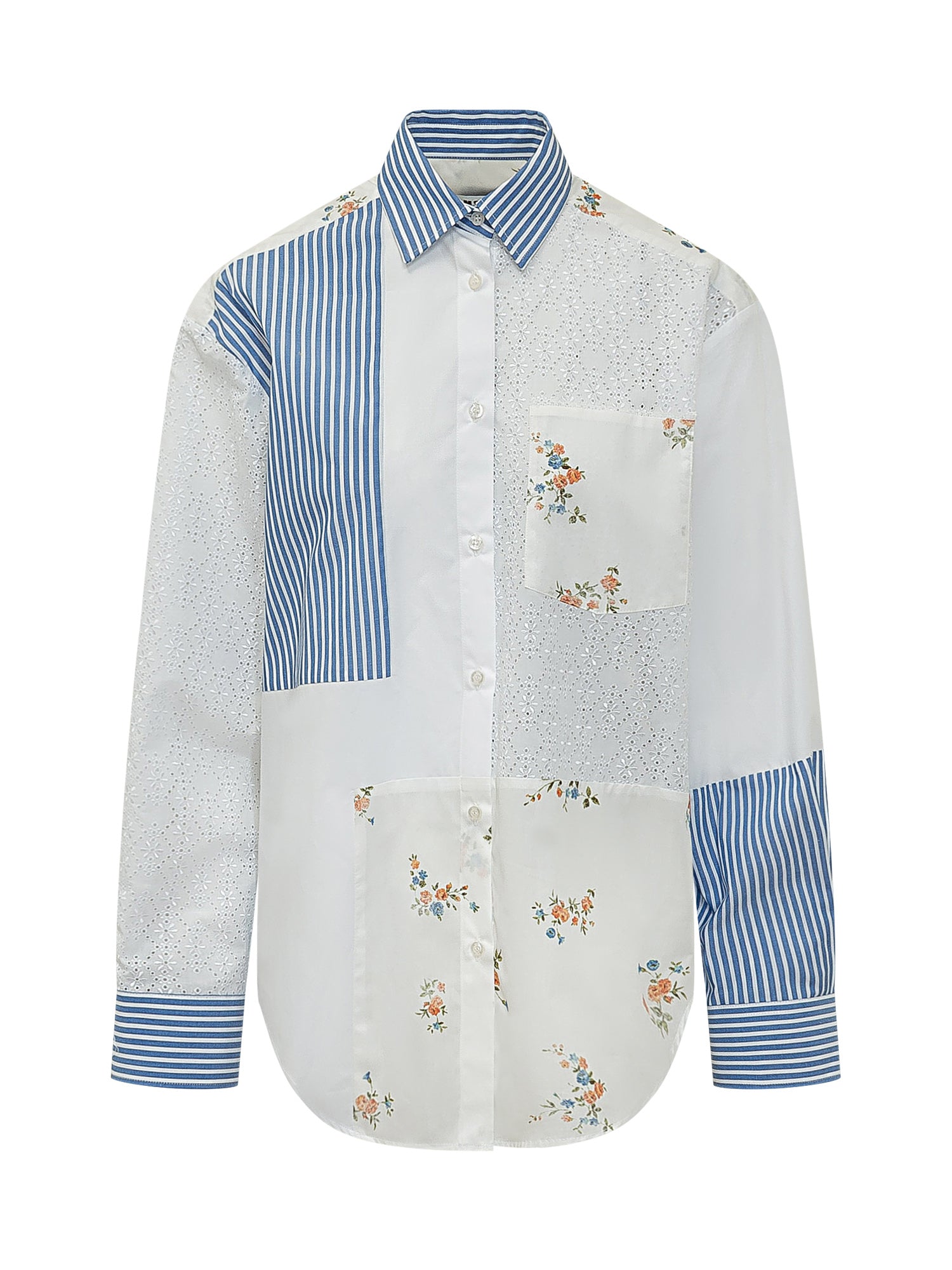Camicia in cotone con design patchwork, inserti ricamati e dettagli a righe e fiori. Colletto classico, chiusura con bottoni e taschino applicato. Vestibilità comoda.