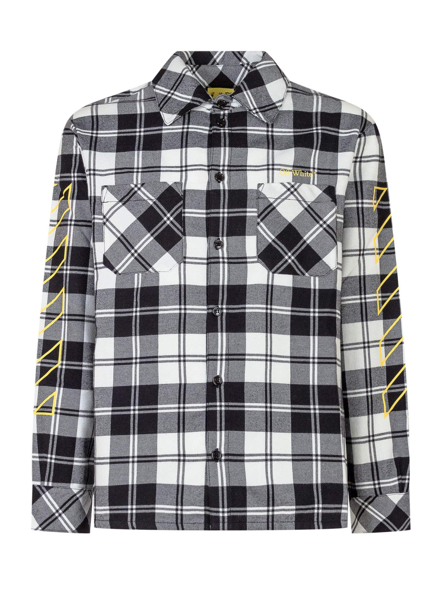 Camicia in flanella a quadri bianchi e neri Off-White. Presenta tasche sul petto, logo giallo ricamato e iconico motivo frecce stampato sul retro.