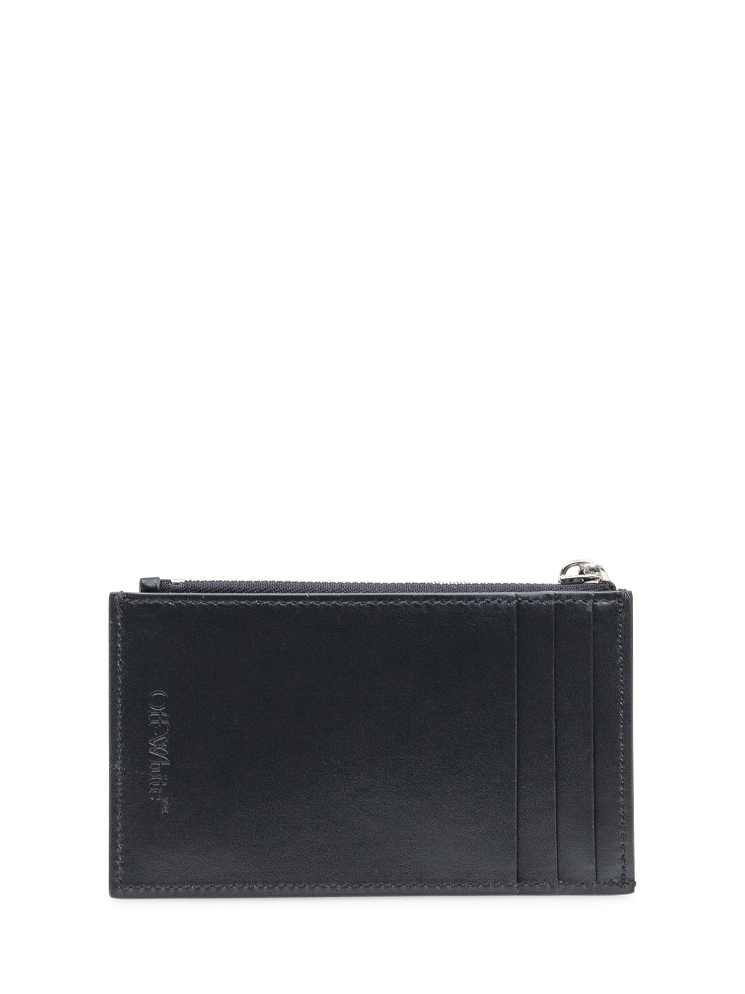 Portacarte Off-White in pelle nera con stampa Cash Inside e logo Arrow frontale. Dotato di zip superiore e slot posteriori per carte.