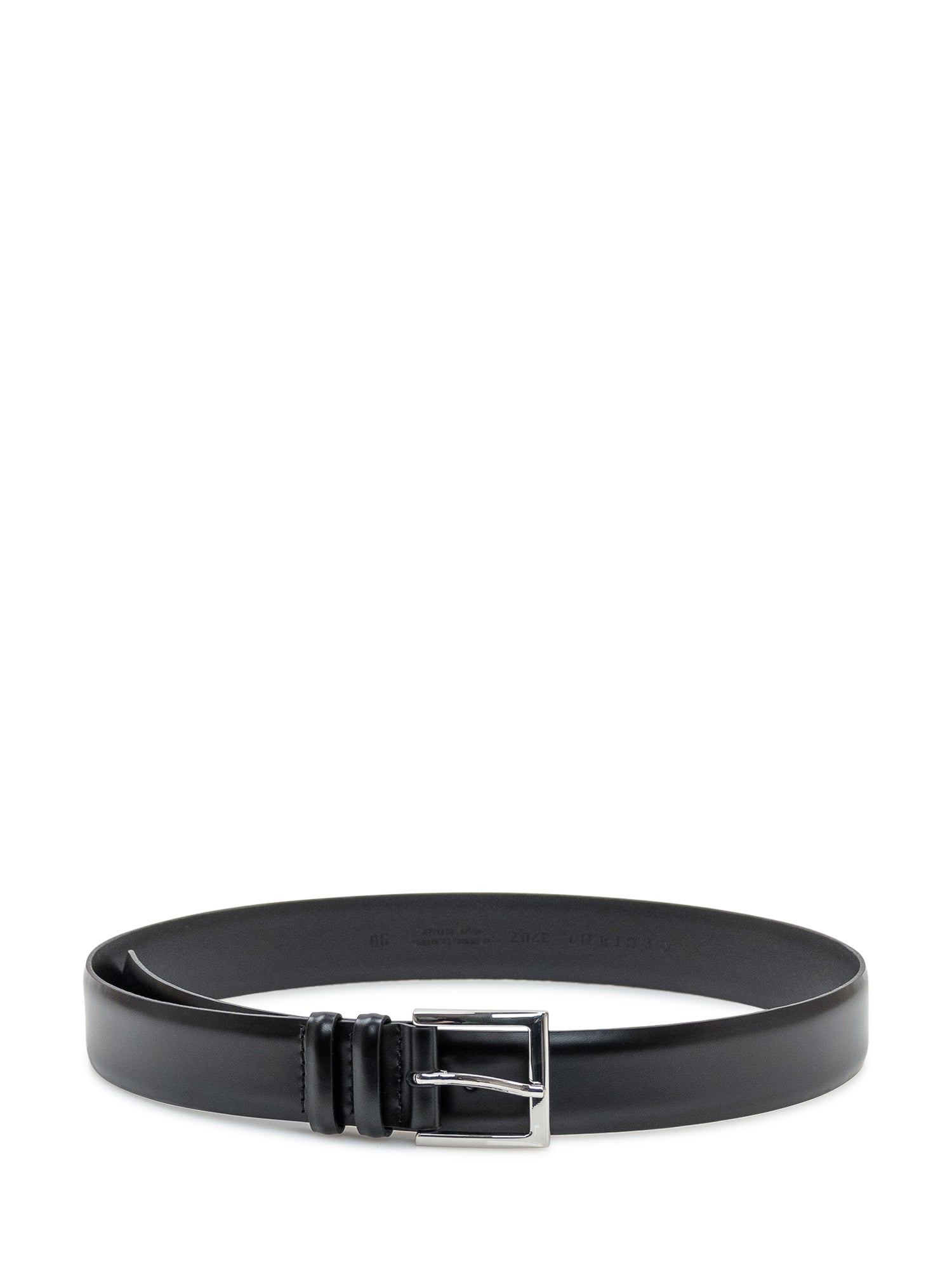 Cintura Orciani in pelle liscia nera con fibbia rettangolare in metallo lucido. Un accessorio senza tempo che unisce eleganza e versatilità.