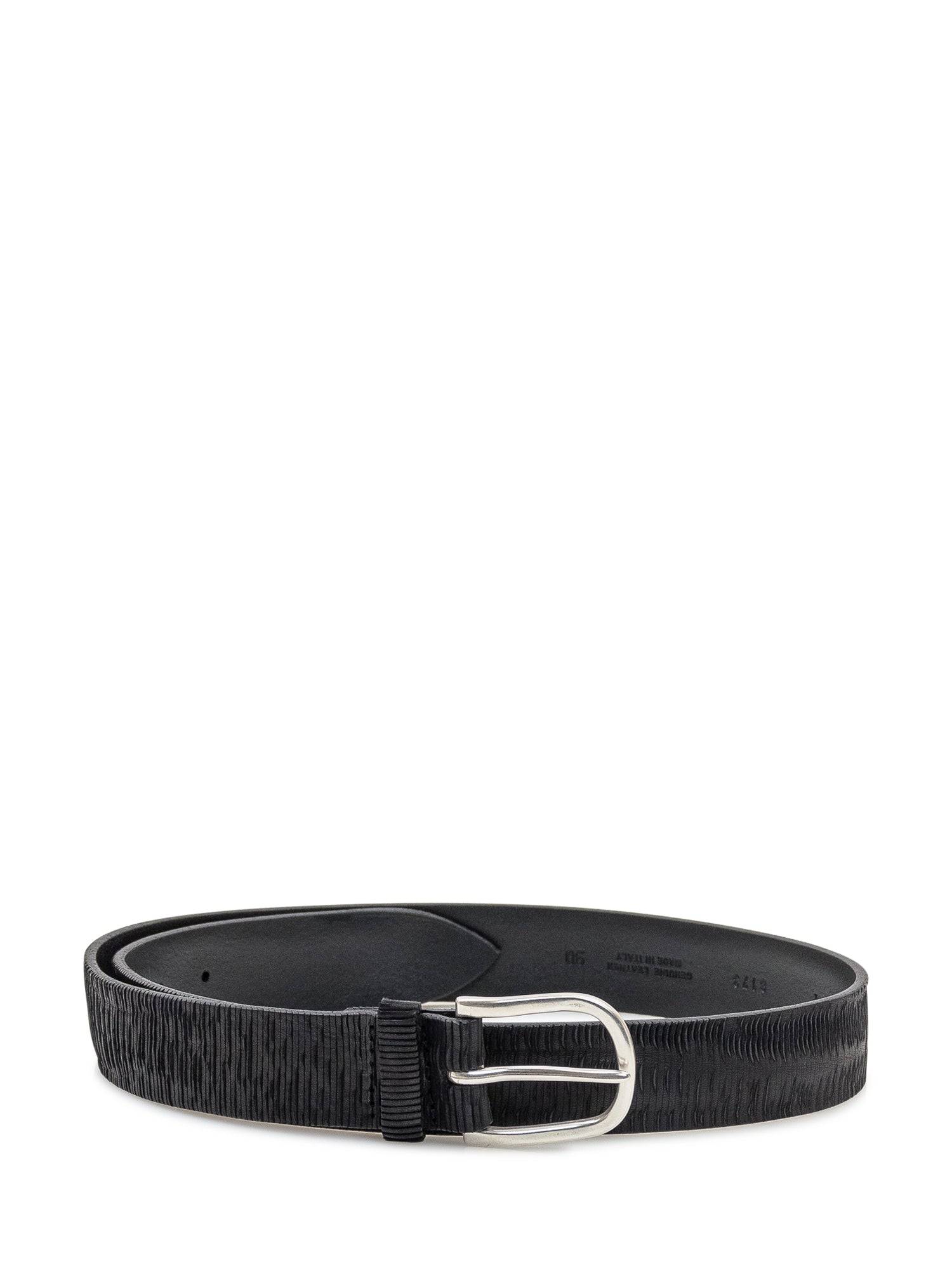 Cintura Orciani in pelle nera con finitura testurizzata e fibbia in metallo argentato.