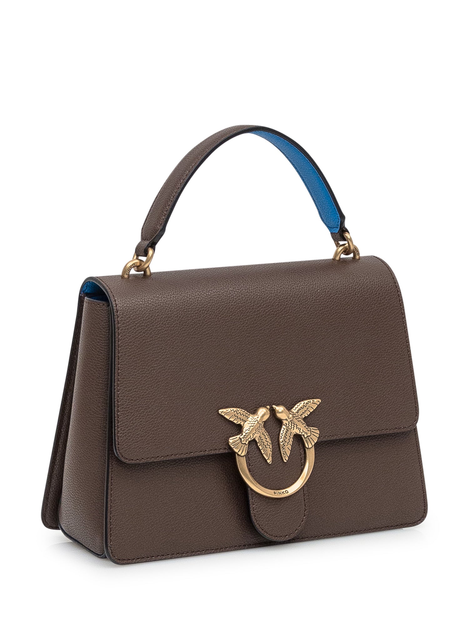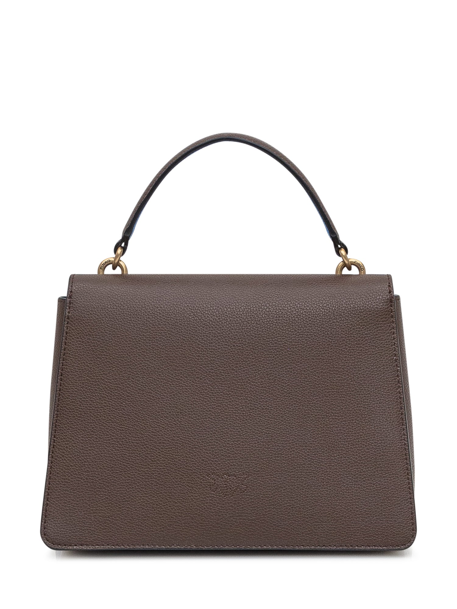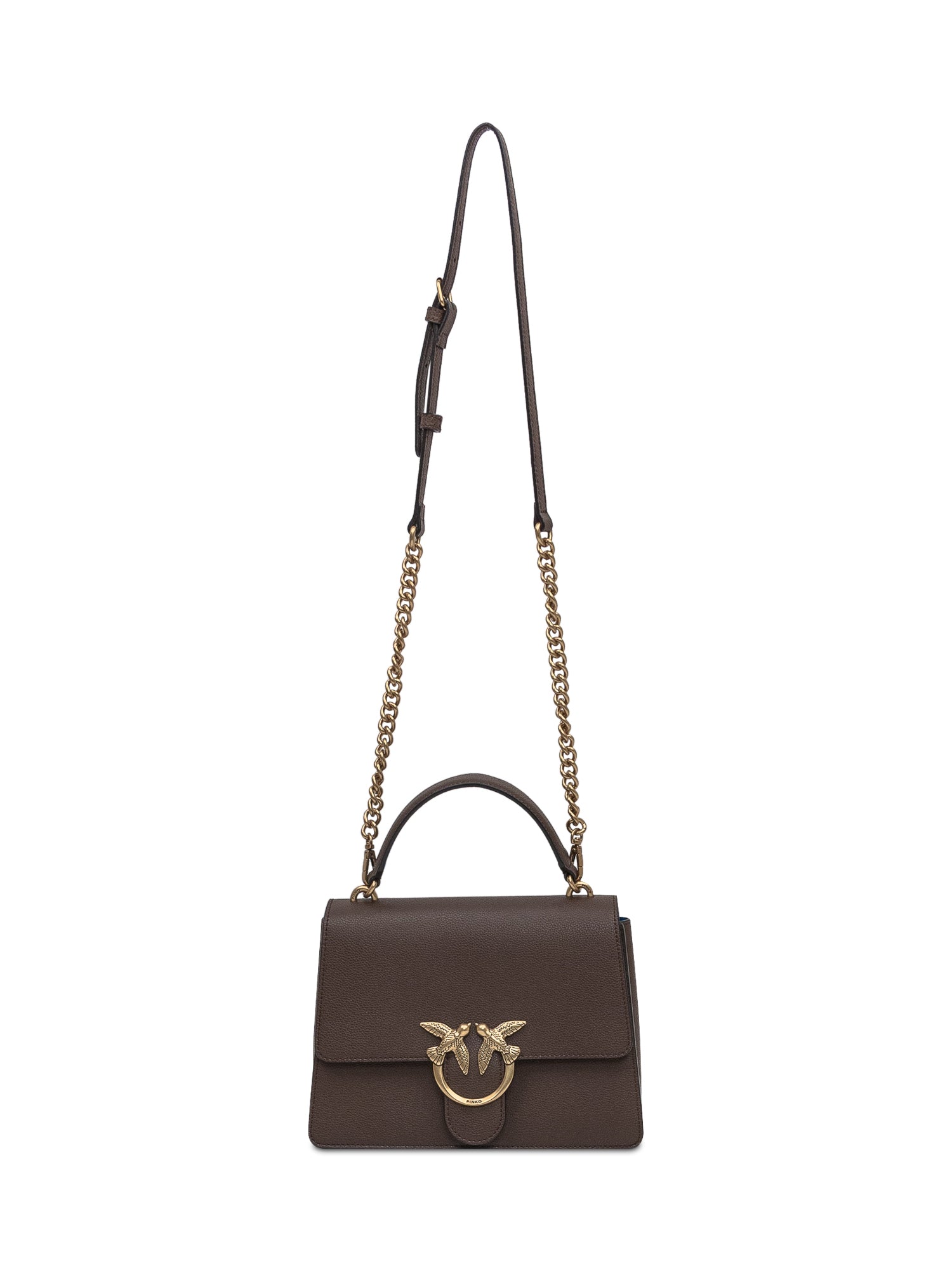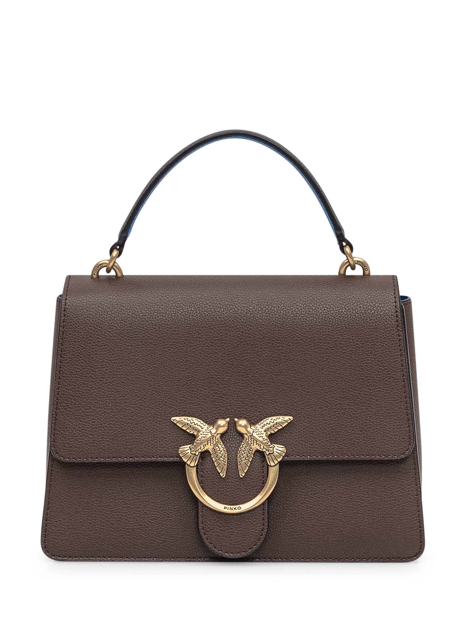 Borsa a mano Pinko in pelle marrone con iconica chiusura Love Birds dorata.
