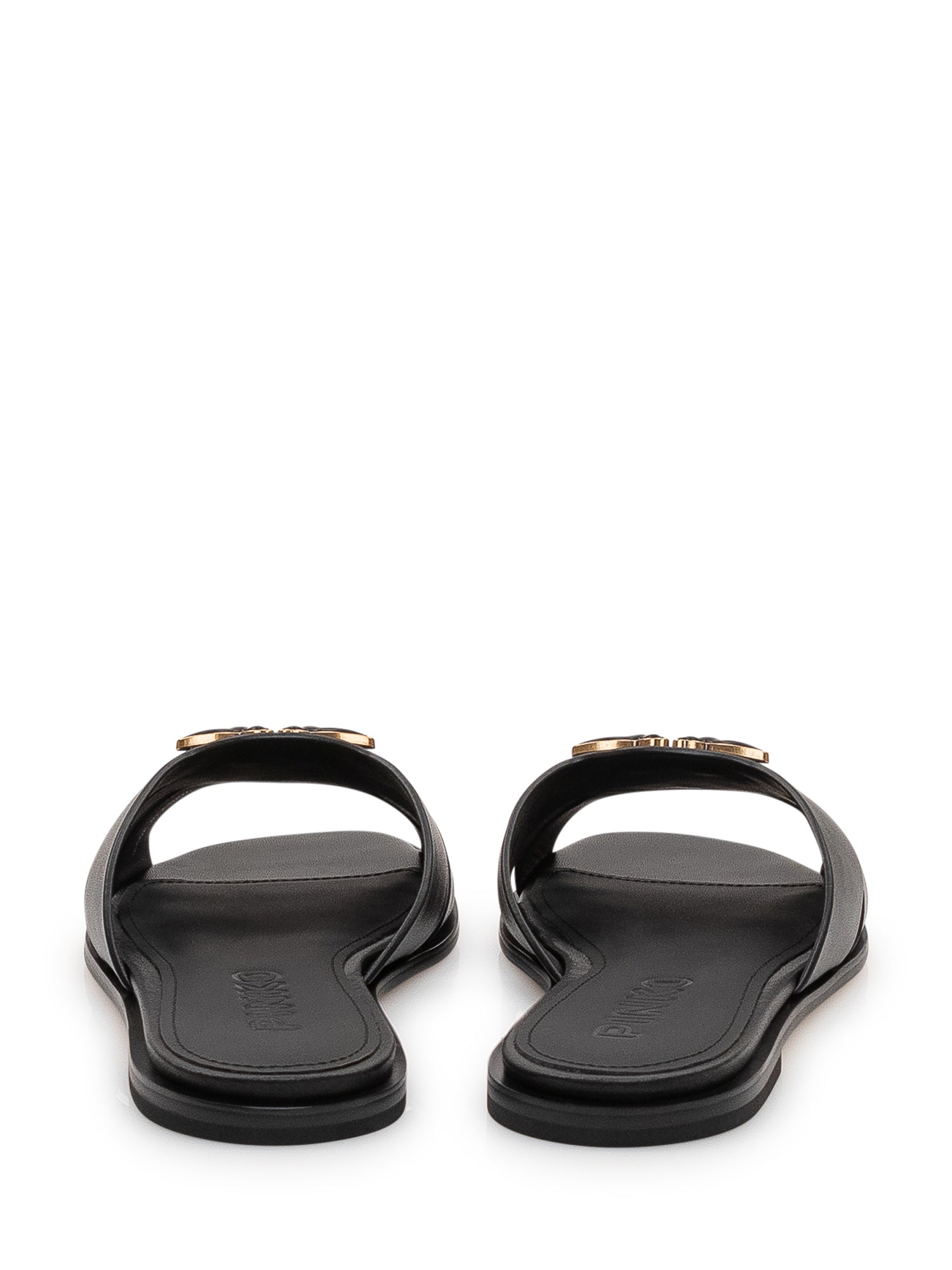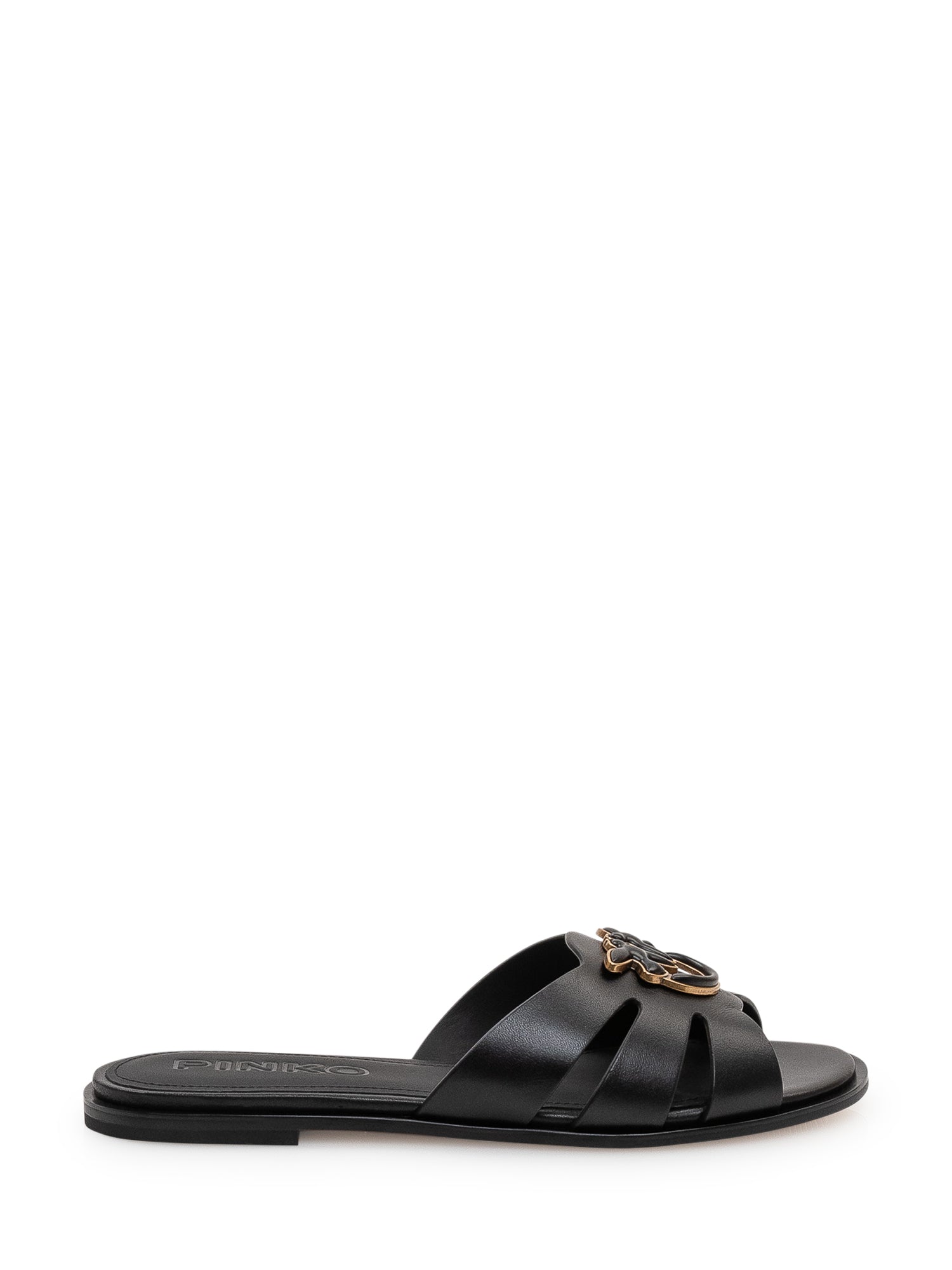 Ciabatta flat in pelle con fascia larga dal design traforato e punta aperta. Modello impreziosito da dettaglio decorativo in metallo sulla tomaia, con suola bassa per un look elegante e contemporaneo.