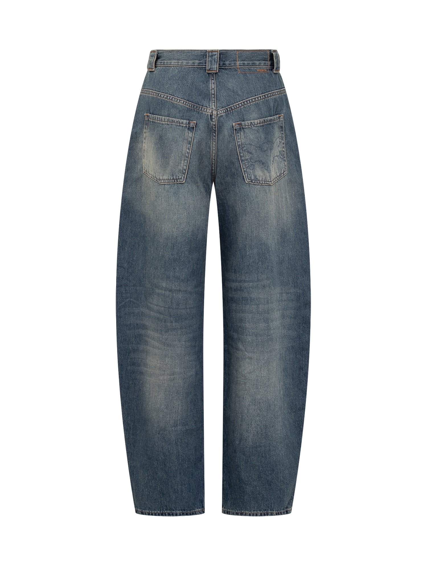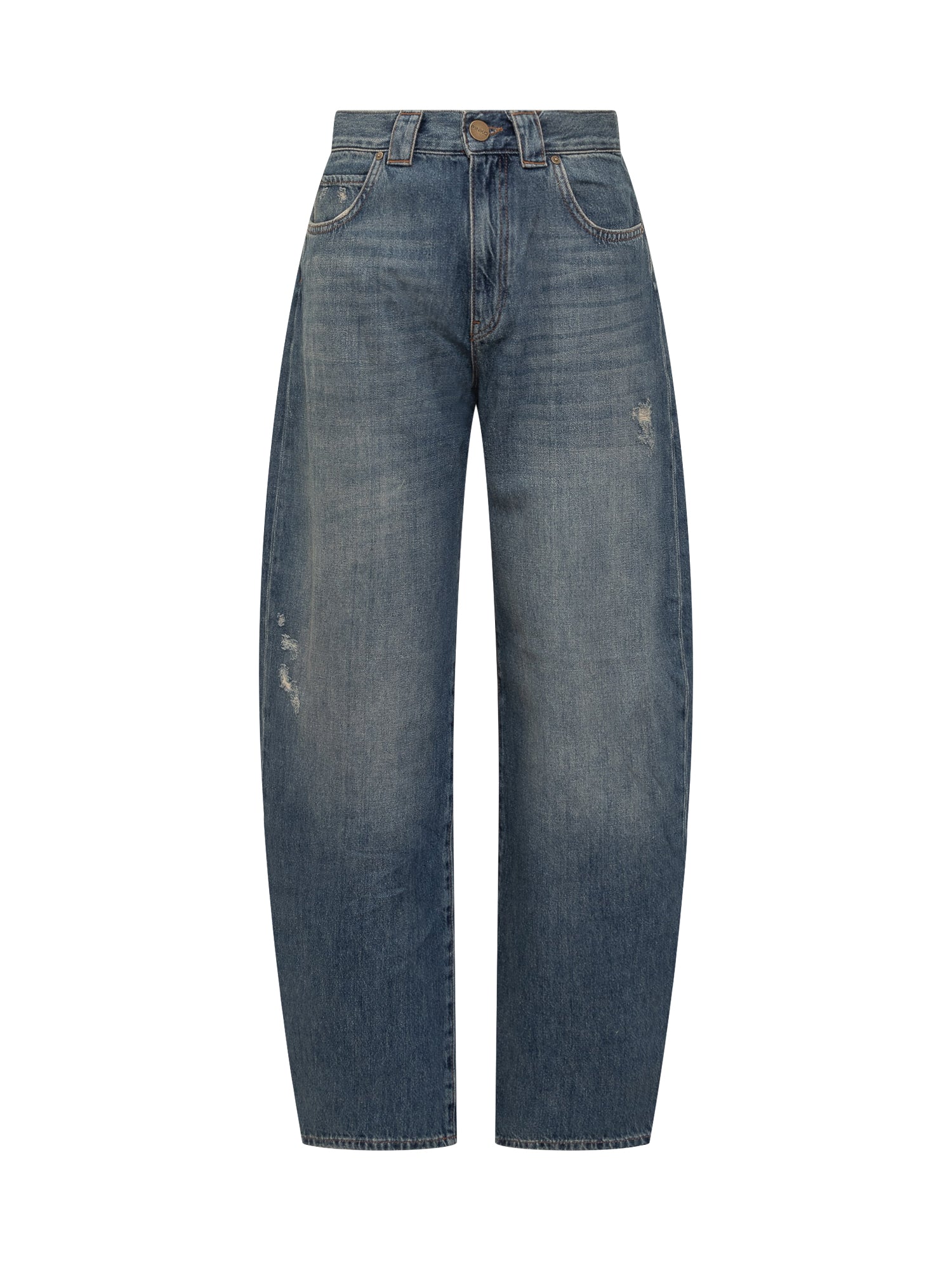 Jeans Pinko in denim blu con lavaggio vintage e lievi dettagli effetto vissuto. Modello a vita alta con chiusura con bottone e zip, gamba ampia.