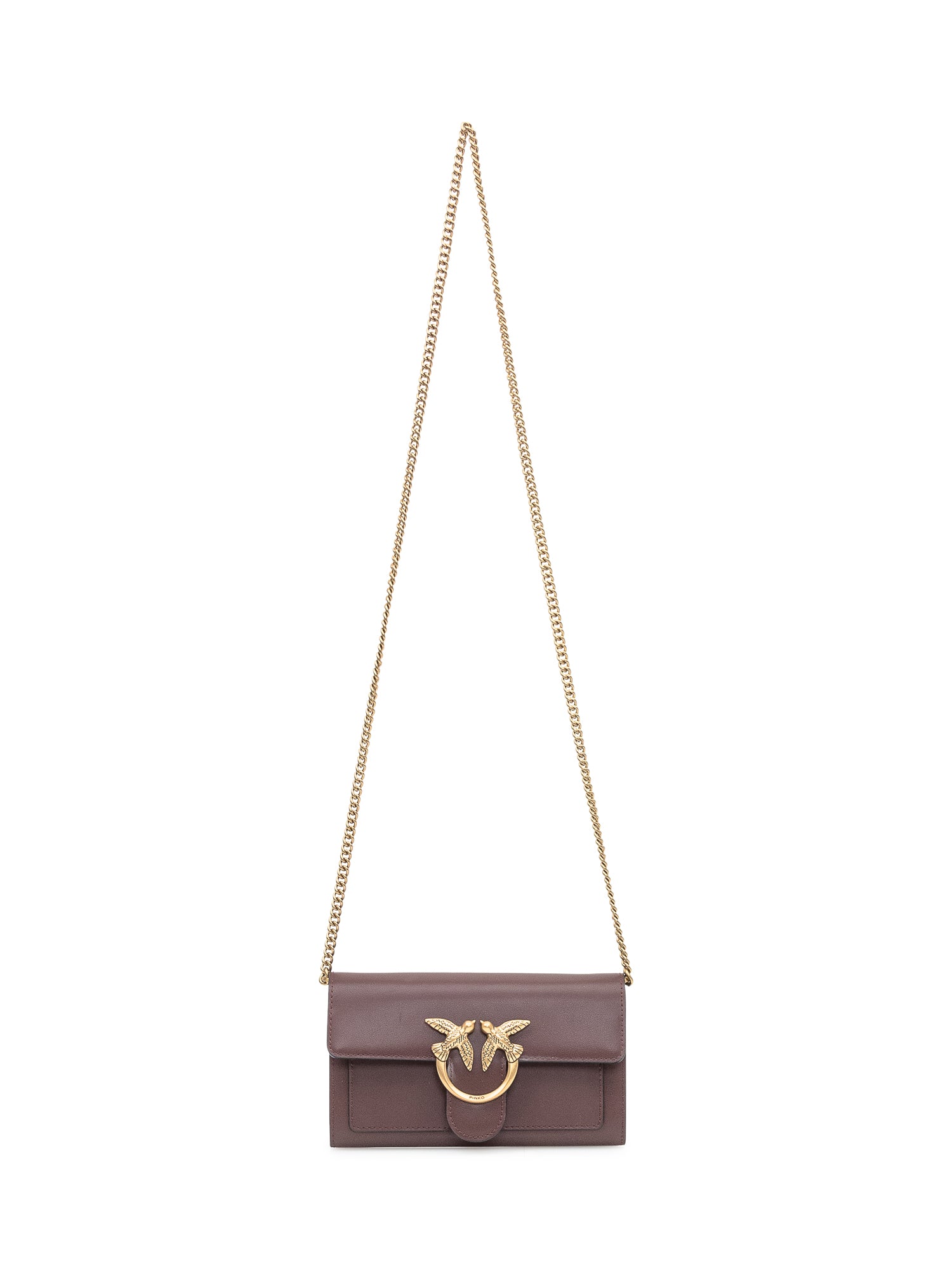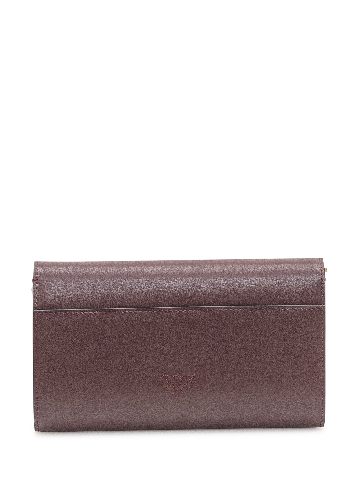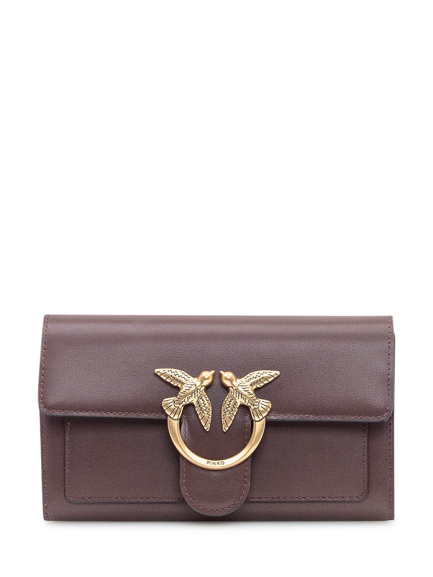 Portafoglio Pinko in pelle bordeaux con iconica chiusura Love Birds in metallo dorato.