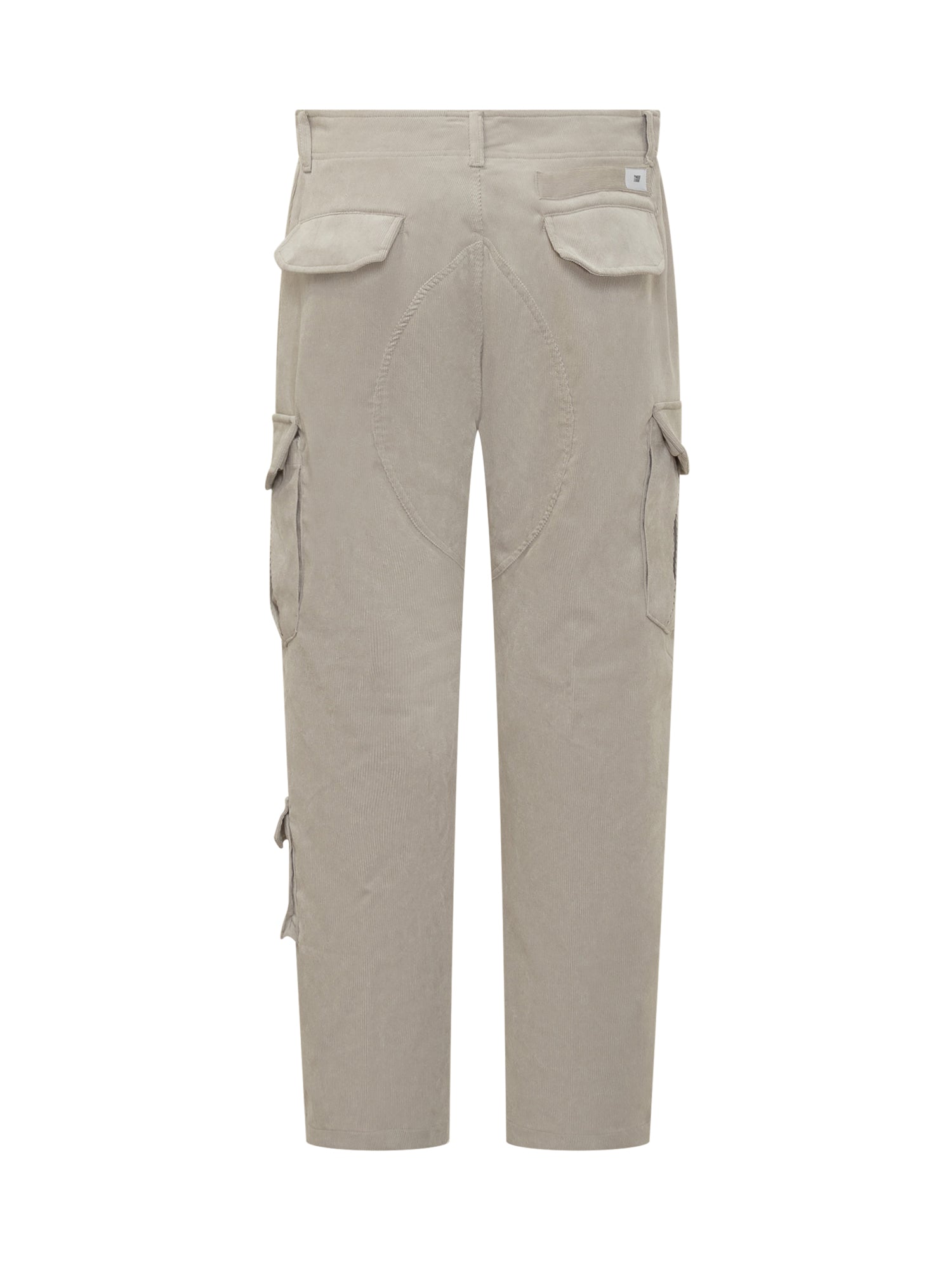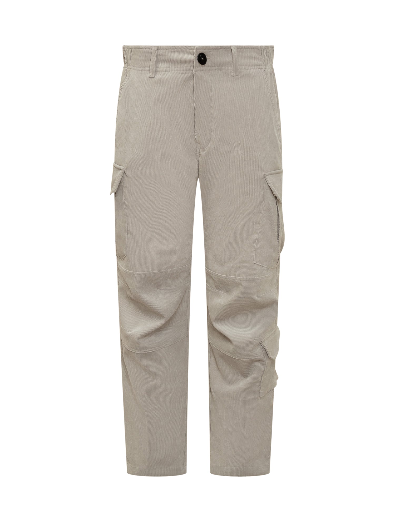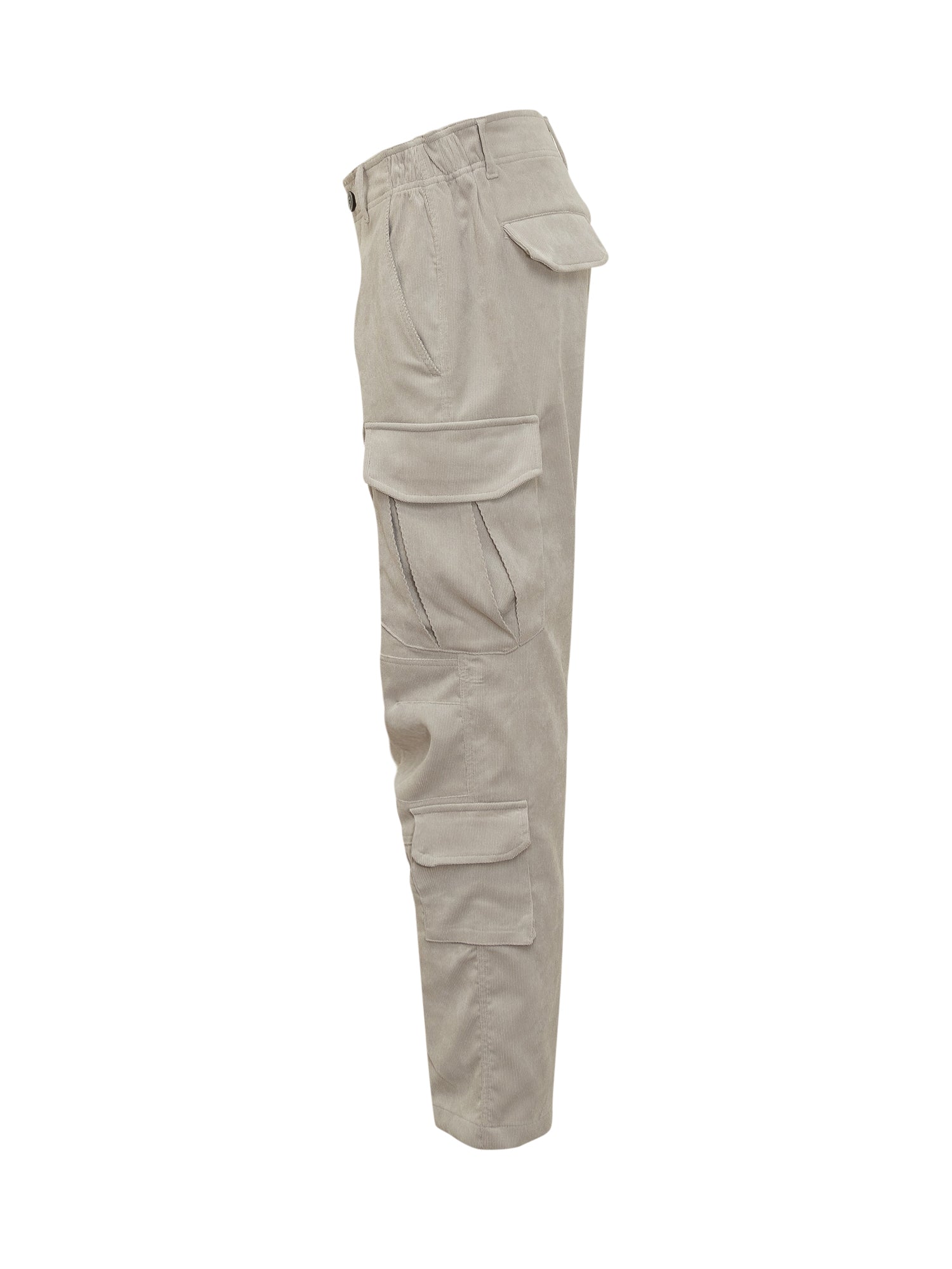 Pantaloni cargo P.M.D.S in velluto beige con tasconi laterali, chiusura con bottone e zip, e vita regolare.