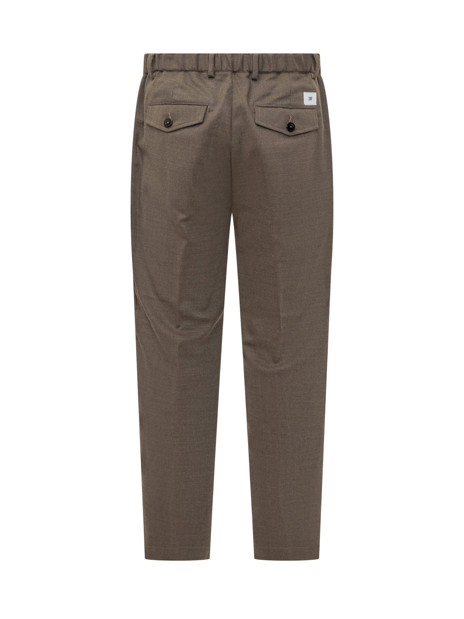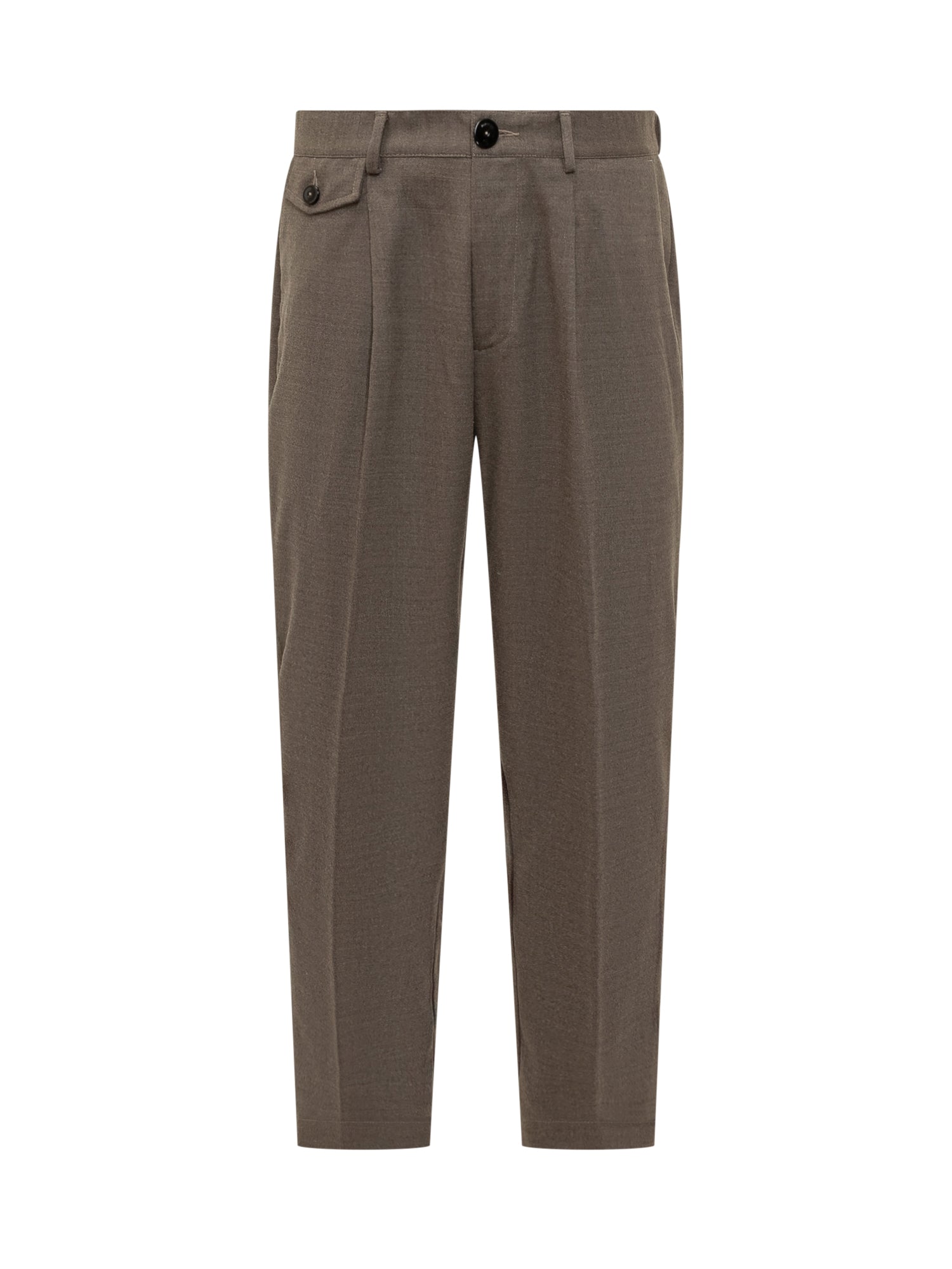 Pantaloni PMDS in cotone marrone con pinces frontali, taschino con patta e chiusura con zip e bottone.