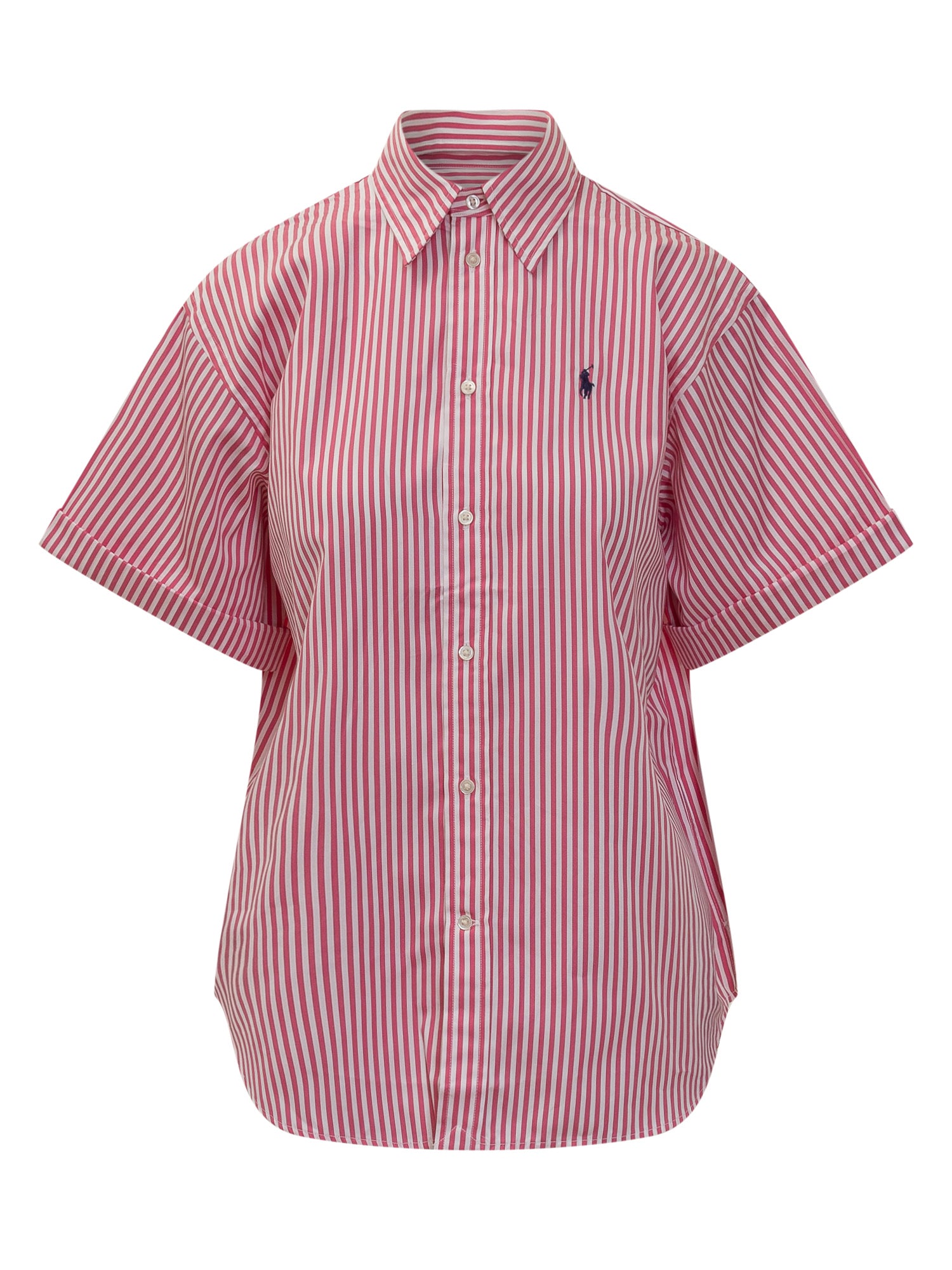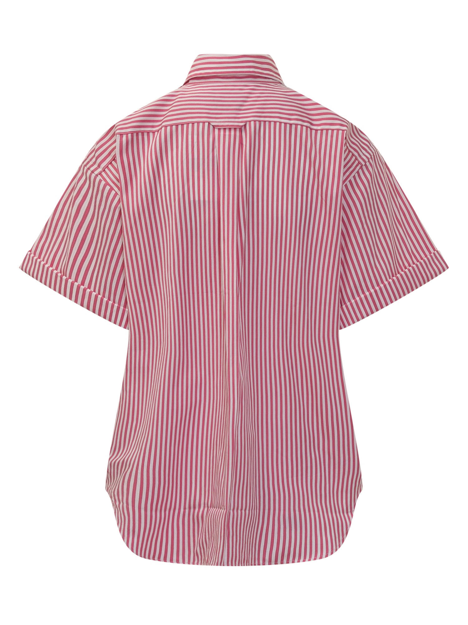 Camicia a righe bianco e rosso. Chiusura con bottoni. Spalla scesa. Vestibilità ampia.