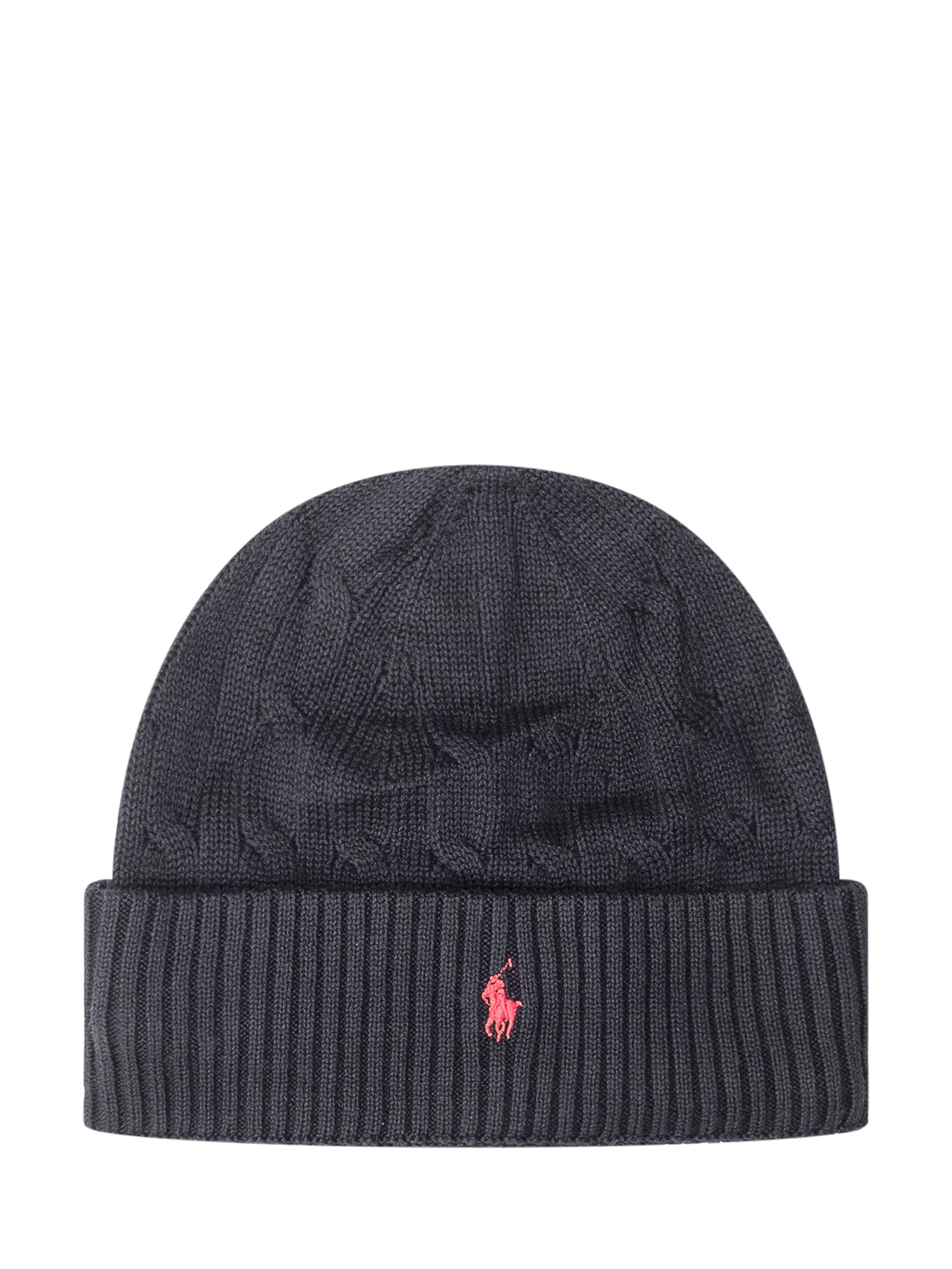 Cappello Polo Ralph Lauren in maglia nera con lavorazione a trecce e logo rosso ricamato.